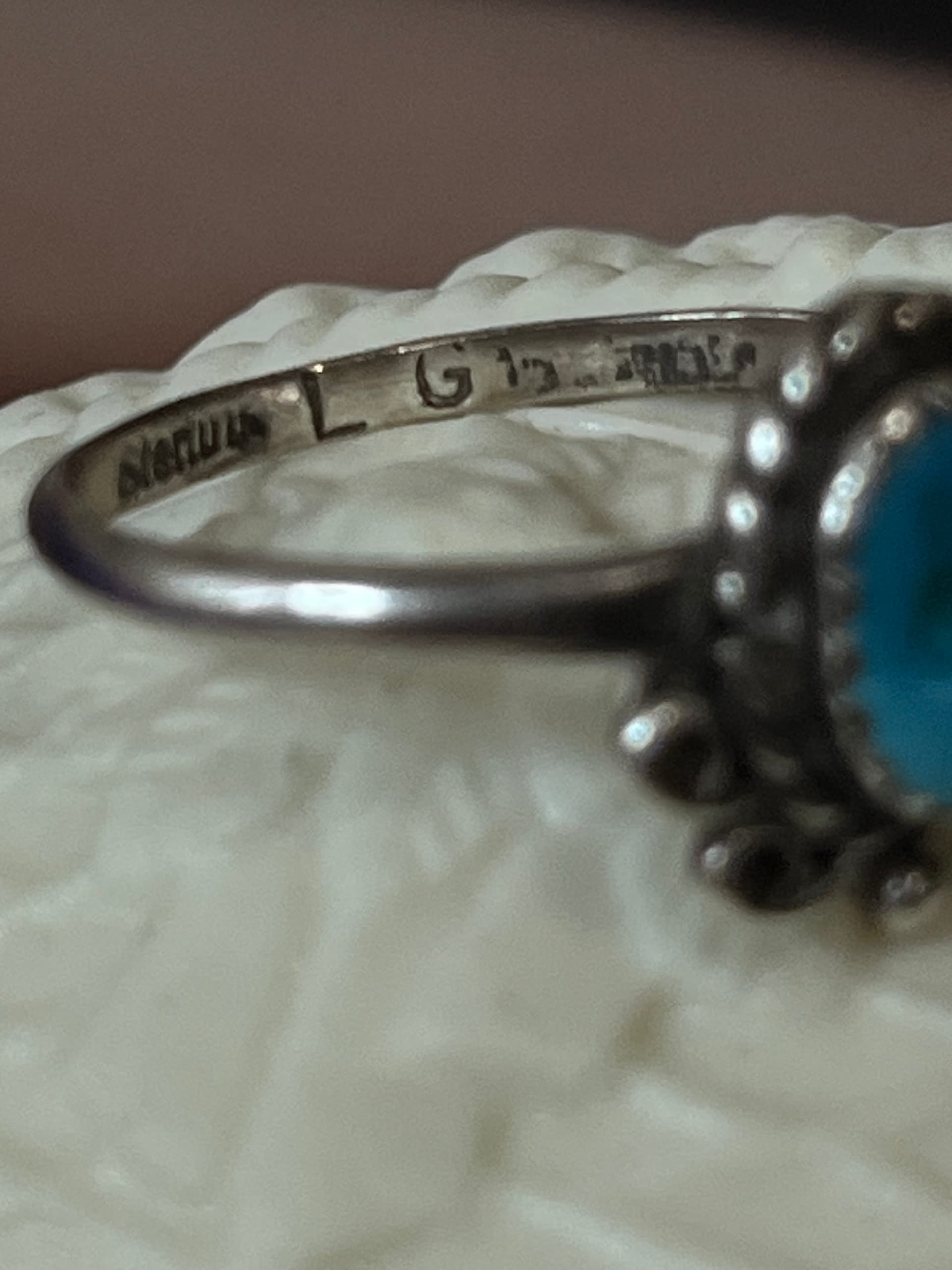 Actually it is signed, that LG is a hallmark, but the difficulty is whether you can find out who that belongs to. I couldn’t find it with a very quick look. As far as the turquoise, the stone is so small it would be really hard to make much of a guess as to what mine it came from. And also without actual provenance you can’t really say for sure. People often think you can figure out what mine a piece of turquoise came from just by looking at it, however that’s really far from reality (except for some experts who work with it day in and day out, and even then they are usually very cautious), because turquoise from any mine can have completely different looks. We have fun guessing on here, but you need to know that it’s just educated guessing for most of us.