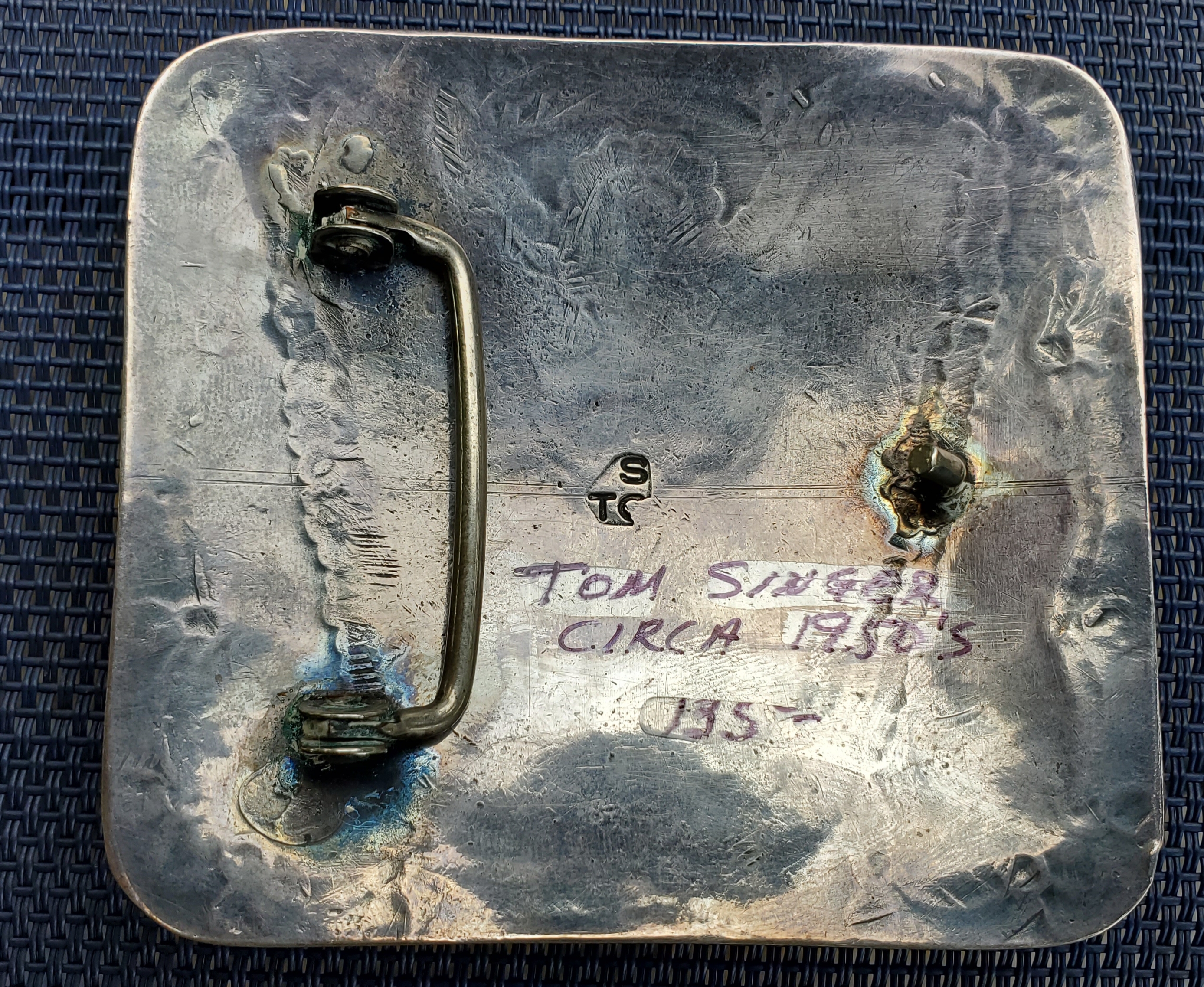 Nice buckle. I wouldn’t say this is 50’s; Chip inlay wasn’t invented until the mid/late 1960’s. It’s my understanding that this particular Tommy Singer mark was used in the 70’s for the most part; I would say this is a late 1970’s buckle. Whoever owned it took good care of it. I’m having a hard time telling the approximate size of the buckle, but I would want no less than $250 for it in my shop