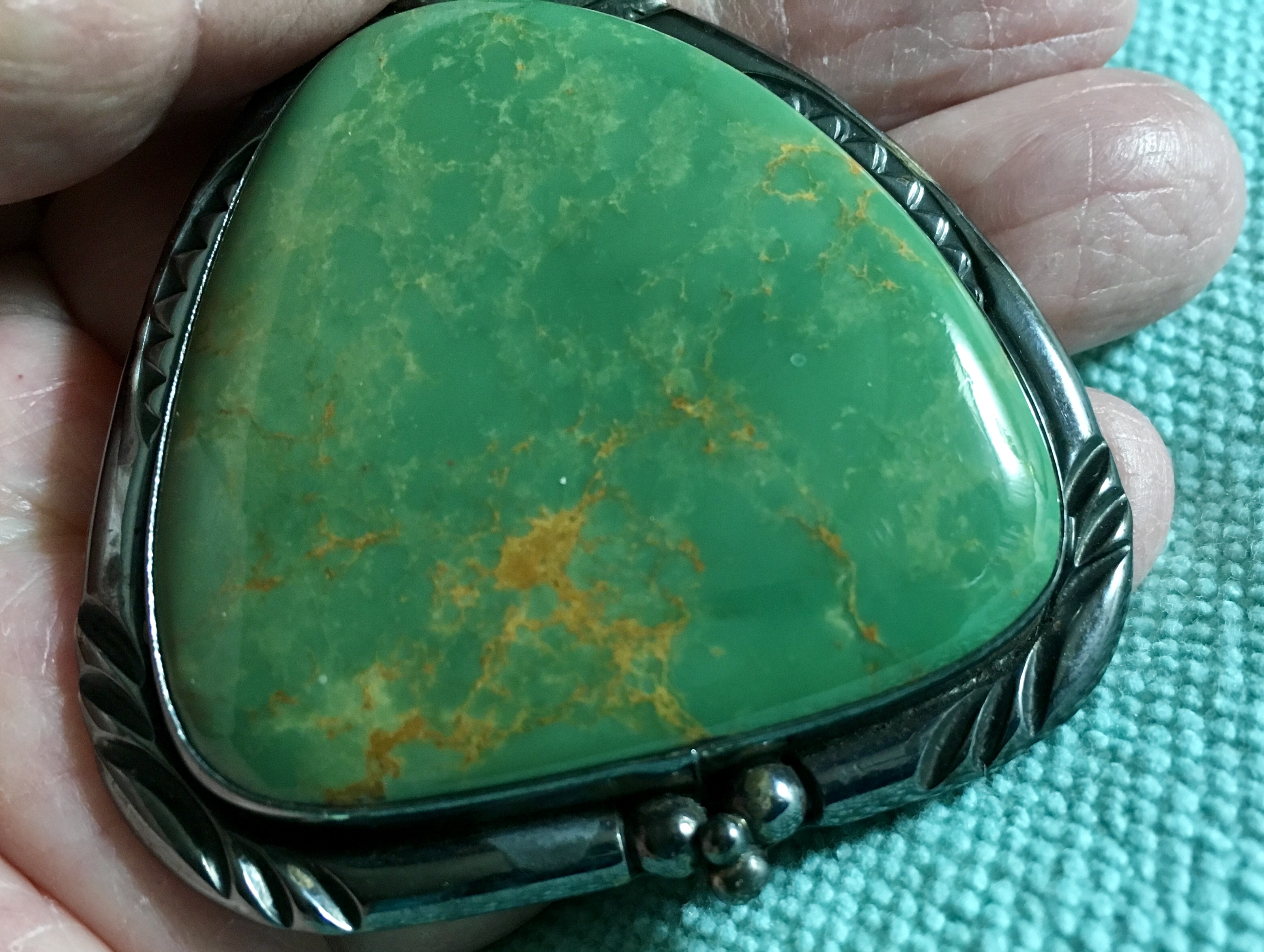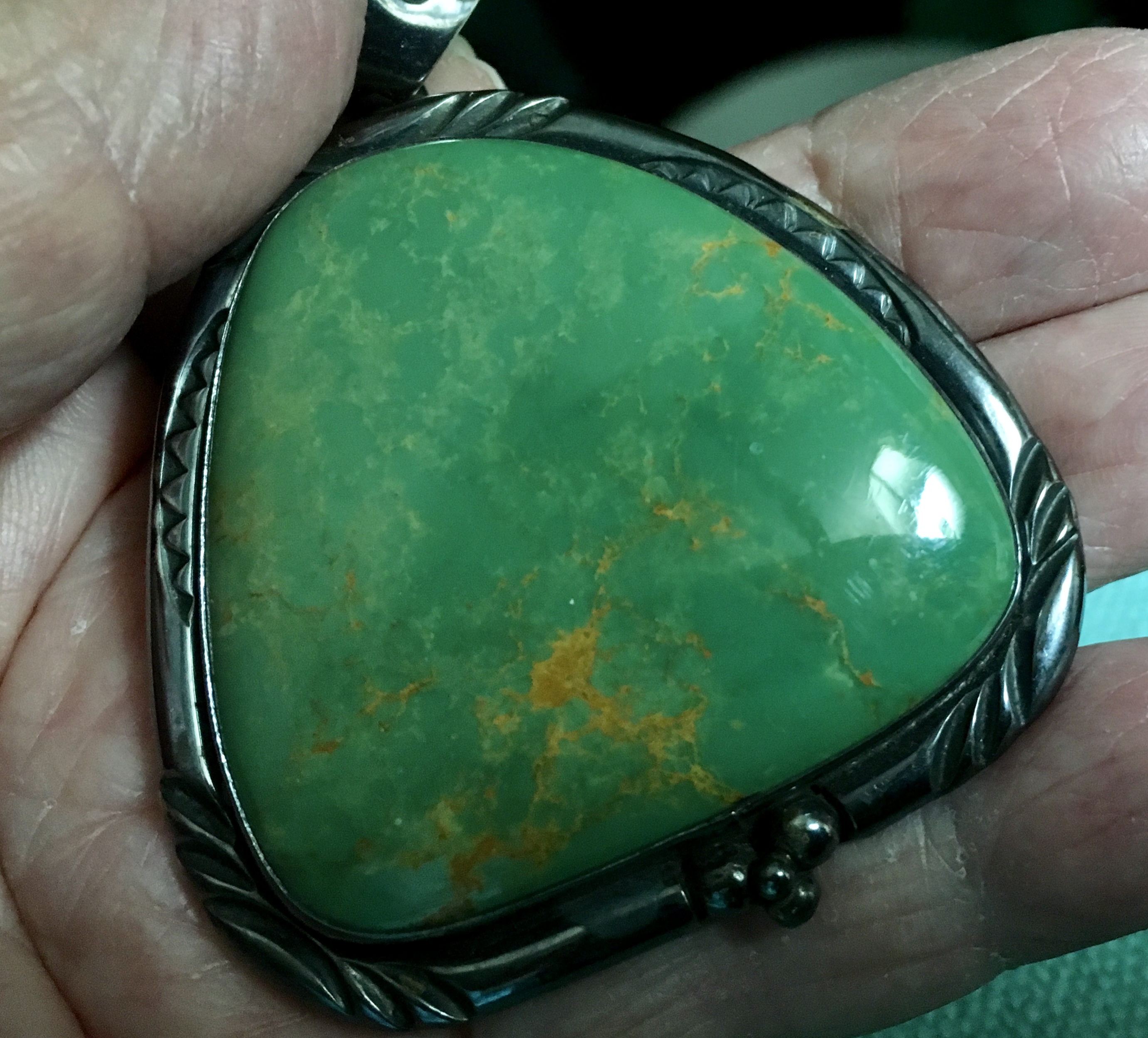 Came across this stached in a drawer while looking for something else. Ive had it for years but have rarely worn it. Never have known what type of turquoise but came across someone talking about Kings Manassas and it reminded me of this pendant. I have taken some pictures but it’s dark and raining here so they are by lamplight. I’d like to know whether you think it