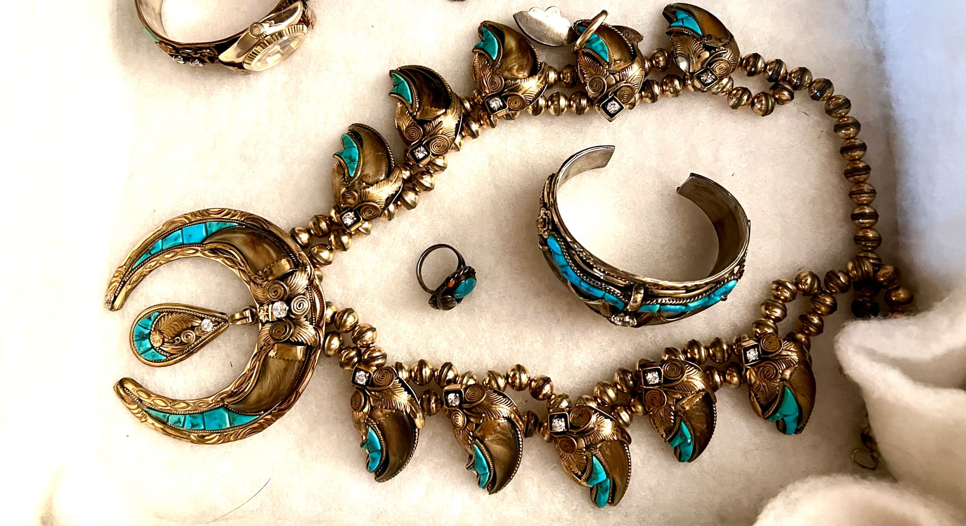 Last year I came by a squash blossom necklace and other pieces that had been forgotten in a jewelry store safety deposit box. I purchased it because of its uniqueness and artistry, but I do not know if its value or if it can be sold in Texas or New Mexico because of the bear claws. I believe the gold color of the necklace is electrum, a mixture of silver and gold alloys, and there are stones in it that resemble diamonds but could be something synthetic. The fact that it is vintage and has been locked away for years tells me it may be authentic and has value.I’m looking for any information on these pieces.