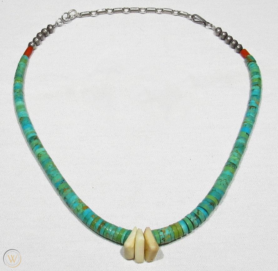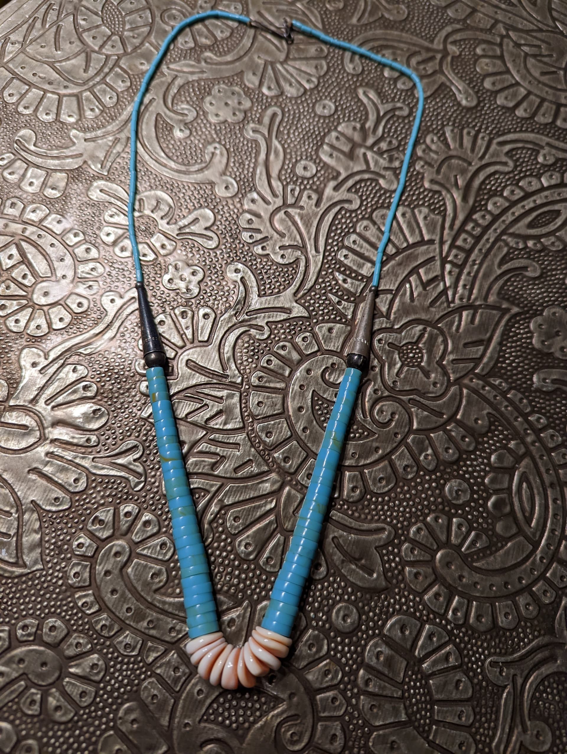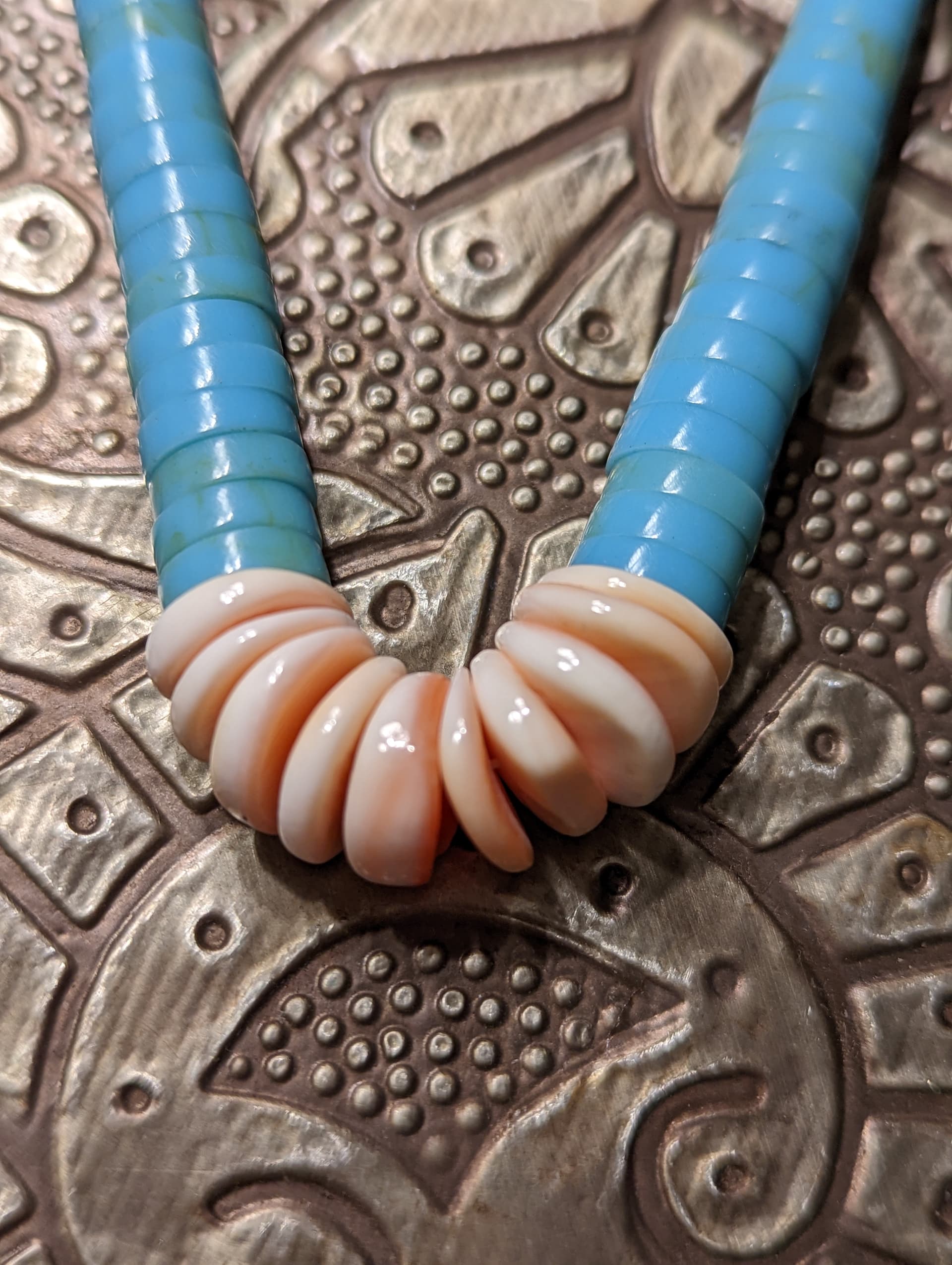 @Christy Thanks for posting, it initiated an interesting, but confusing discussion. Your necklace is definitely in the Santo Domingo (Kewa) style, but the light coral color beads do not appear to be coral, they appear to be shell (Spiney Oyster) which is typically used in these Jacla style necklace. It would be gorgeous worn on black. See the Jacla style turquoise choker attached: