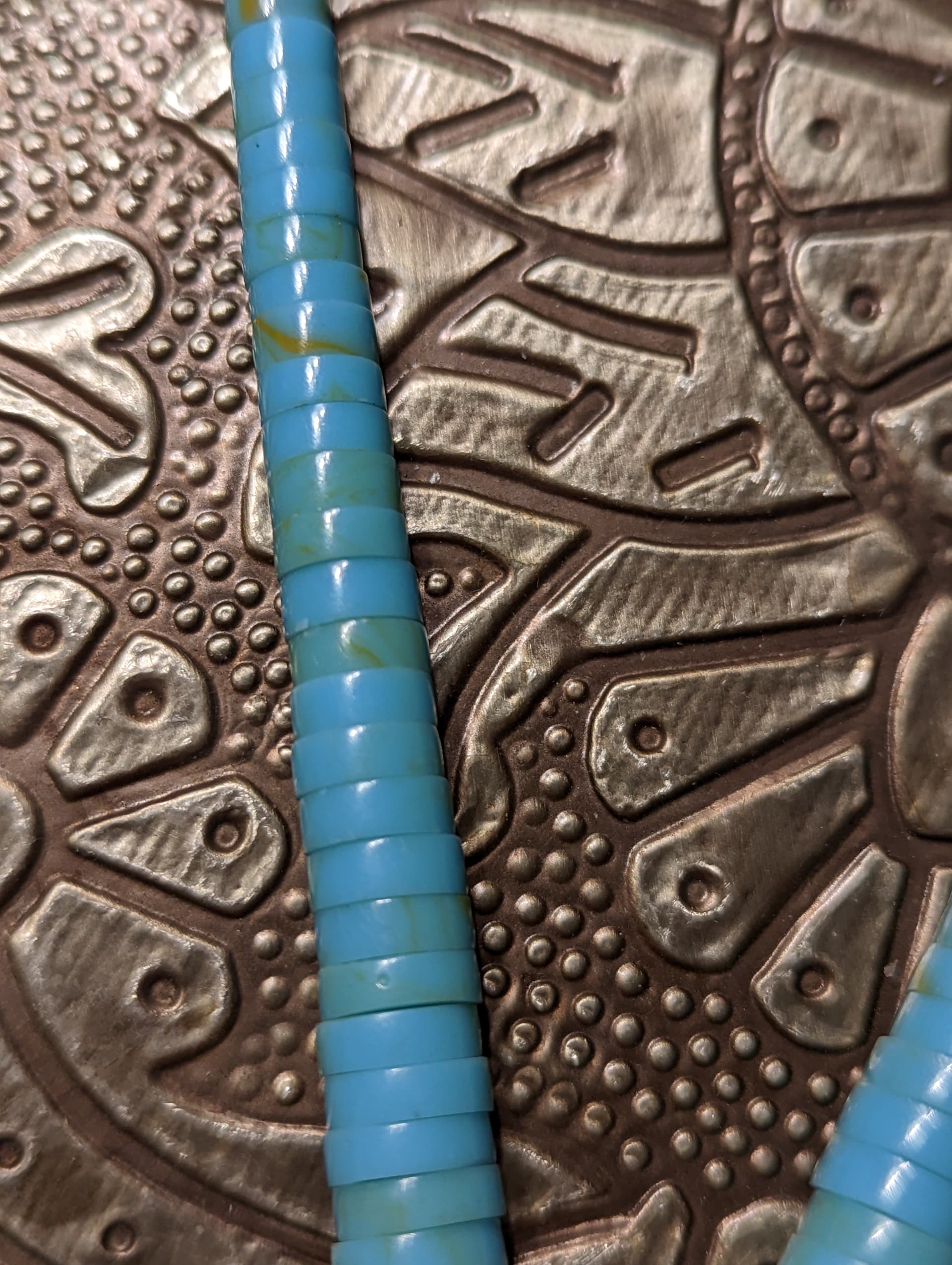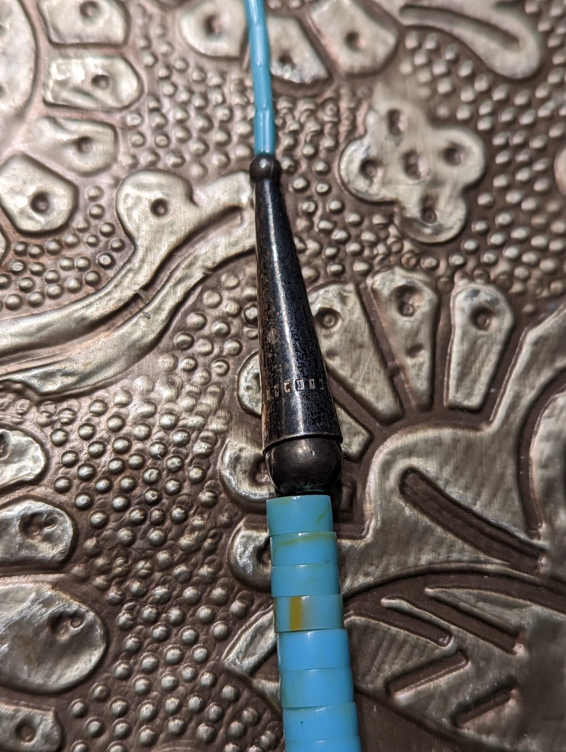 So I’m not very familiar with block turquoise and exactly what it looks like (except what I have seen in pics). There’s also something called reconstituted turquoise, and I wonder if that would still have some of the properties of turquoise, like copper, in it. It’s interesting that they put the testing results, but didn’t say what was tested. I have not seen these style necklaces with the silver cones down in the middle; often there are silver cylinders or other things, but not the cones, those are usually at the top.