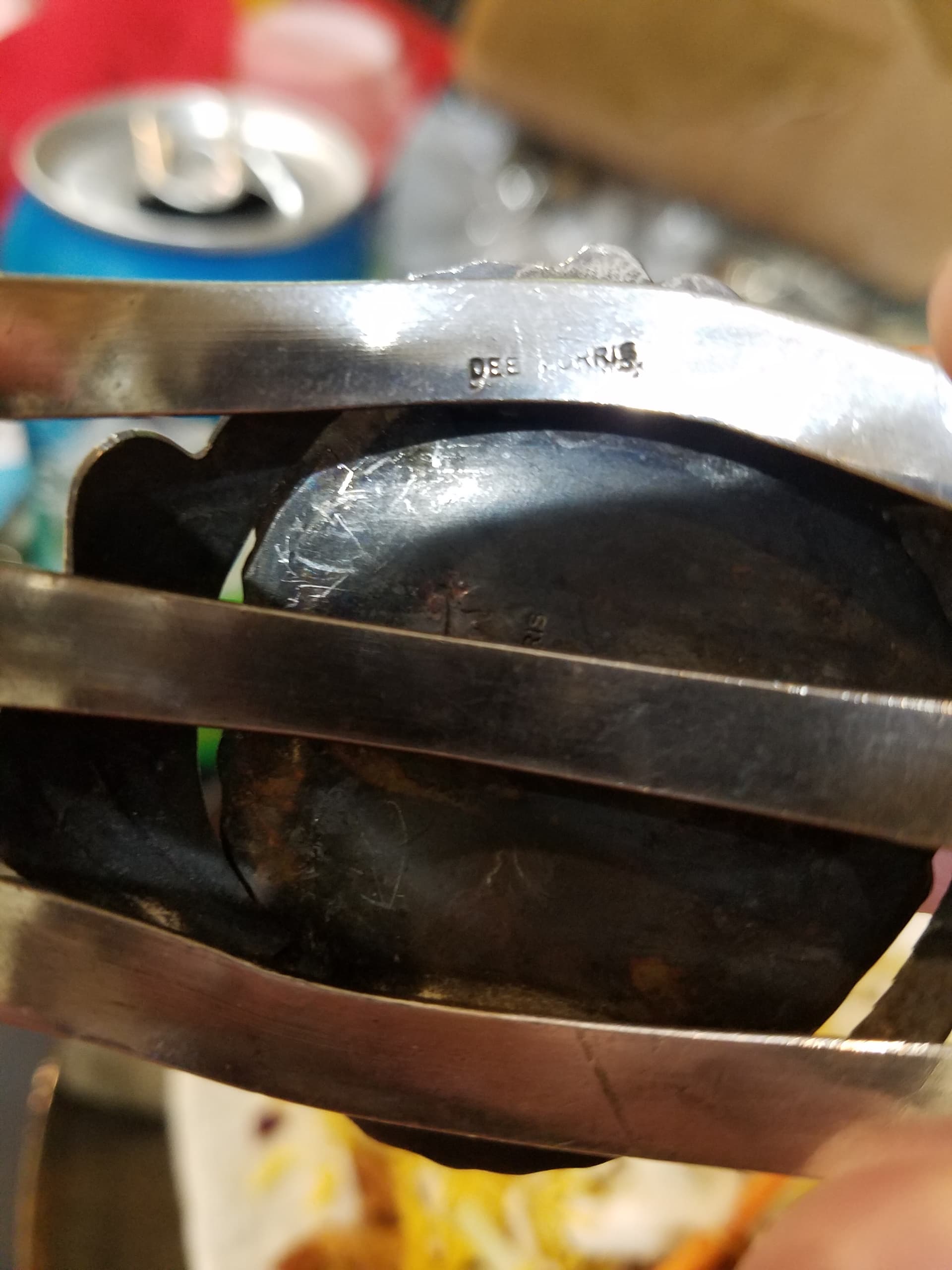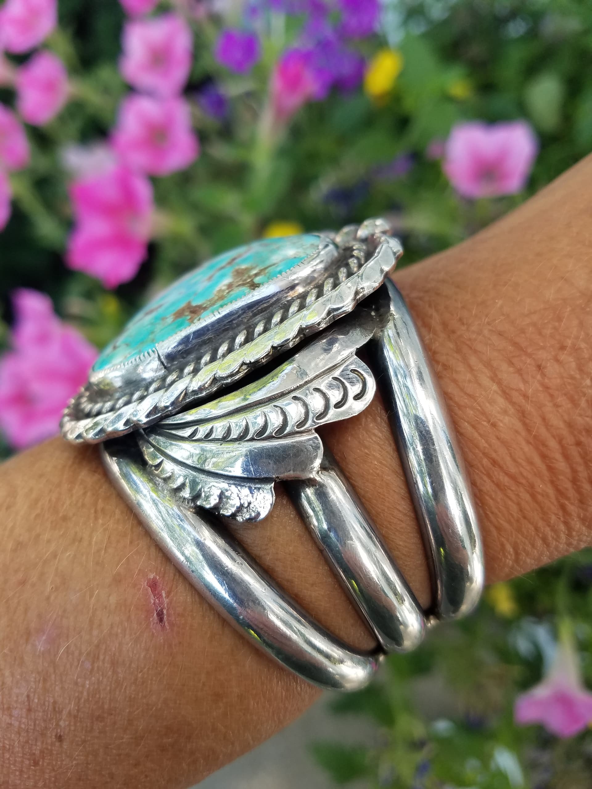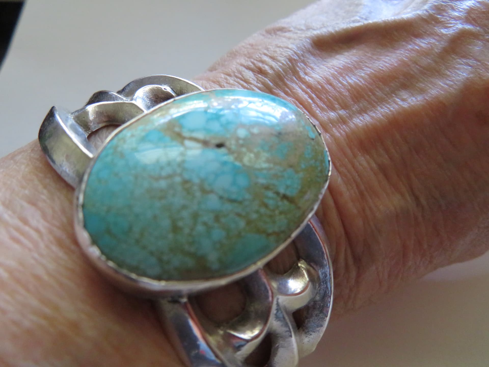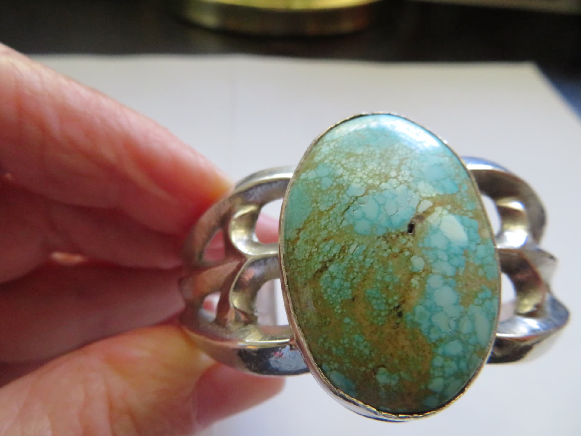 Thank you so much @markyboy57 , @chicfarmer , and @TAH for the info! I never expected that!!! Makes you wonder how a piece like that ends up at a Midwest flea market. It was found in the fouth hour too…the gap was only 1/2" and the piece fits about a 6.25" wrist, so I don’t think anyone could get it on, including me. It called to me and it literally said to me “Don’t let me go.” So I pondered a bit and said to the seller, “If I could get the gap to 1” wide I’d know then if it would fit." The seller strong armed it open as I watched in horror! But I was able to get it on. I’ve never seen turquoise quite like it. I’m hoping someone out there might be able to ID it.