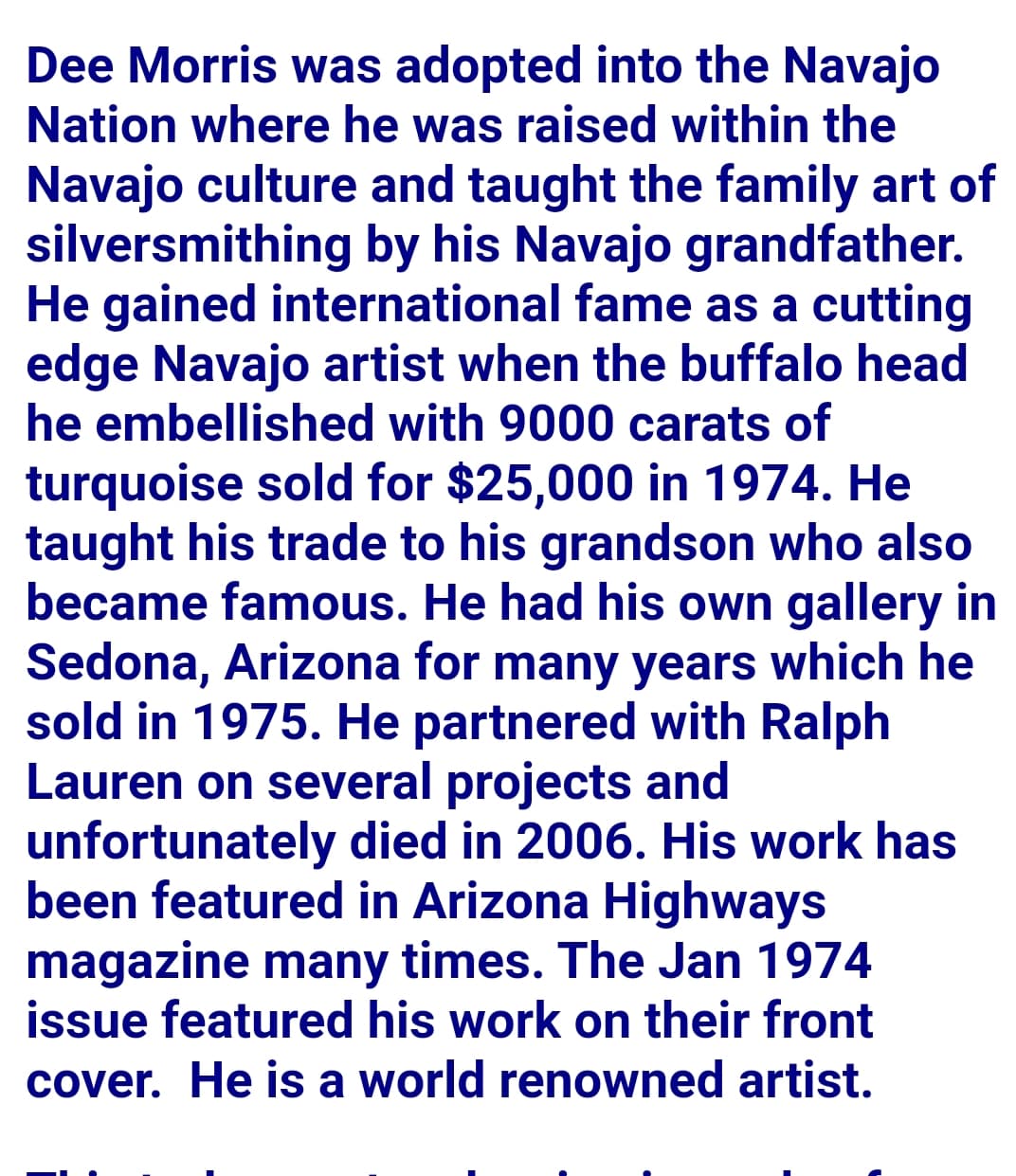 Dee Morris, 1941 - 2006, is an Anglo but raised by his Navajo adoptive parents. He excelled in just about everything he learned and was taught. He fashioned his jewelry in classic Navajo methods and styles. He is most recognized for his 1976 turquoise encrusted Bison skull that sold back then for $24k. A staggering amount especially for the 70s.