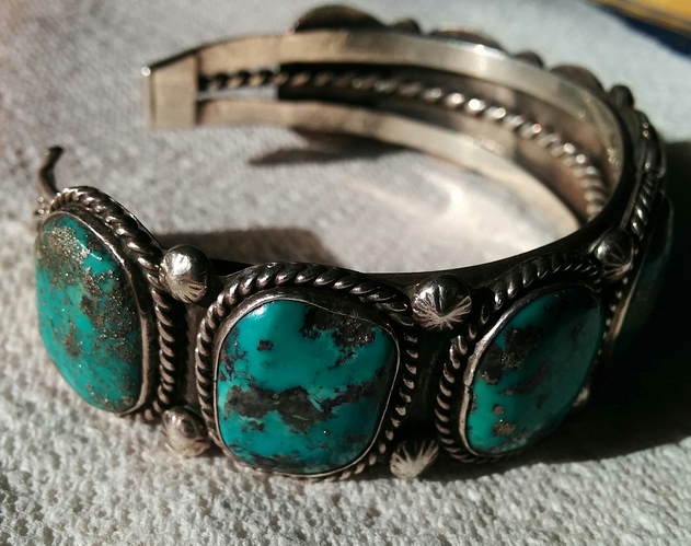 Hello, beautiful pieces of jewelry. The ring is made by a Navajo silversmith Herman Hoskie, it is two small h on top of each other. Depending on the age of the ring, it looks newer, I would go with Turquoise Mountain. The bracelet has Morenci Turquoise, but I am not sure who the mark belongs to. Thank you for sharing.