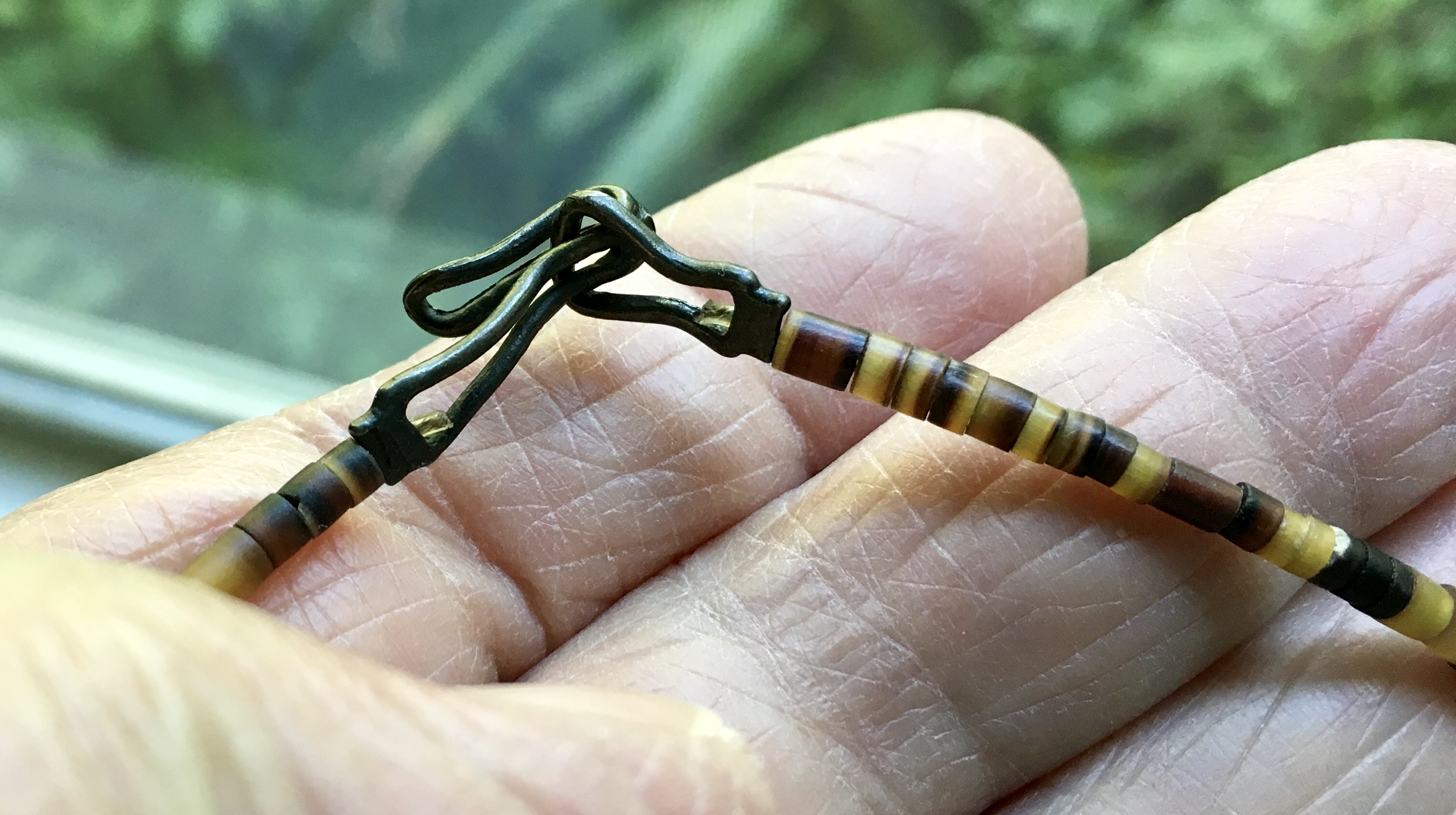 The necklace is about 19” long and weighs 40 grams. It’s strung on plastic coated wire.