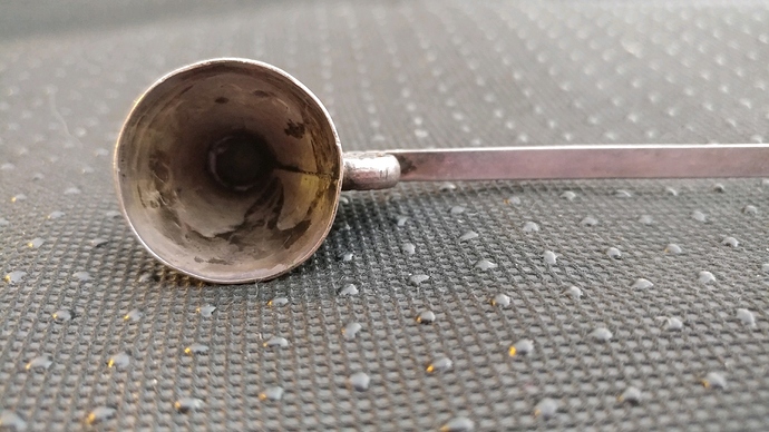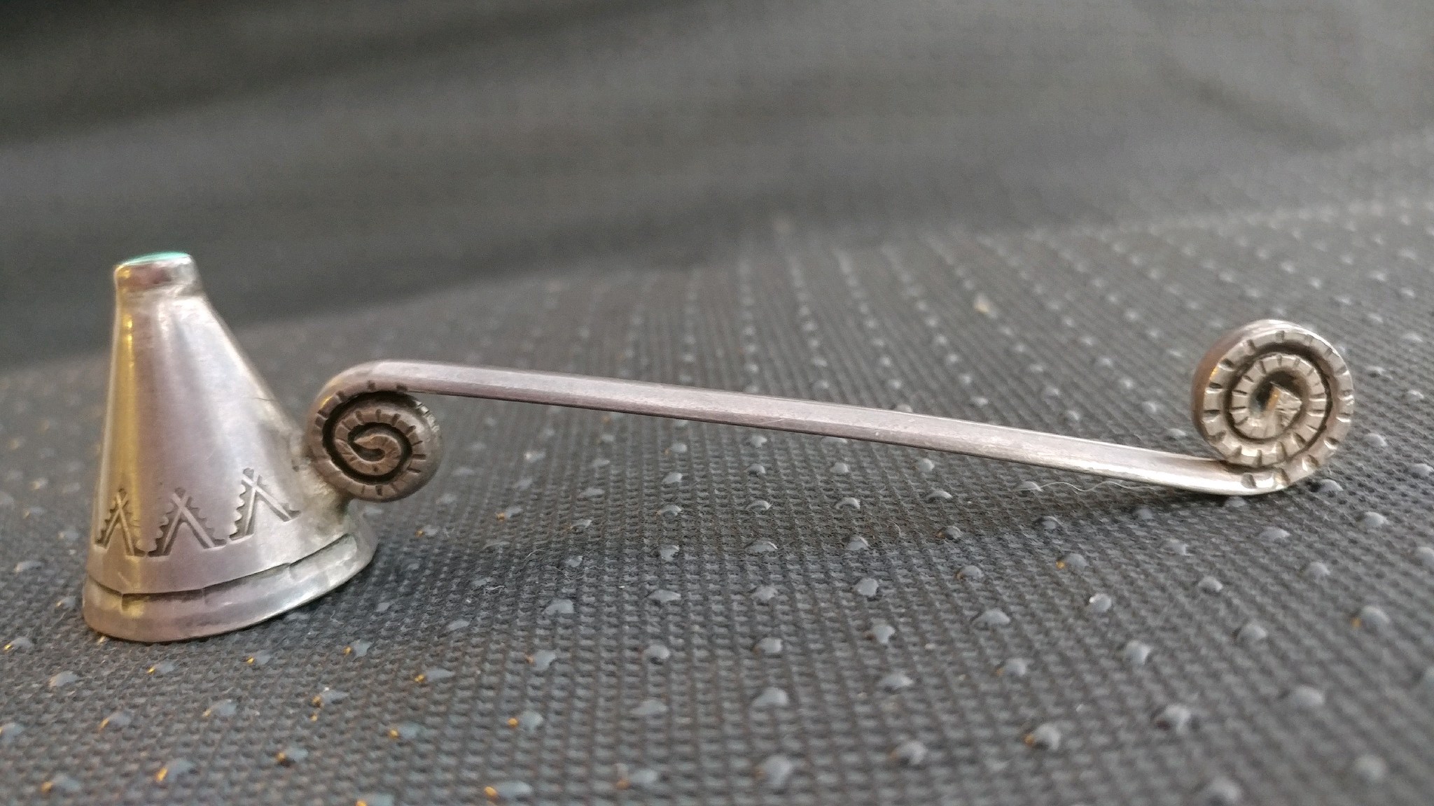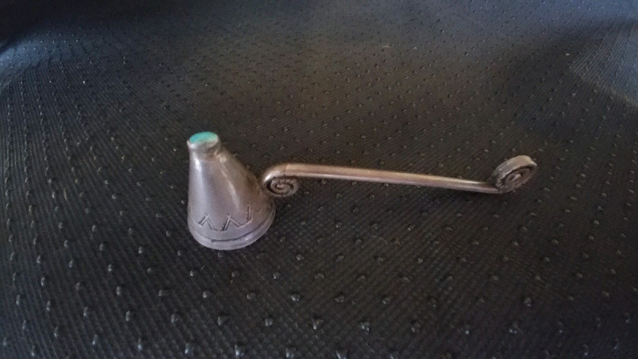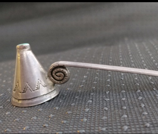 Purchased at an antique store today. A sterling and turquoise candle snuffer- no marks. It’s relatively small, about 5 inches in length. I like how the snuffer resembles a teepee.
