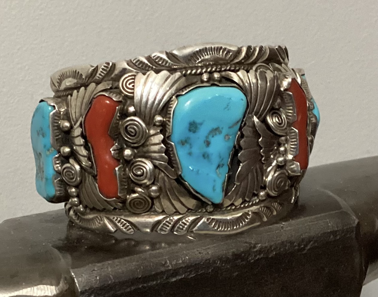 That’s a beauty! I luv all that silverwork on the cuff. Another fine example of beautiful turquoise paired with very nice coral. (Most of the set coral that I’ve seen has been in poor condition.)