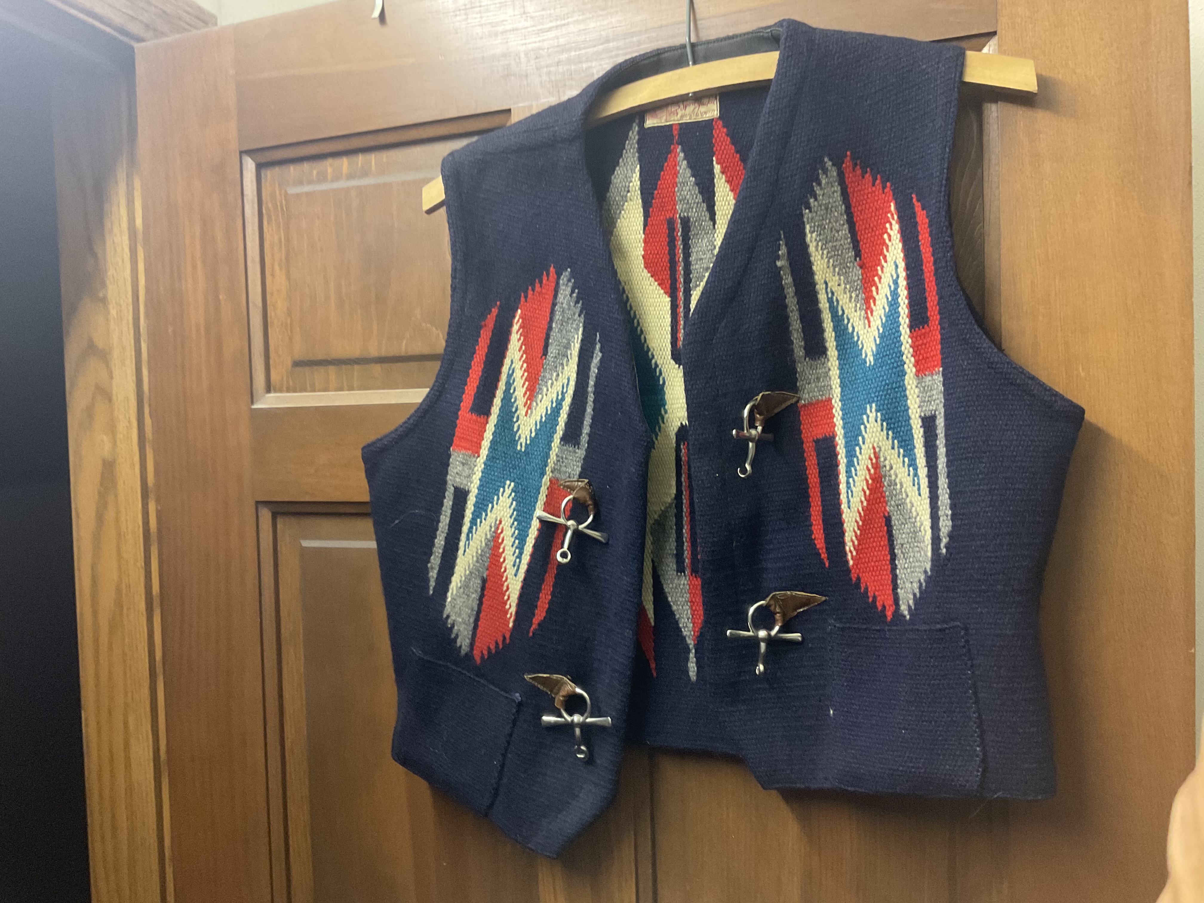 My mother-in-law’s vintage La Azteca Chimayo vest. Unfortunately, it is too small for me so I will probably sell it. But prices on eBay are all over the place. Does anyone know what the price range for La Azteca hand woven vest would be? It is a really cool vest with nice closures.
