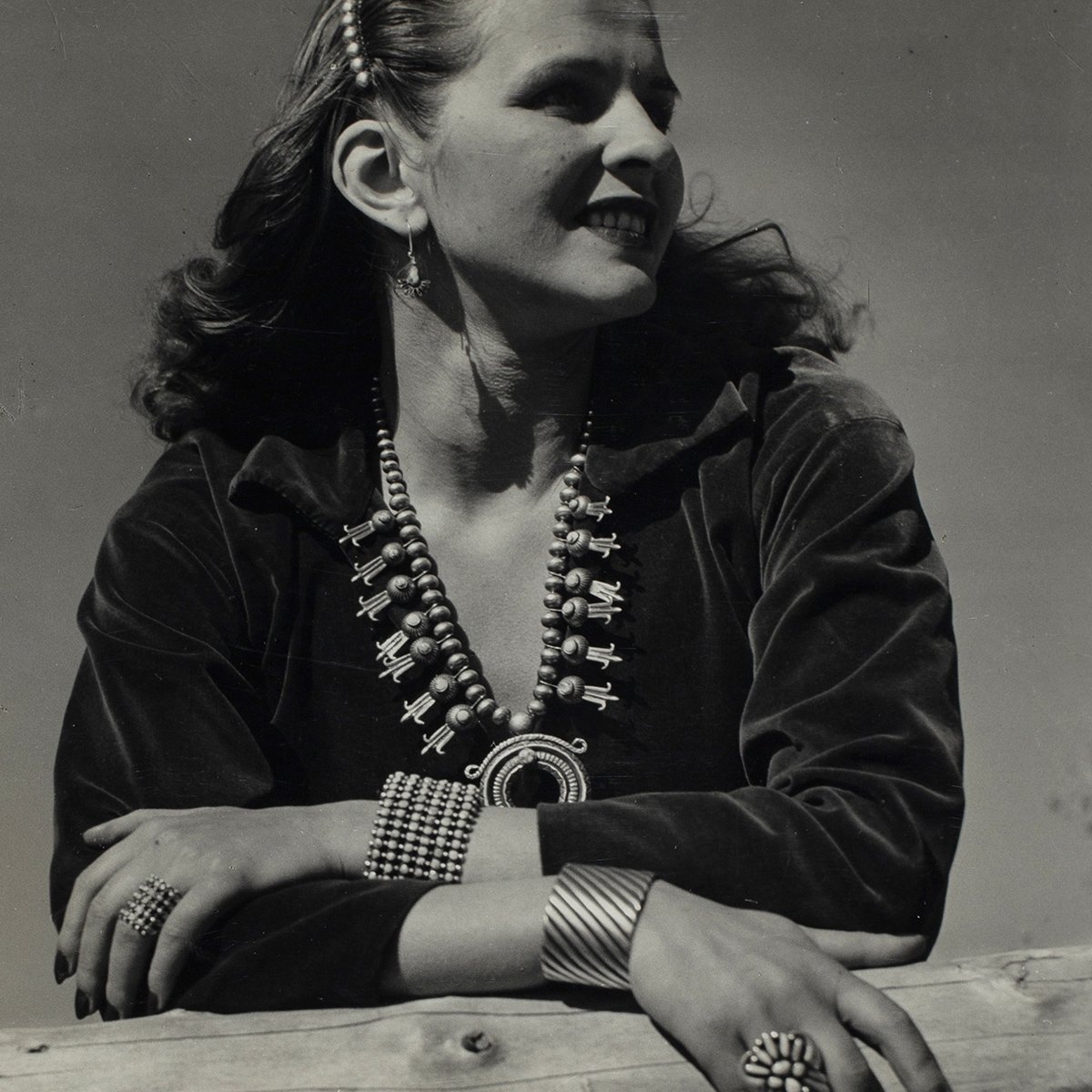 I’m not saying the squash she’s wearing is, but Etsitty Tsosie was known to create squash blossoms along this same design. The bow element directly above the naja and the somewhat unique corn elements in place of typical squash blossoms are indicative of his work.