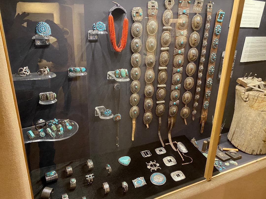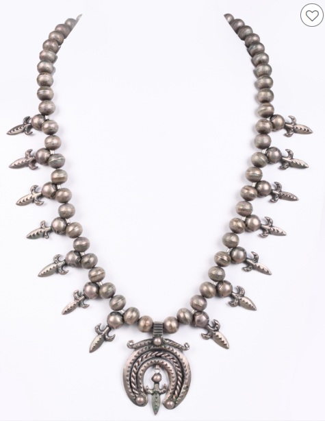 I wouldn’t be the least bit surprised if I saw the bold cuff you mentioned, and this extraordinary squash blossom necklace, in the Millicent Rogers museum. I think Ms. Rogers would’ve deeply appreciated the craftsmanship in this NA jewelry.