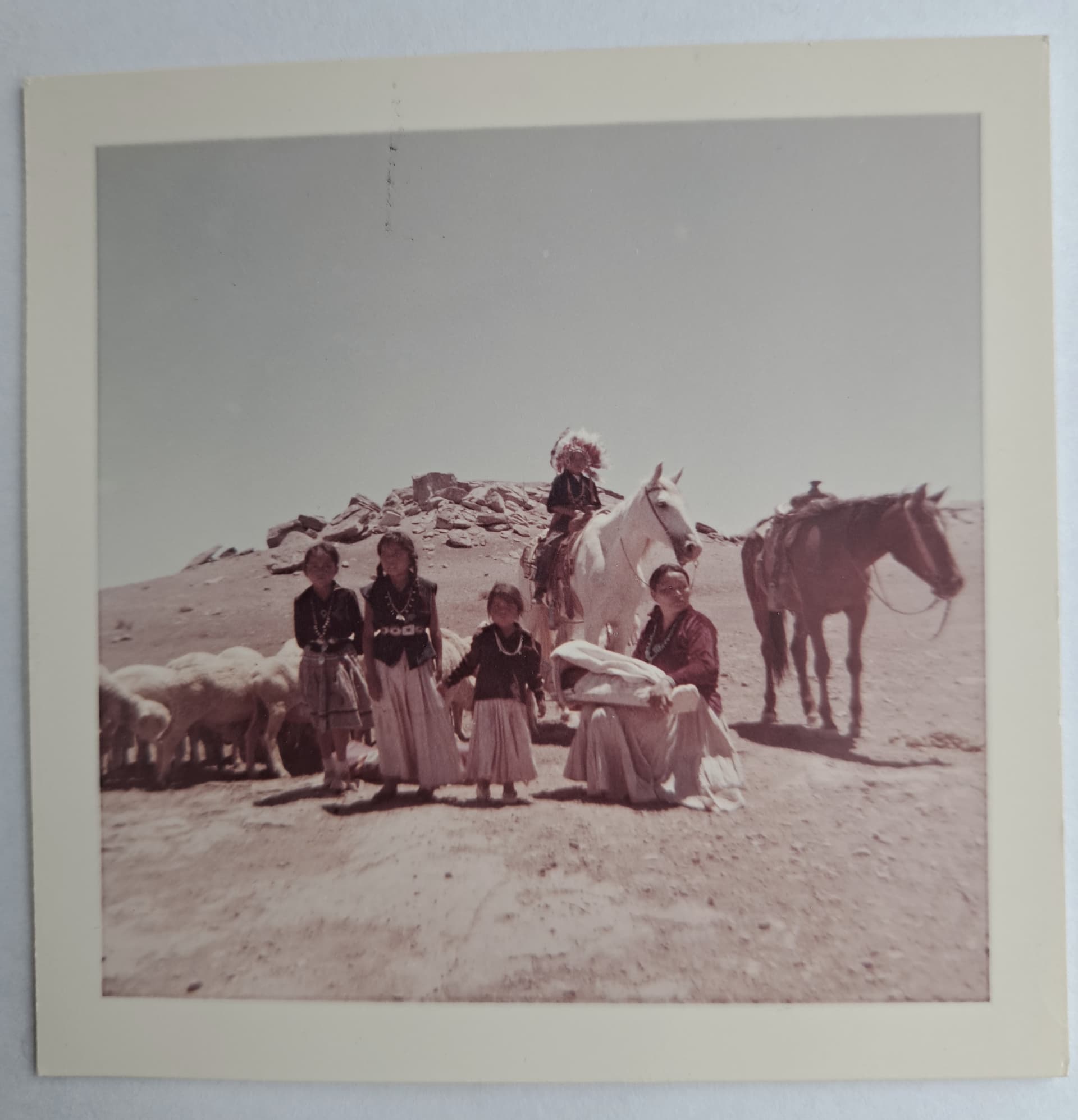 Here’s a photo taken by my Uncle on one of his many travels (he passed in 1989). Possibly taken in AZ in the 1960s -'70s though that’s a guess. No personal writing on the reverse - only “Kodak Paper” faintly visible. Photo is matte finish with an overall beige coloring. Mom & children are all wearing necklaces. The 2 older girls are wearing concho belts. I cherish this photo. Unfortunately, all other travel photos of his got tossed .