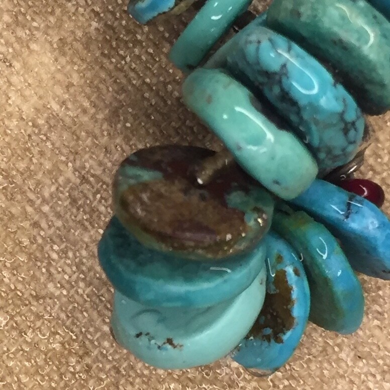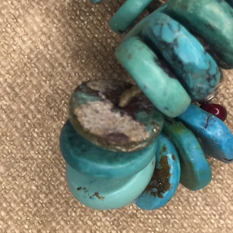 The necklace arrived today and i am very happy with it. I like the turquoise a lot and the metal is sterling. Not sure what kind of turquoise it is (guessing Chinese for now) but it seems to be natural to me, because of the way the hostrock soaks up water and turns a lot darker while doing so. I’m fascinated by way the turquoise beads have been cut, in a loose manner.