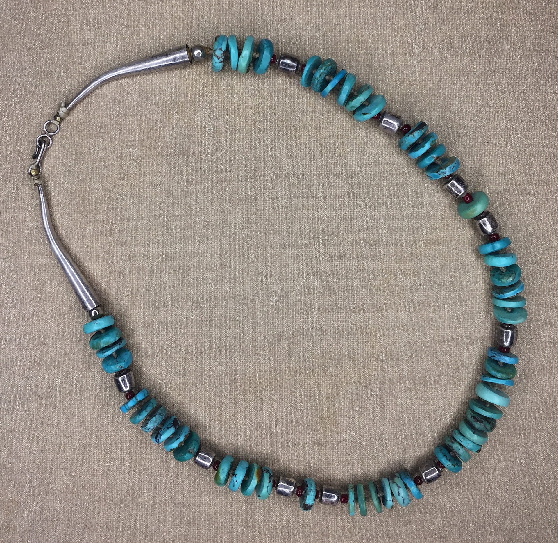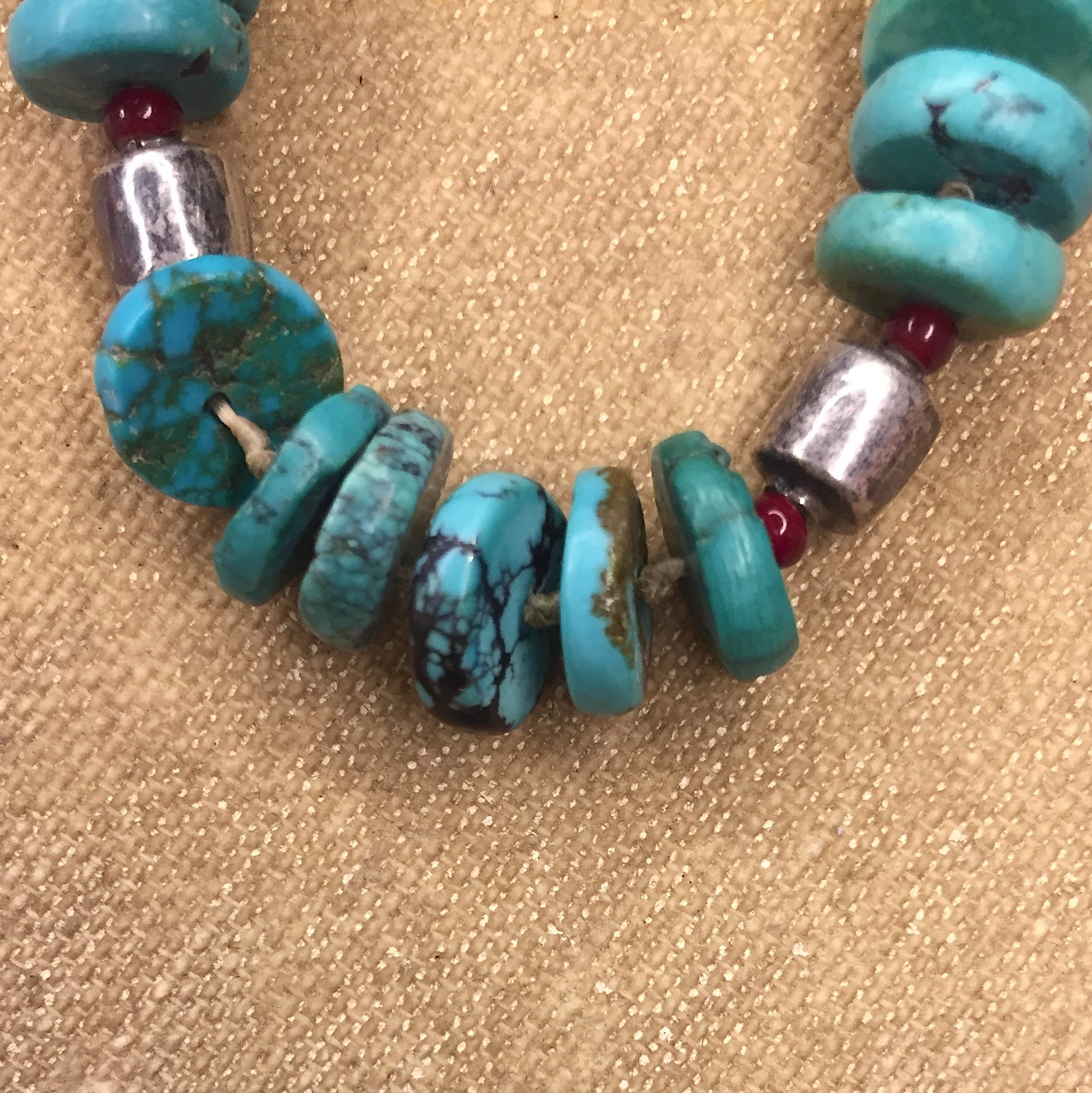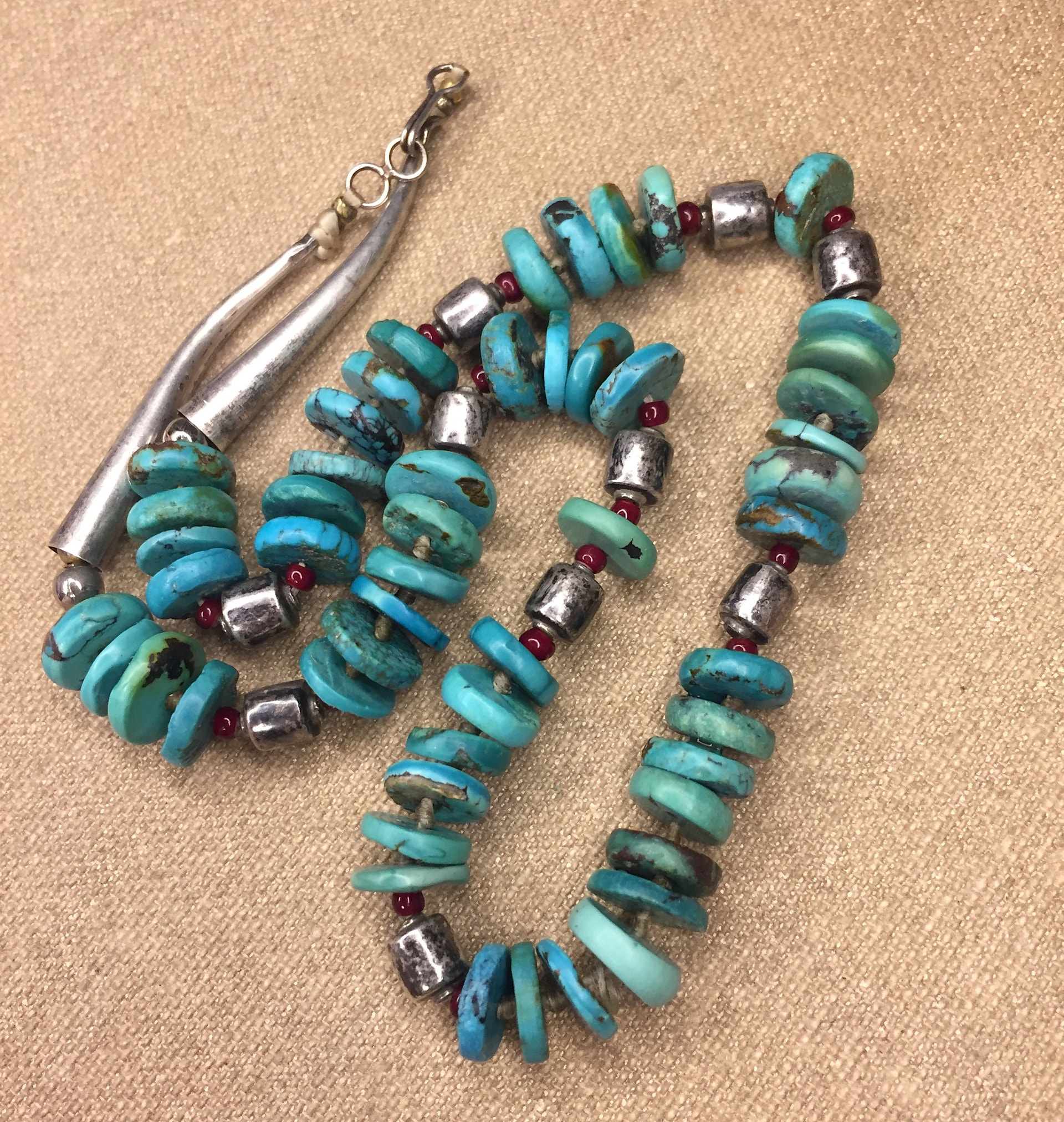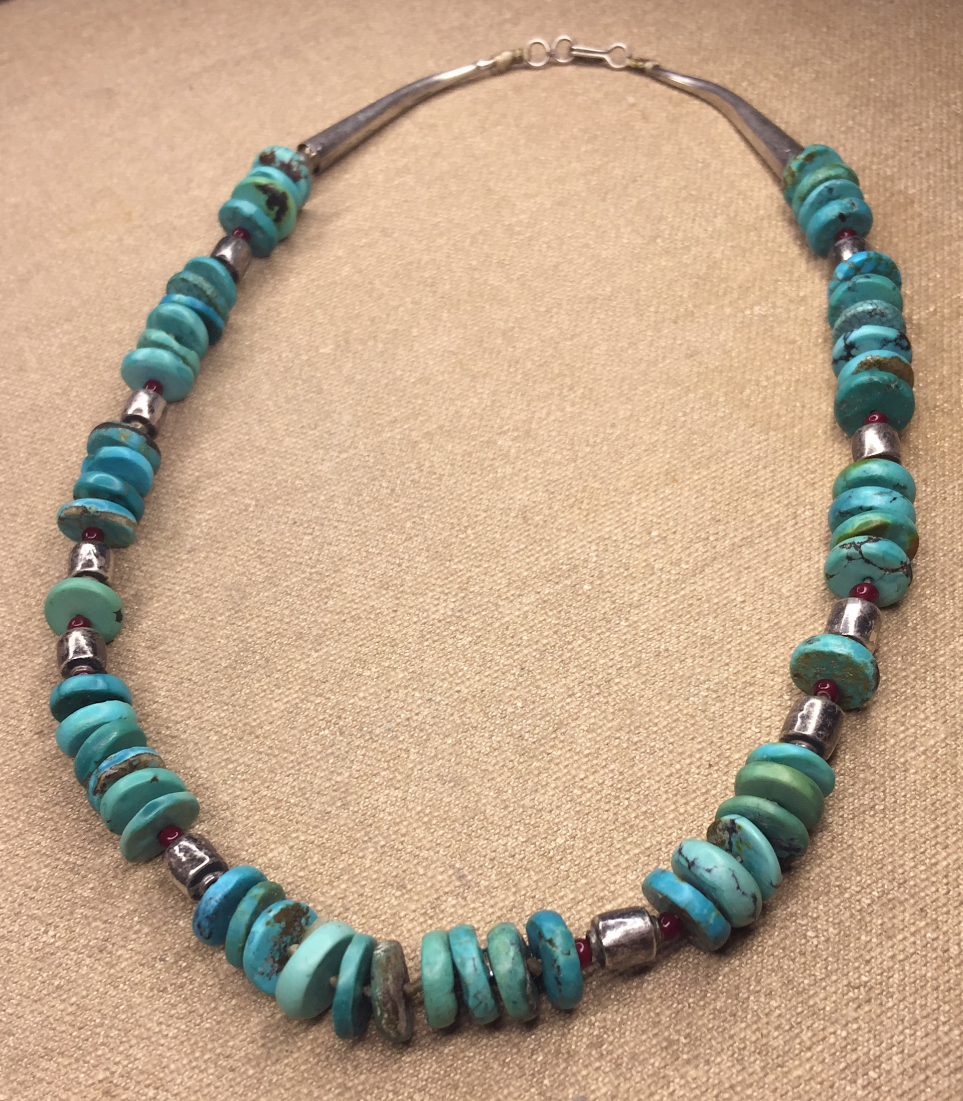 @Bluegreen Hi ~ I like your turquoise necklace! It has a unique flair about it. These are only my guesses & thoughts. I agree with you that the turquoise could be Chinese. Looks like each turquoise disc is separated by a knot similar to how pearls are strung. I see some discs are cut thicker/thinner than others - not sure if this helps in determining whether or not the necklace is Native American . Those long cones may also come into play, here. All things considered, I think it’s really nice necklace & I hope you enjoy wearing it.