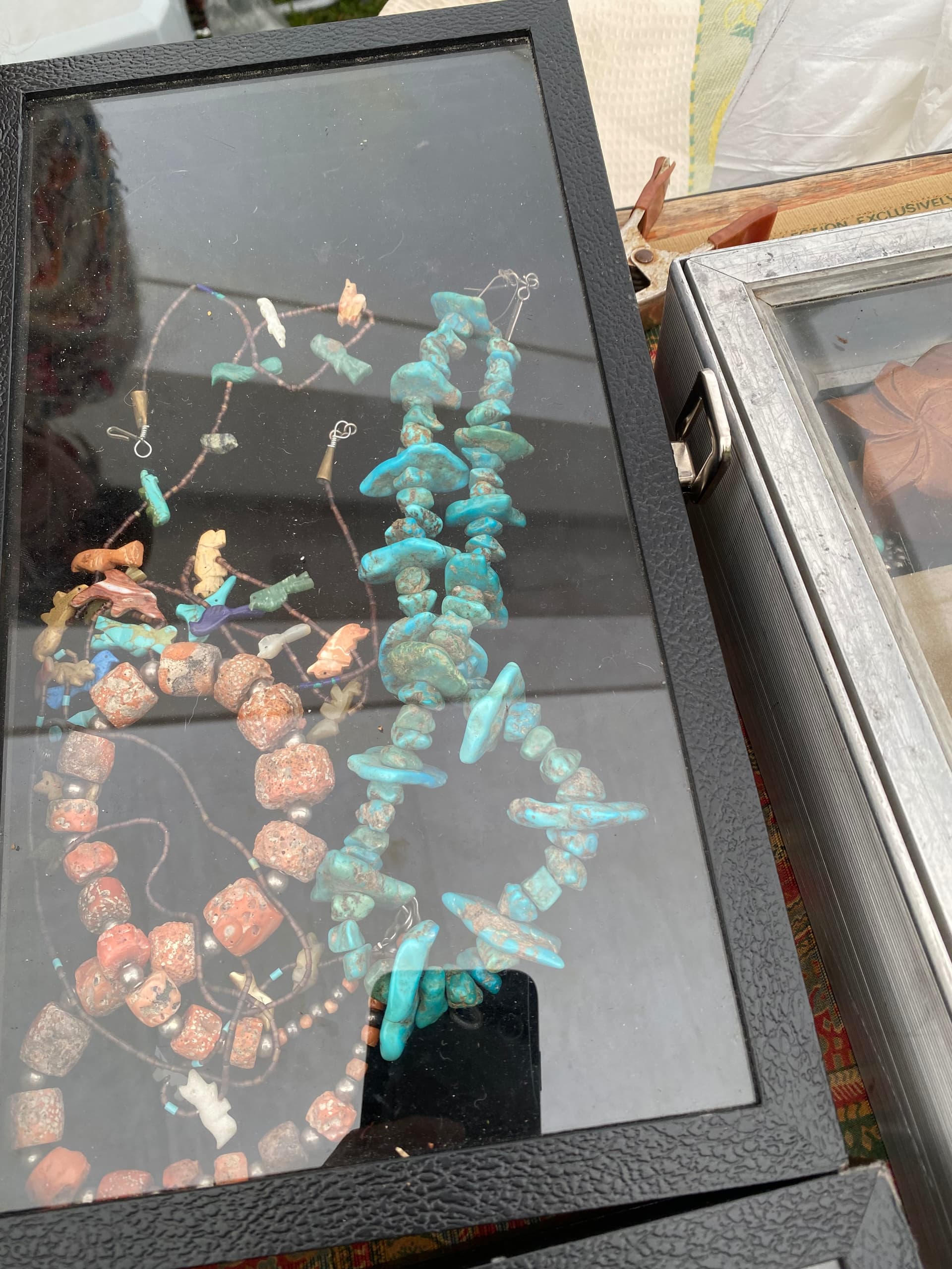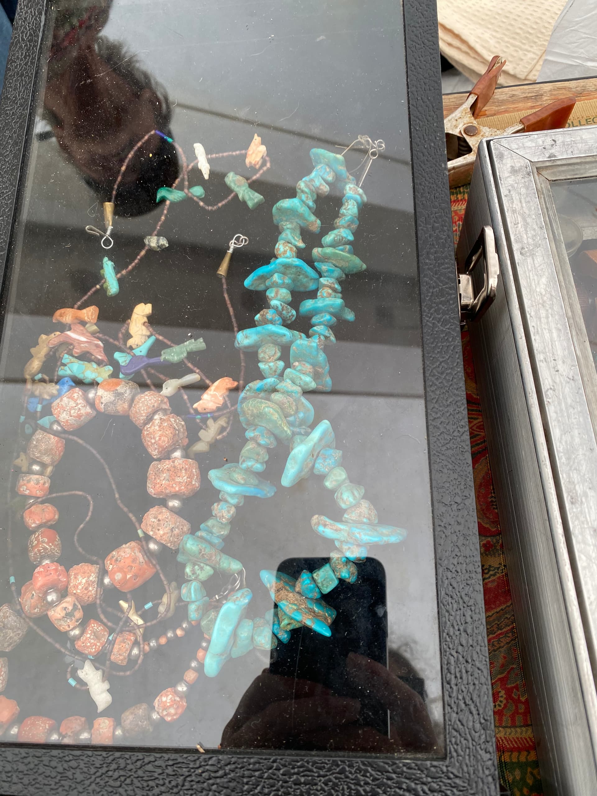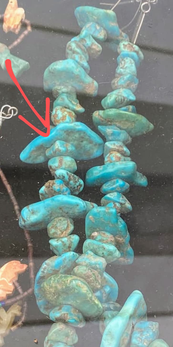 I was at a flea market in western NY yesterday and snapped a picture behind glass of these “turquoise” nuggets. It wasn’t a finished necklace and needed to be restrung. Now I can’t stop thinking about these nuggets, but I don’t know how to properly evaluate them. So now I’m trying to learn on the fly watching videos and looking at other nugget necklaces and prices on-line.