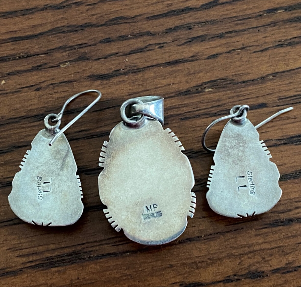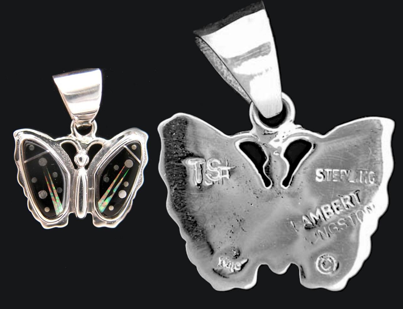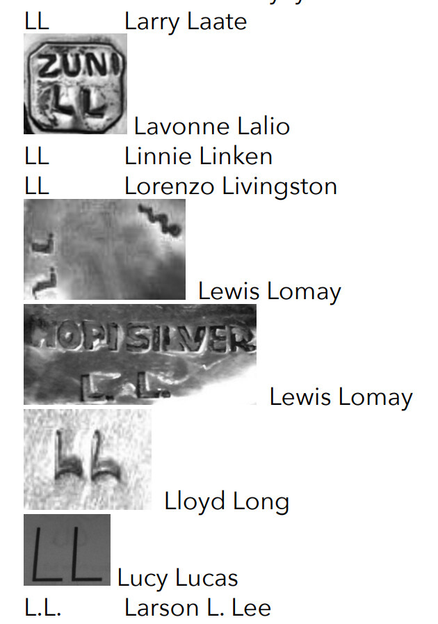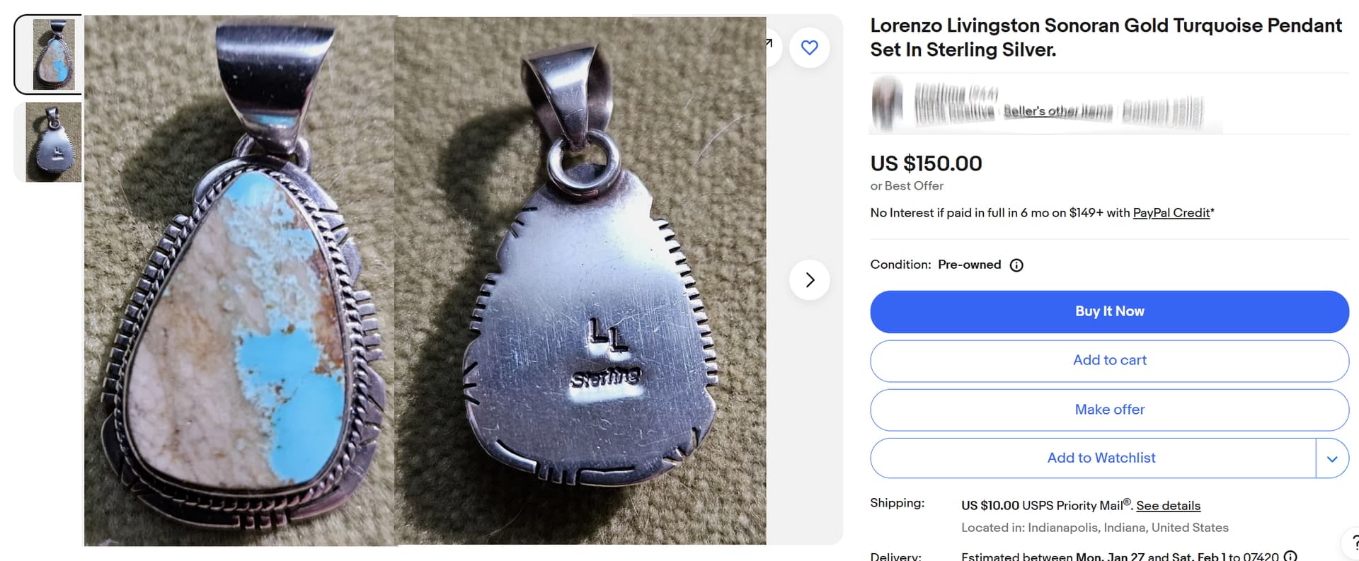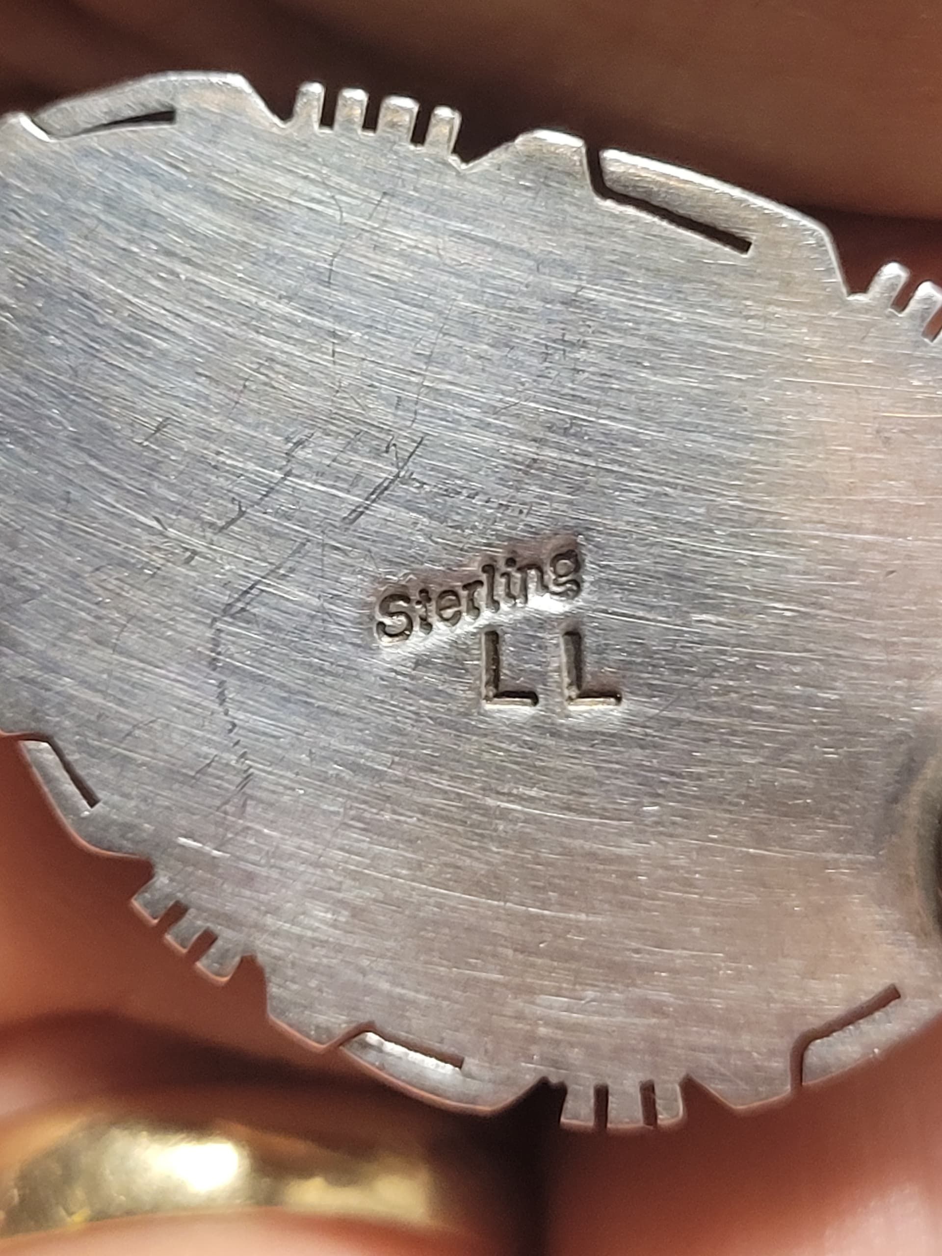 I recently bought this pendant from an antique shop, a turquoise set in sterling silver. The back of the pendant is hallmarked Sterling LL. From what I could see from the hallmark database of www.art-amerindien.com, this LL could be the hallmark of Lambert Livingston, a Navajo artist. It lt looks at least similar. But I’m no expert so, well, I could be totaly wrong.