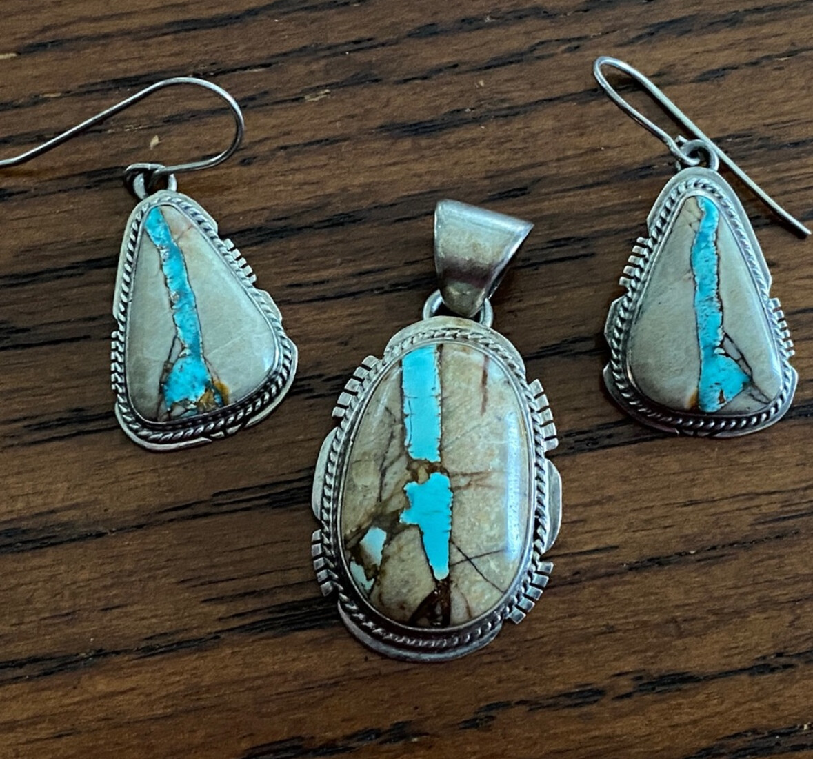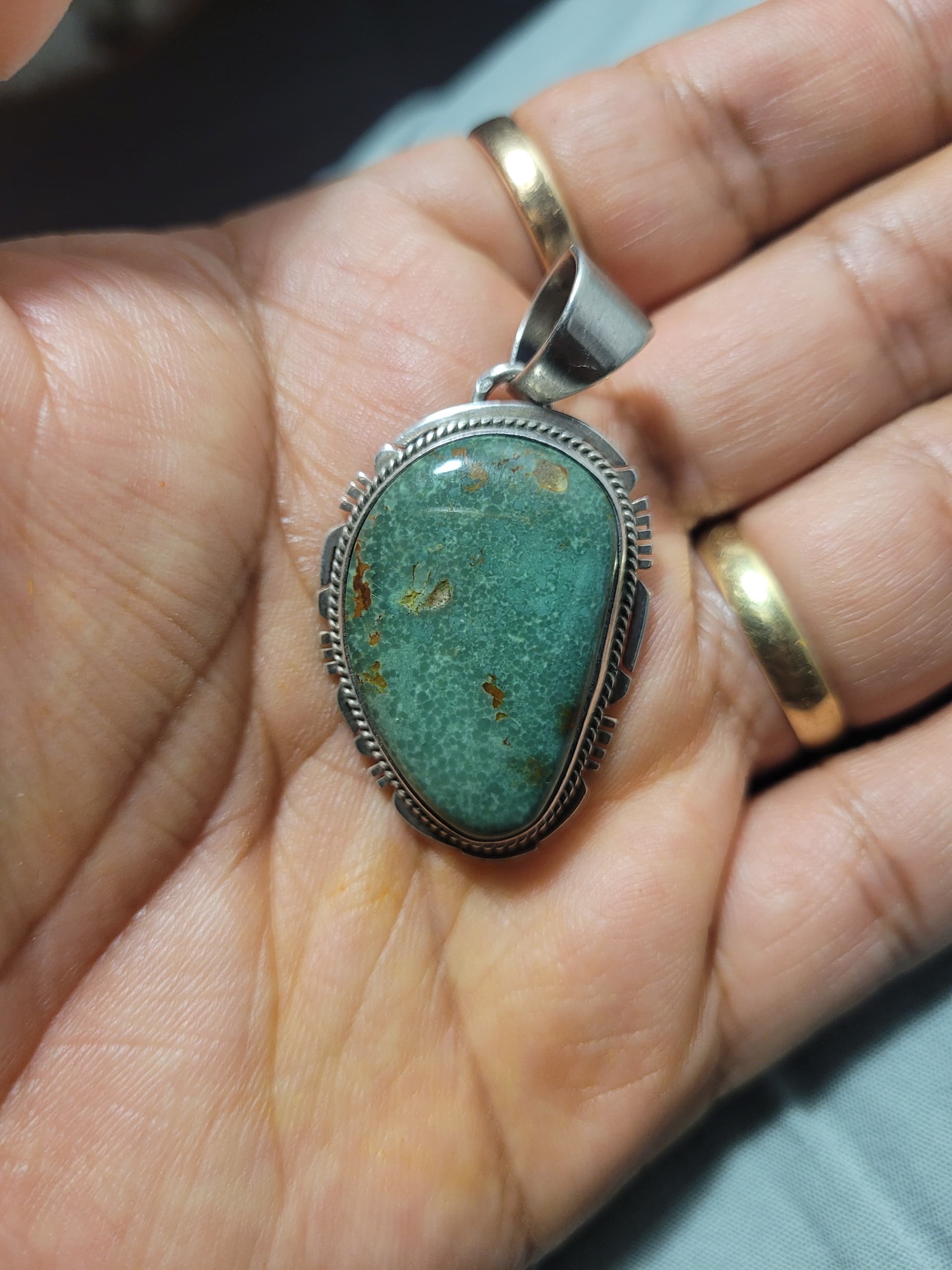 The turquoise pendant is nice, but pretty generic in terms of the style. No telling who made it or where it was made. The comment about block lettering stamps is on the money. Without provenance, the maker and even country of origin remains anyone’s guess.