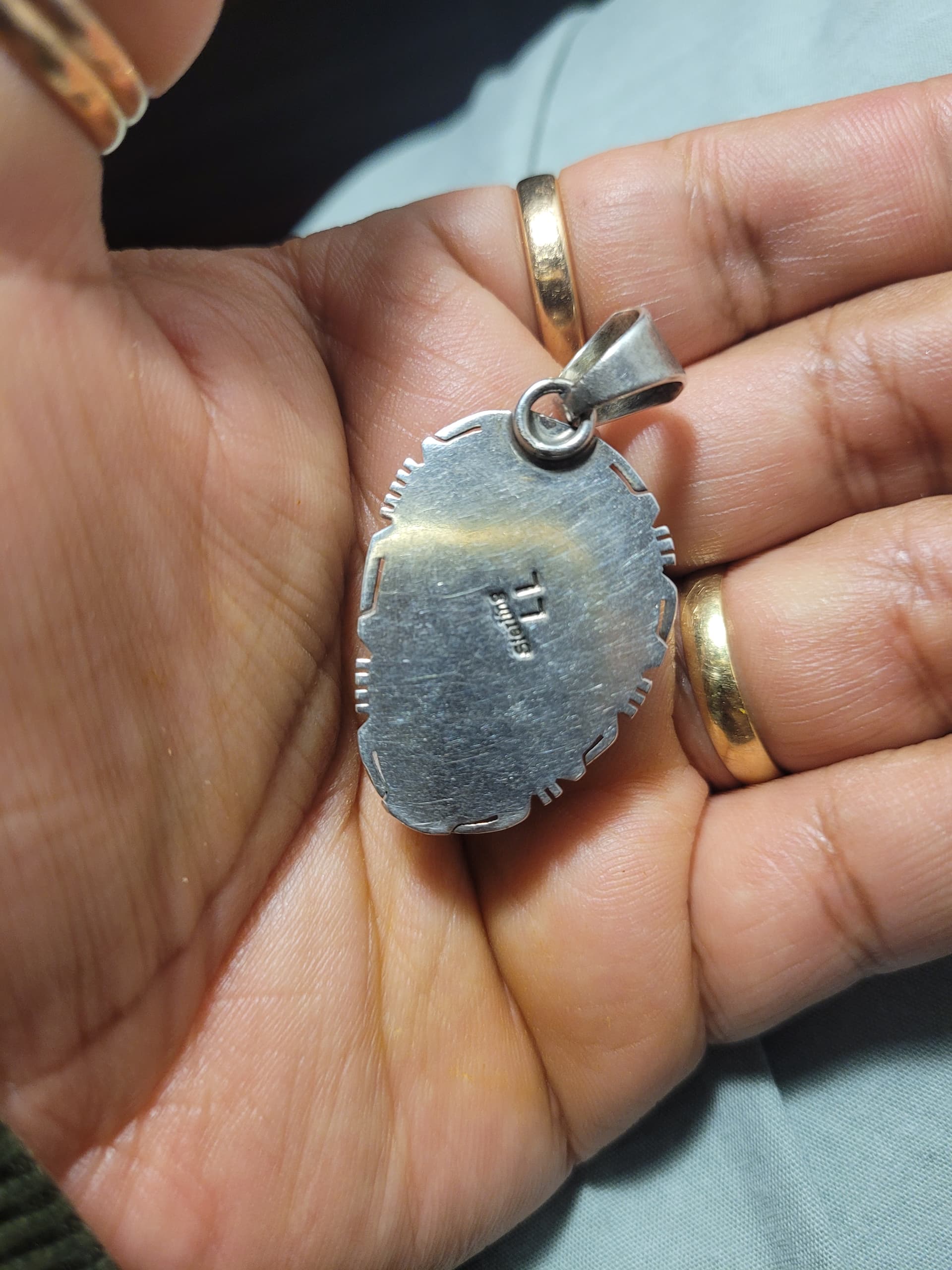 I have no help except to say that I had a pair of earrings that look to have the same mark on them. I bought them in Raton, New Mexico (along with the pendant) years ago. I didn’t wear them much, so I sold them. They were beautifully made.