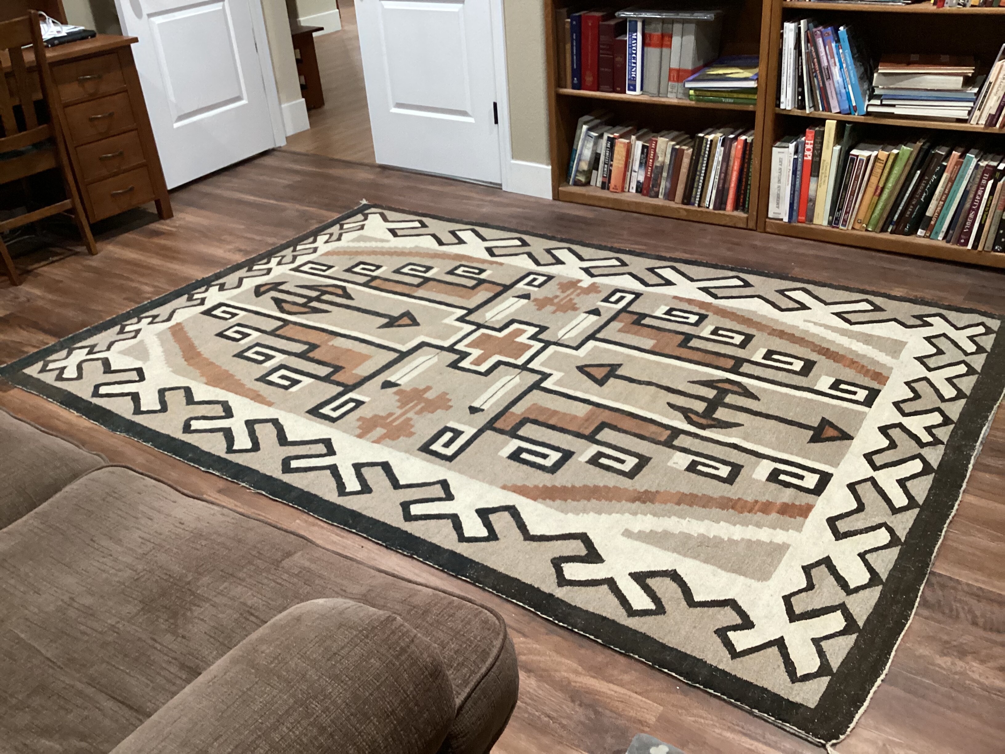 My knowledge of weaving is pretty rudimentary…I pretty much buy what I like and try to learn a bit. I’m uncertain about this large vintage (early 1900’s) rug I bought some time ago to put in our den. It had some damage; I had it cleaned and some restoration done. I’m guessing it’s a Two Grey Hills variant. Any ideas?
