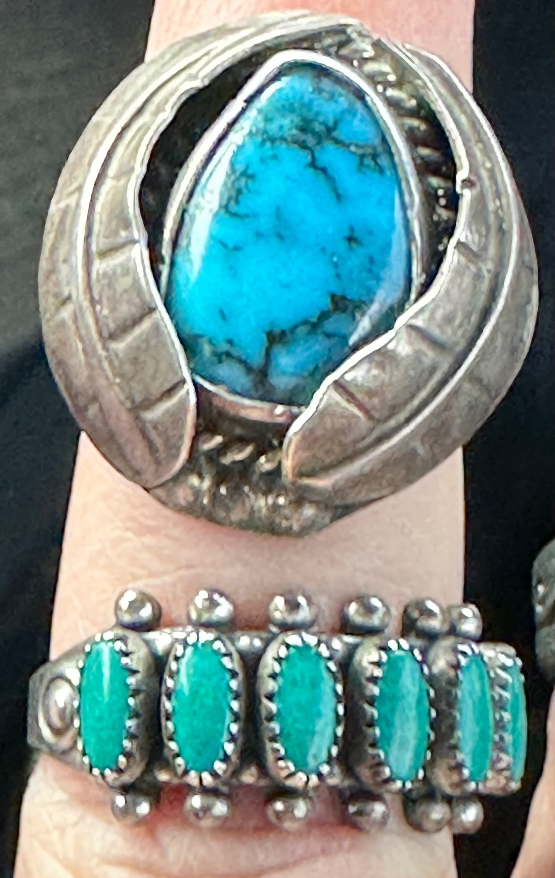 Just purchased these two rings at an antique mall today. Both are marked sterling. The first is a crudely made ring. In the store it looked like a nice cab but I am not so sure in natural light. The second is a greasy green. I look forward to your thoughts on them.