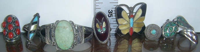 I collect chip inlay cuffs by a particular artist, Delvin Nelson. Most people want Tommy Singer’s but I have sentimental & historical reasons for focusing on Delvin Nelson. There are several artists who made rings like the one on the far right, including Mr. Nelson.