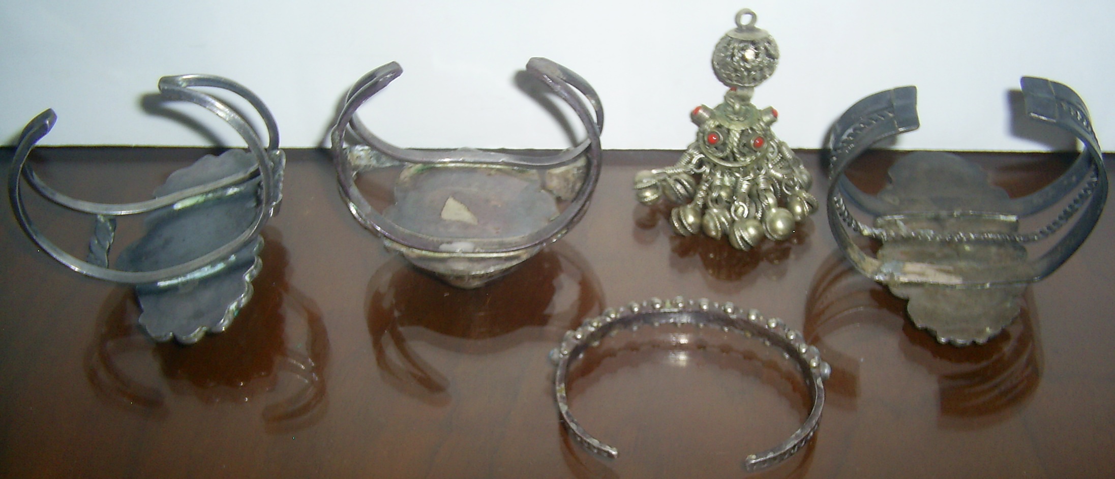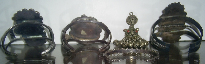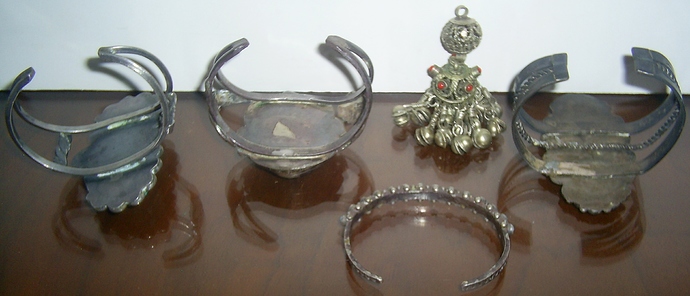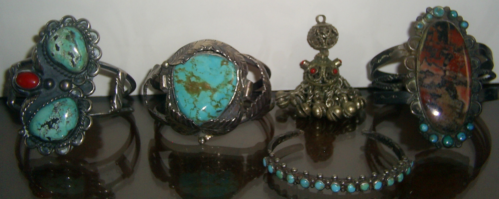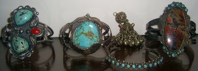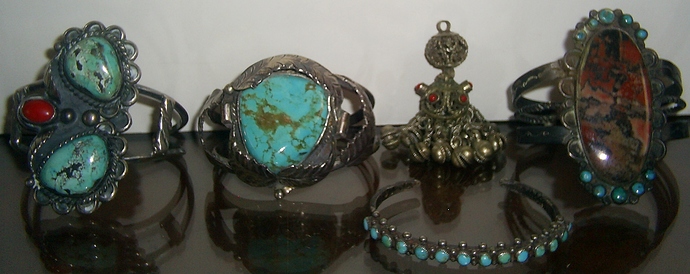 (I think I overlap with your customer a little: I love your petrified wood cuff with the turquoise satellites, I think the object to the left of it isn’t Native American – looks like something out of Asia, though I don’t know where – and then I like the cuff in the center as I’ll be interested to hear what Jason says about the big turquoise.)