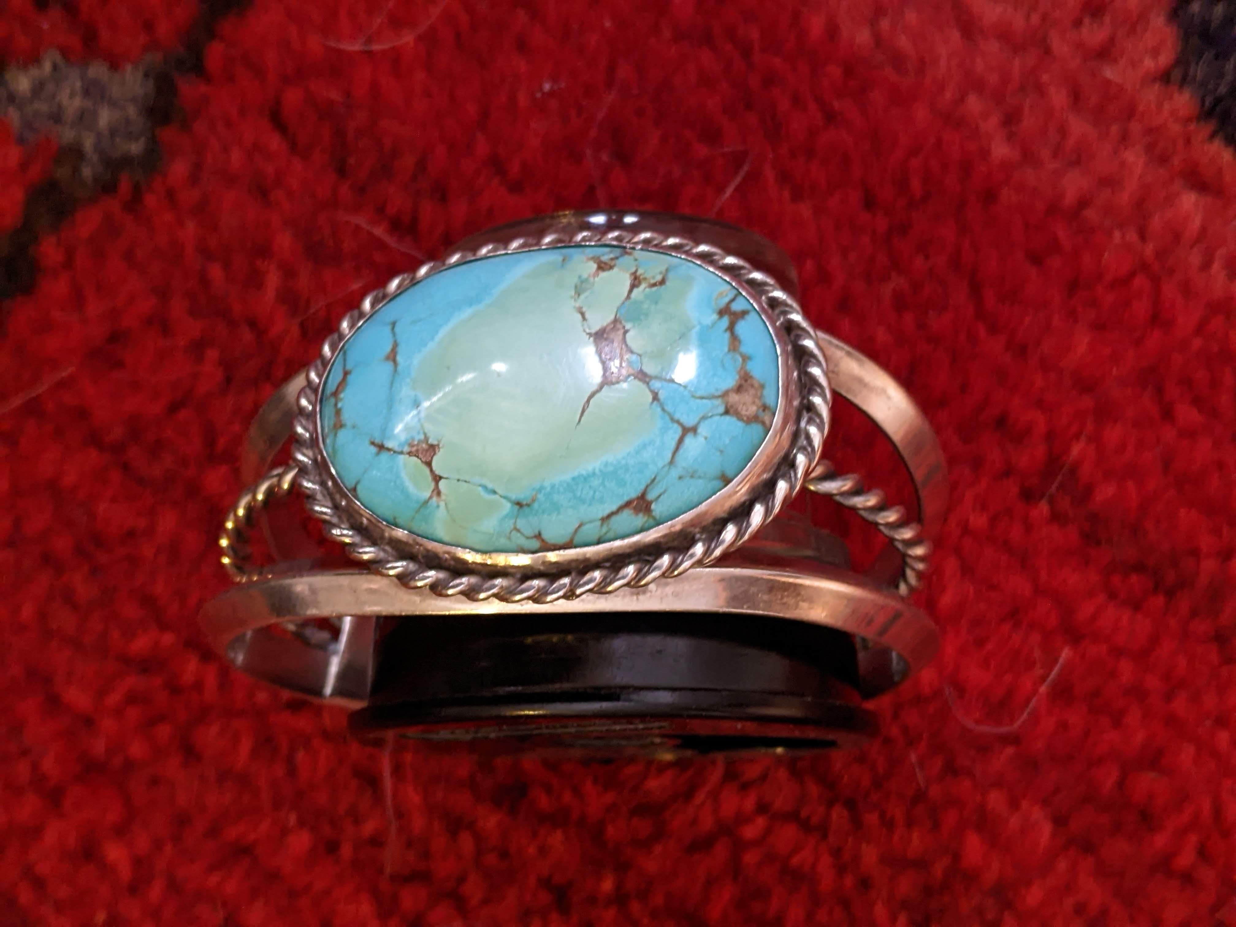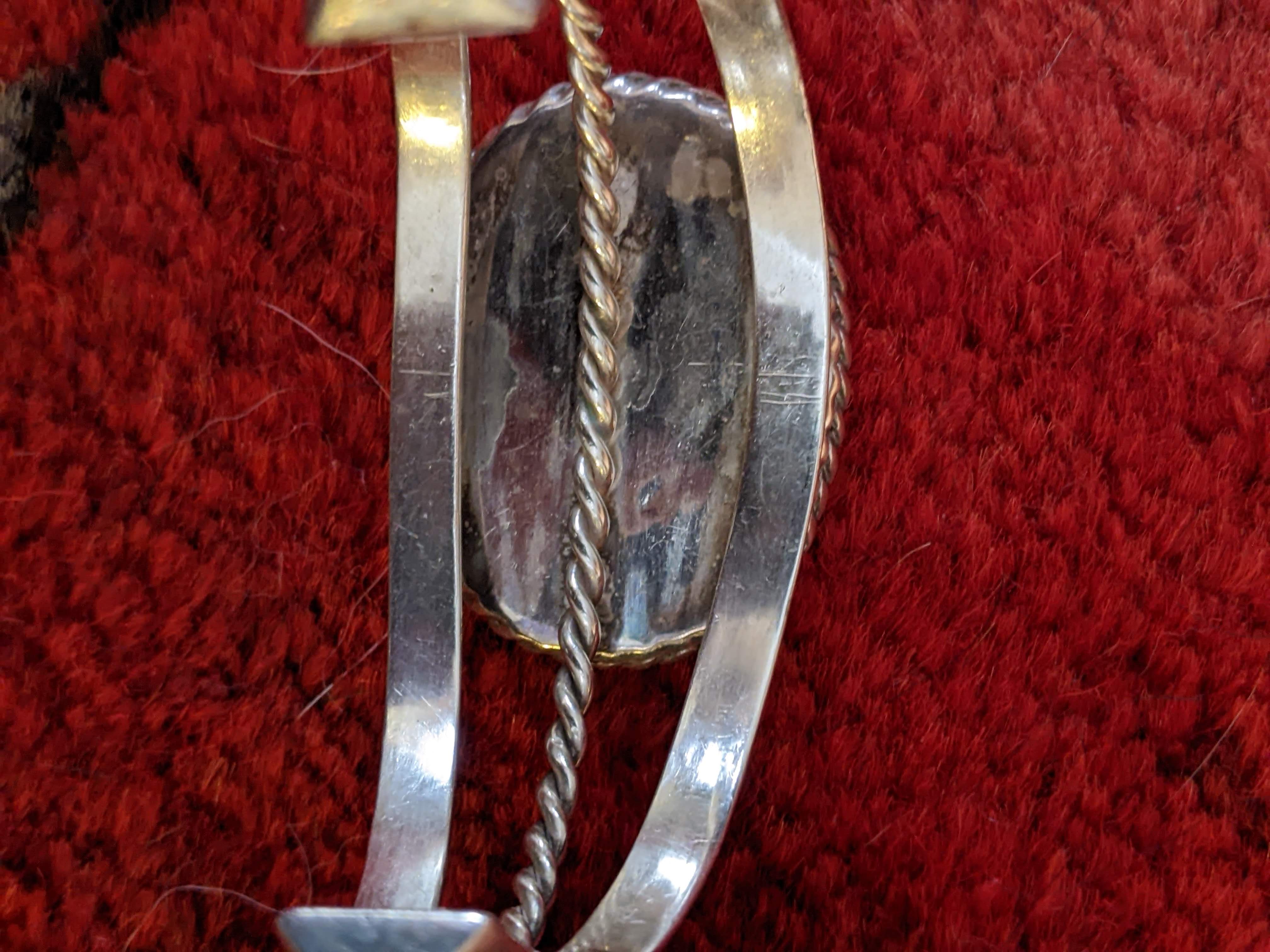 Am seriously wondering about this cuff. The central area of color loss on stone strikes me as odd - is it dyed? Is it turquoise? The cuff itself is simple, heavy with bevel set stone- and the twist wire and triangular wires make me think it could be hand made. Could it be Native American? I have not tried color testing stone with acetone to see if dye is present. Thoughts?