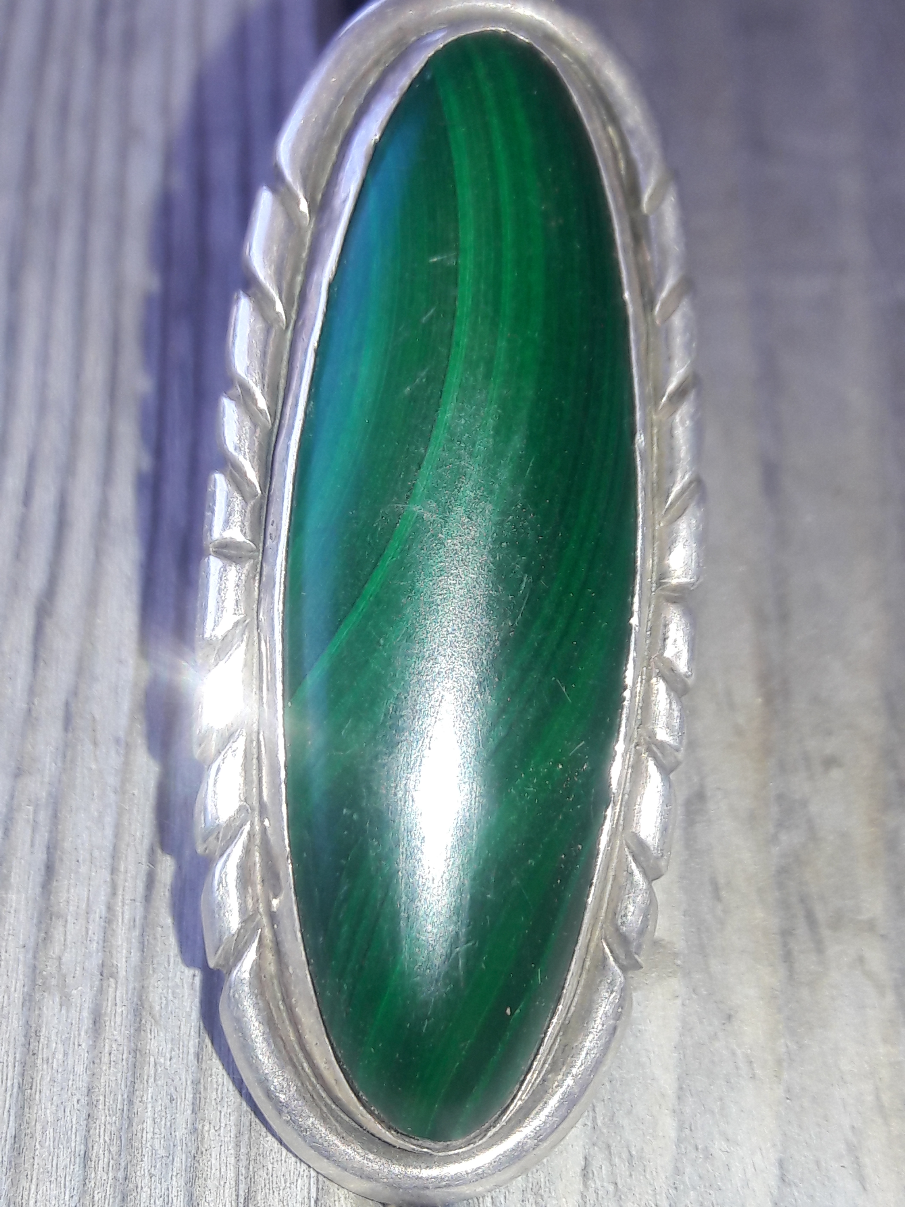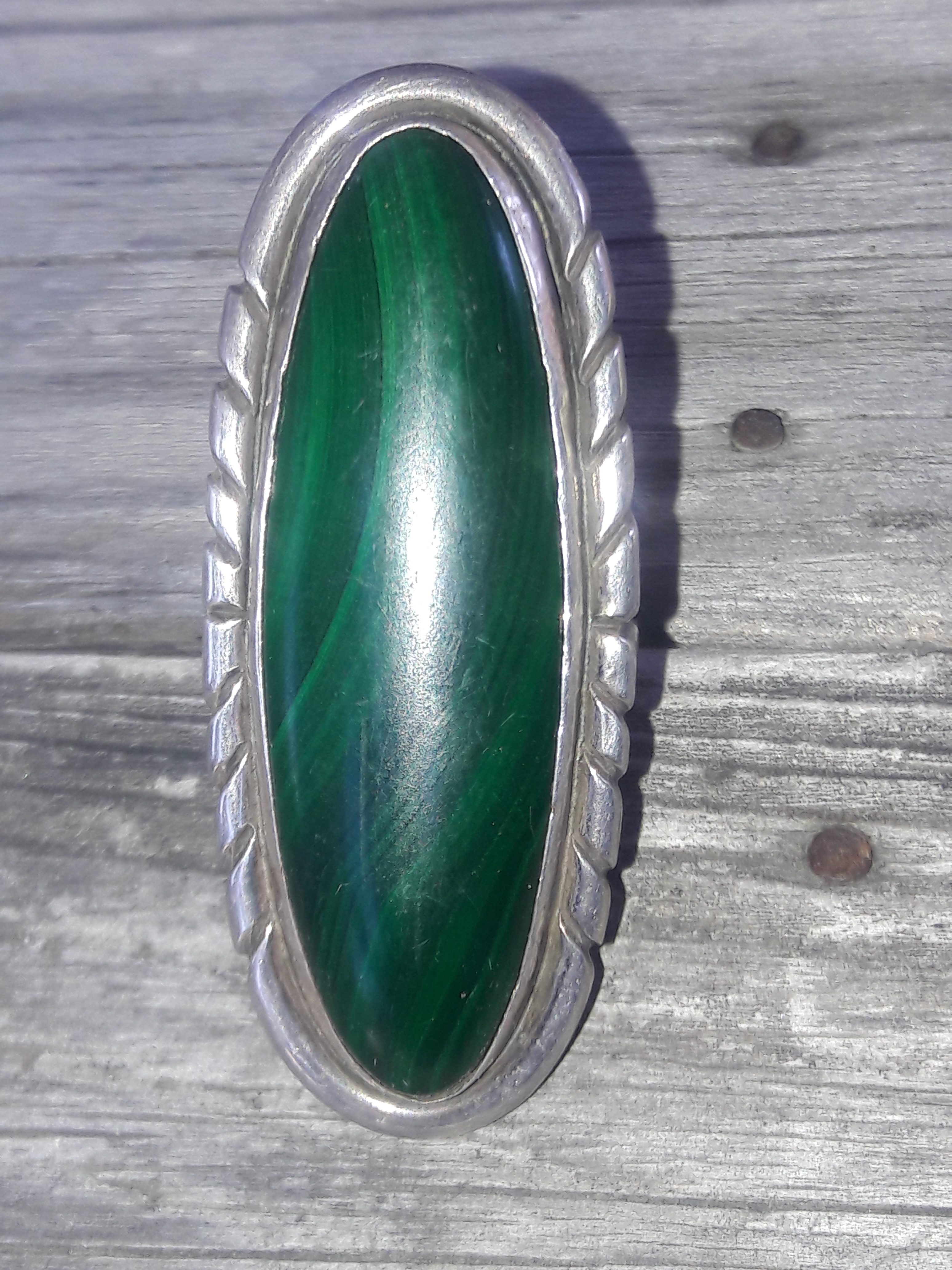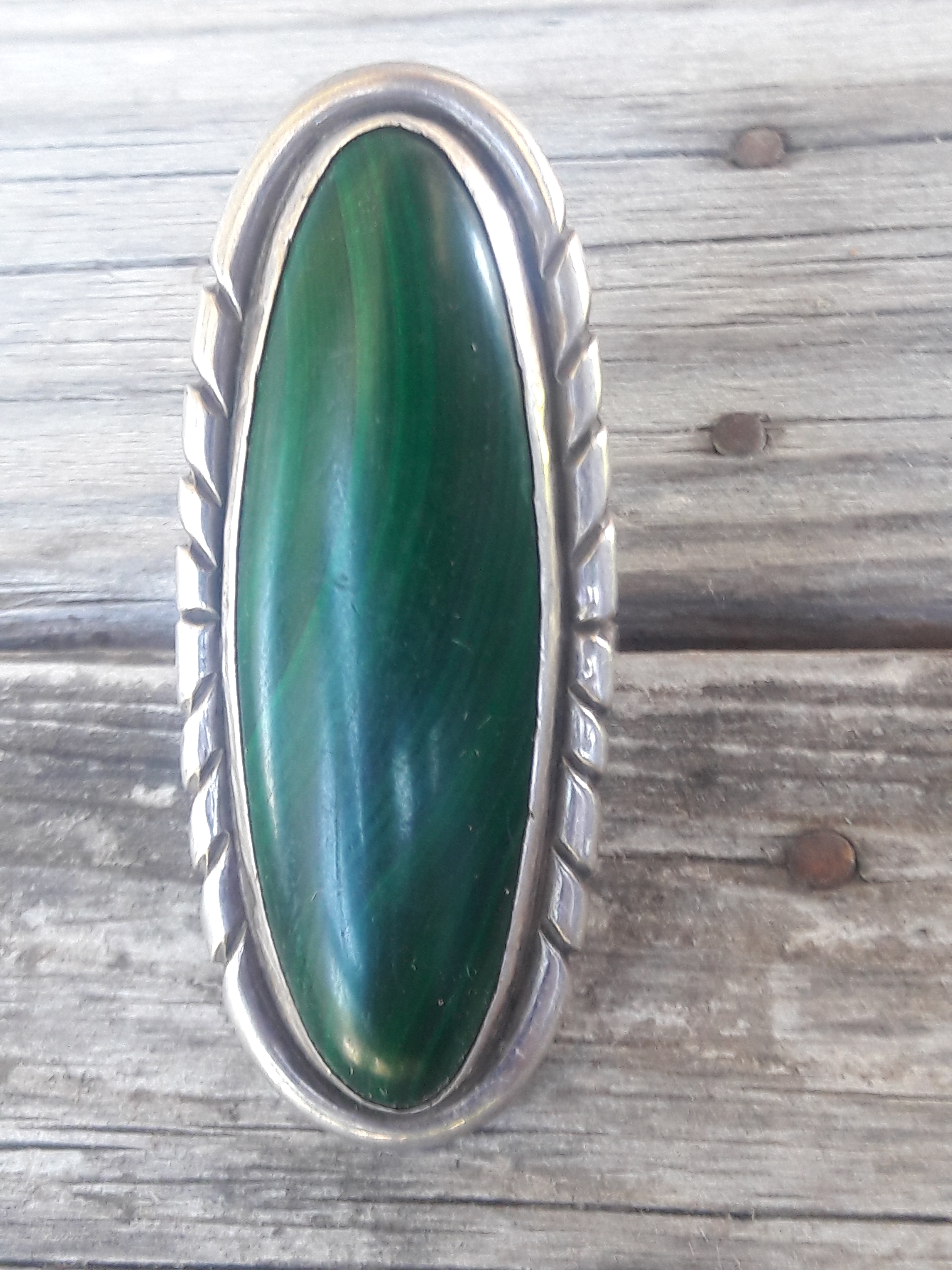 Hello this is a lovely George Nakai Navajo Sterling ring with a beautiful malachite stone (African malachite)…probably 70’s-80’s and would sell for about $65-100 around me because of the size and Navajo origin😍 Happy Hunting