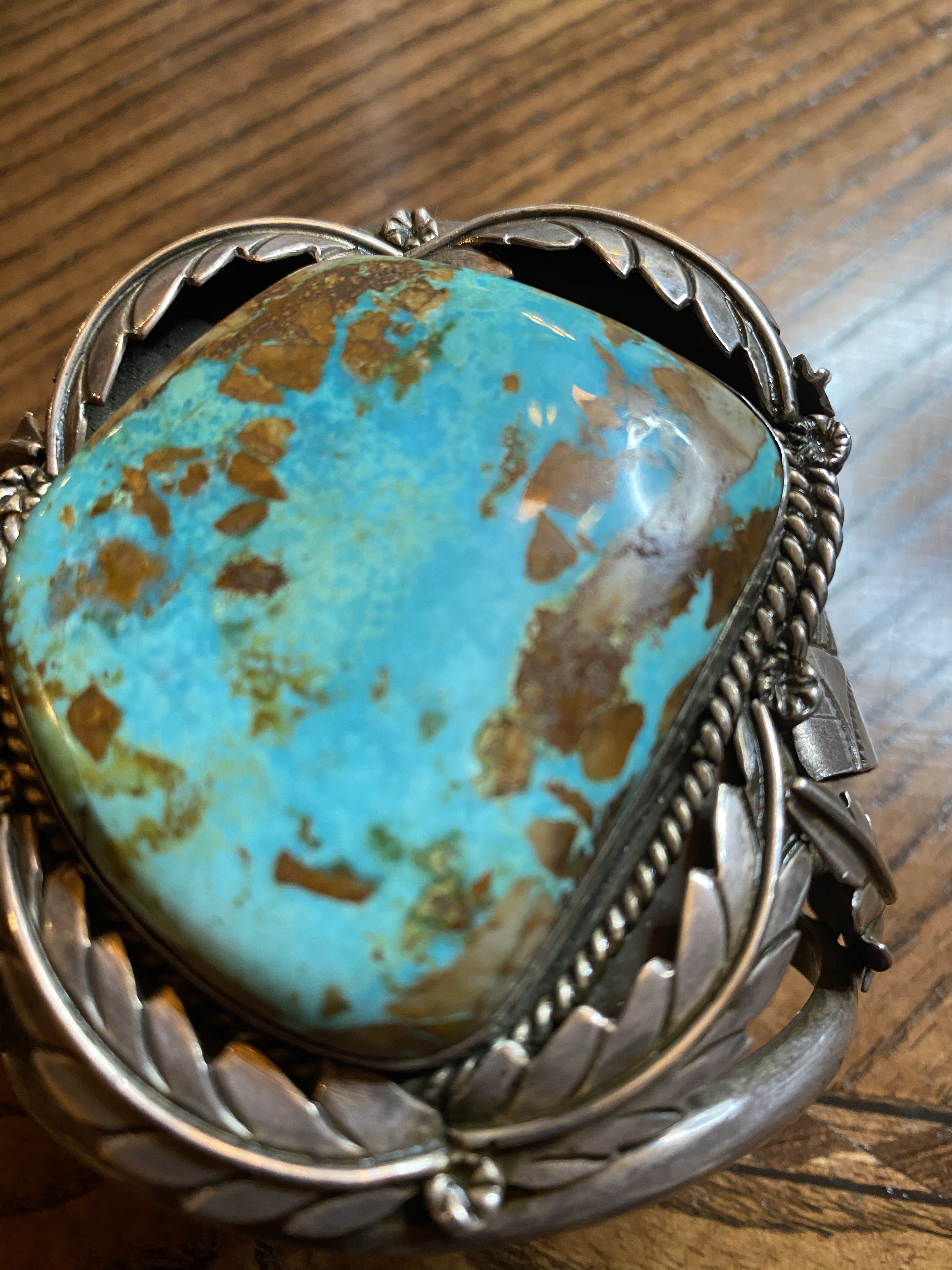 Welcome to Turquoise People. That is a great looking bracelet and I would agree with Royston. I couldn’t find that hallmark, but the piece is 70s-80s and that is during a jewelry boom for Native American silver and stone. From the way the hallmark looks you can tell they are letter stamps, tons of people are making jewelry at this time to cash in on the boom. Without the internet at this time it might be very difficult to find this artist’s name.