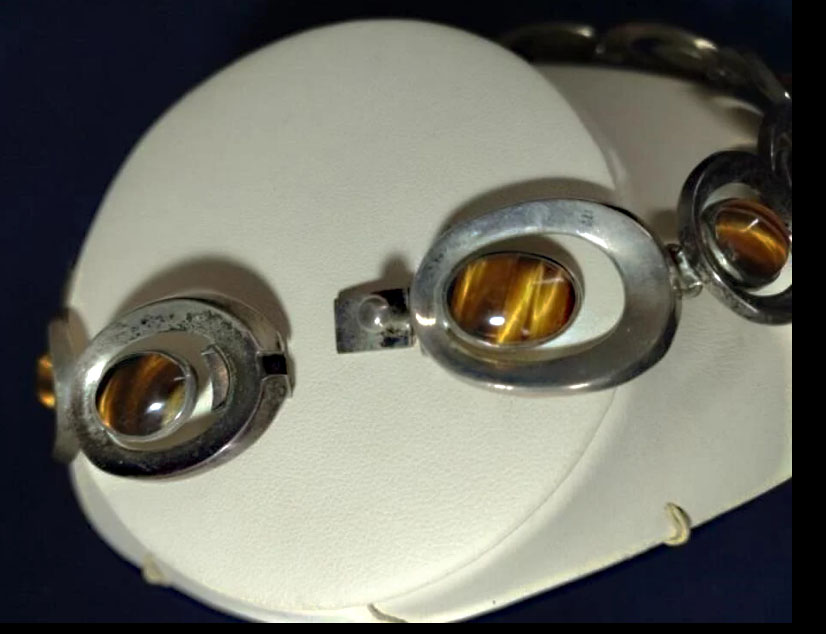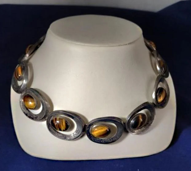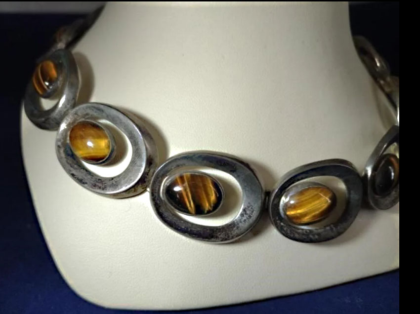 I believe the tigers eye necklace is Fidencio Serrano - Fidencio top of circle and Serrano bottom of circle around 925 I’ve attached a bracelet https://www.ebay.com/itm/224945246523?hash=item345fc8113b:g:HBMAAOSwZith7u1F. The hidden box clasp is not unusual in Mexican jewelry.