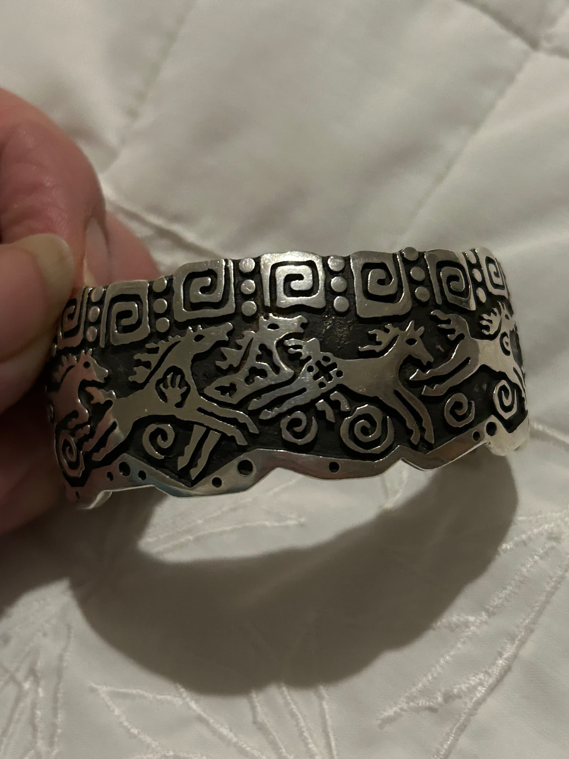 Very pretty cuff, but I don’t believe it is Native American made. I’m not at home so I am not able to look up the hallmark that you posted in the other thread, but it something about it just doesn’t look native made.