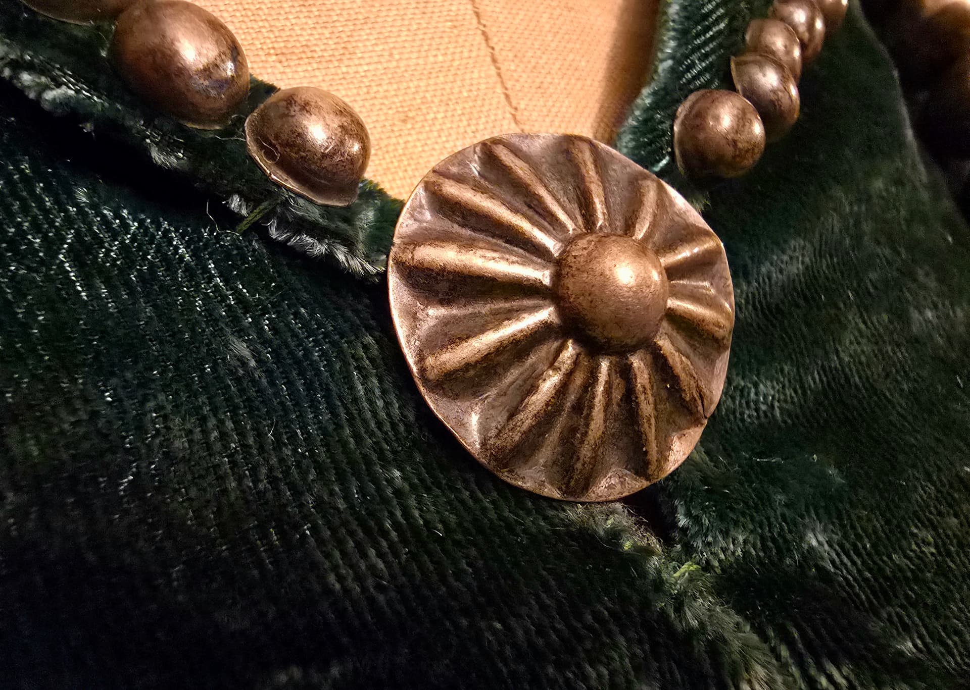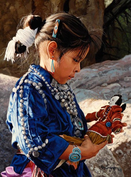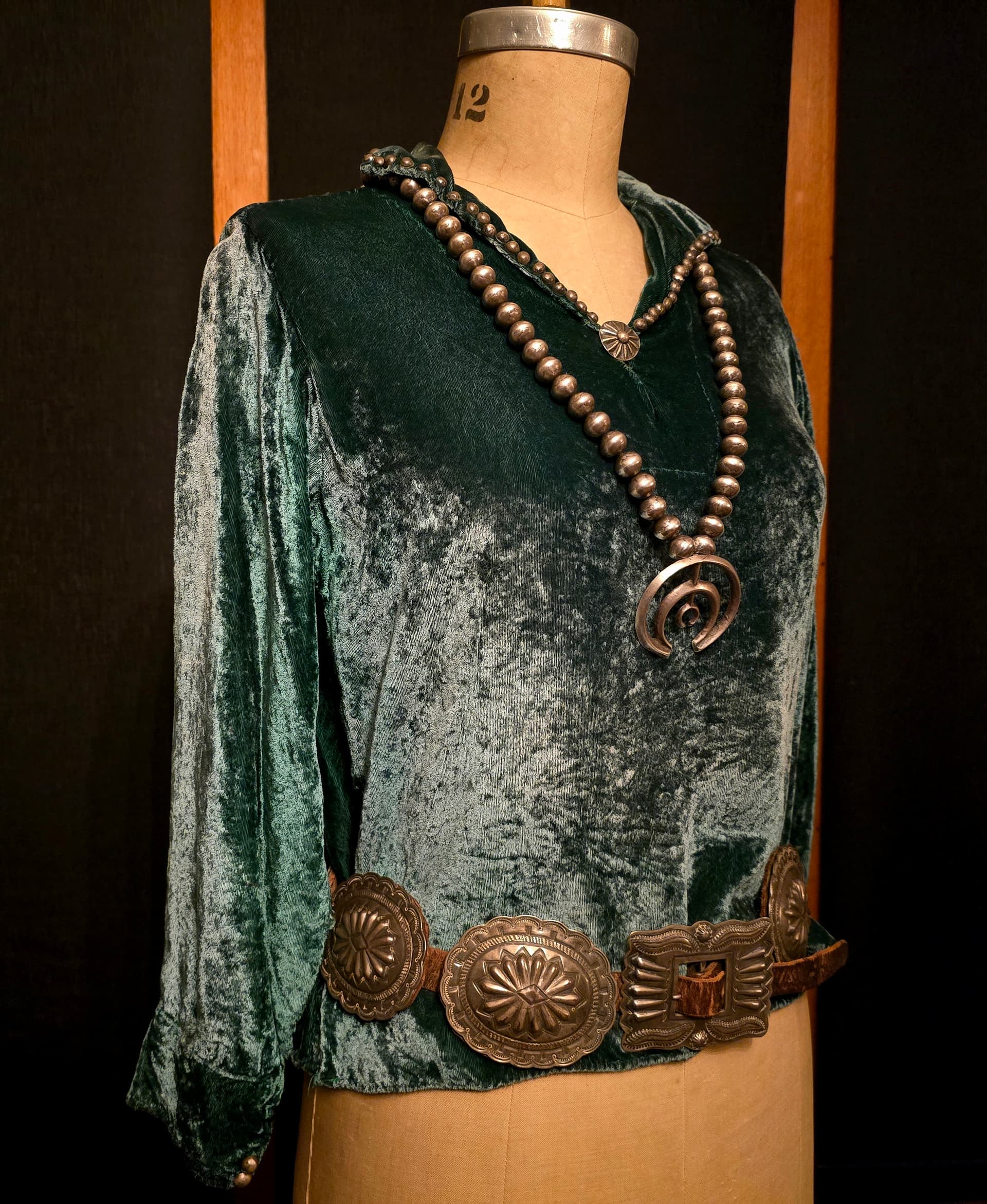 The dress form that I draped the chief’s blanket on is a woman’s size twelve. With it’s narrow shoulders and the relatively petite size, it doesn’t display that blanket very well. A couple of weeks ago, I stumbled upon a vintage green velvet blouse that was adorned with simple silver embellishments. It was advertised as having come from the estate of Ray Swanson, the infamous American Western painter. Mr. Swanson has been featured numerous times in Turquoise Artwork and his portrayals of Native Americans are picturesque.