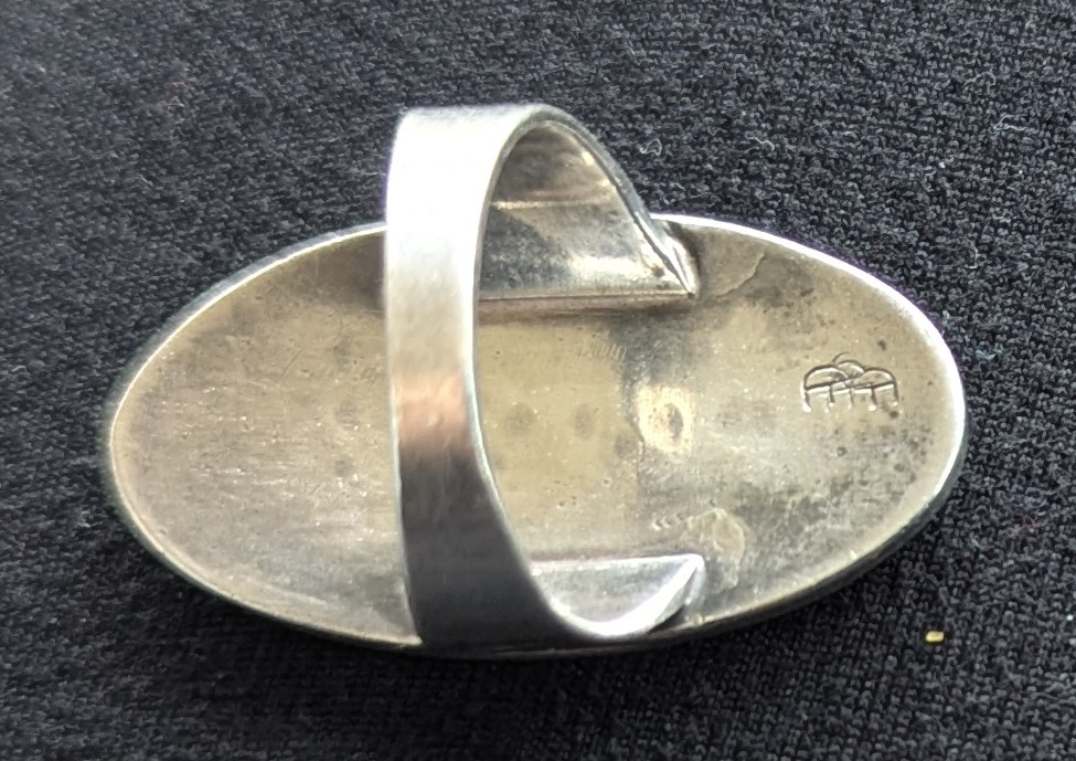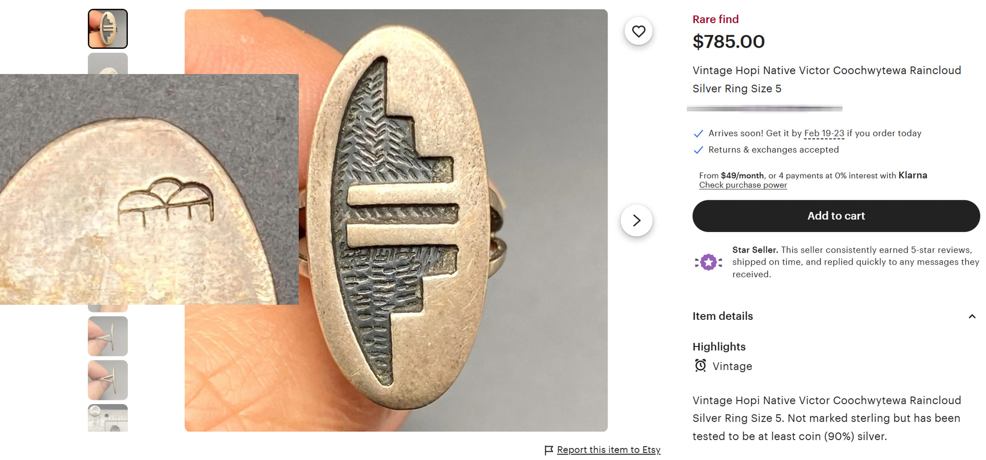 Hi, I bought this Hopi style ring and a street antique faire because I liked it, it fits perfectly, it is easy to wear, it was so well made, and the price was affordable. I got home and looked up the hallmark and learned that rain clouds are often on imitation imports.