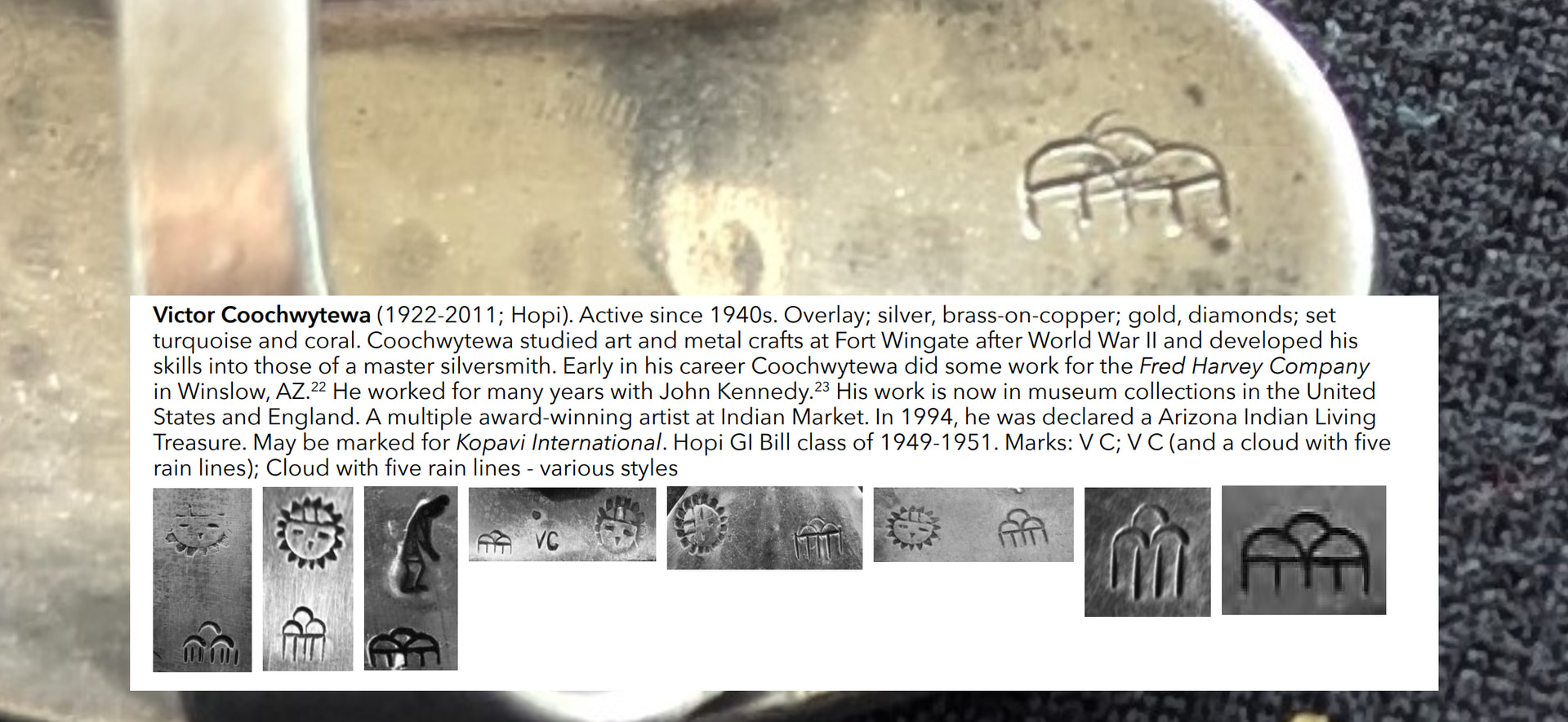 Without provenance itâs impossible to know who made it, or if there is an associated tribal affiliation. Generally, this is fashioned in a Hopi style, and the saw work is pretty clean, but the background stamping looks more than slightly âoff âof what one sees in genuine Hopi, and the linear stampwork isnât as clean and pristine.