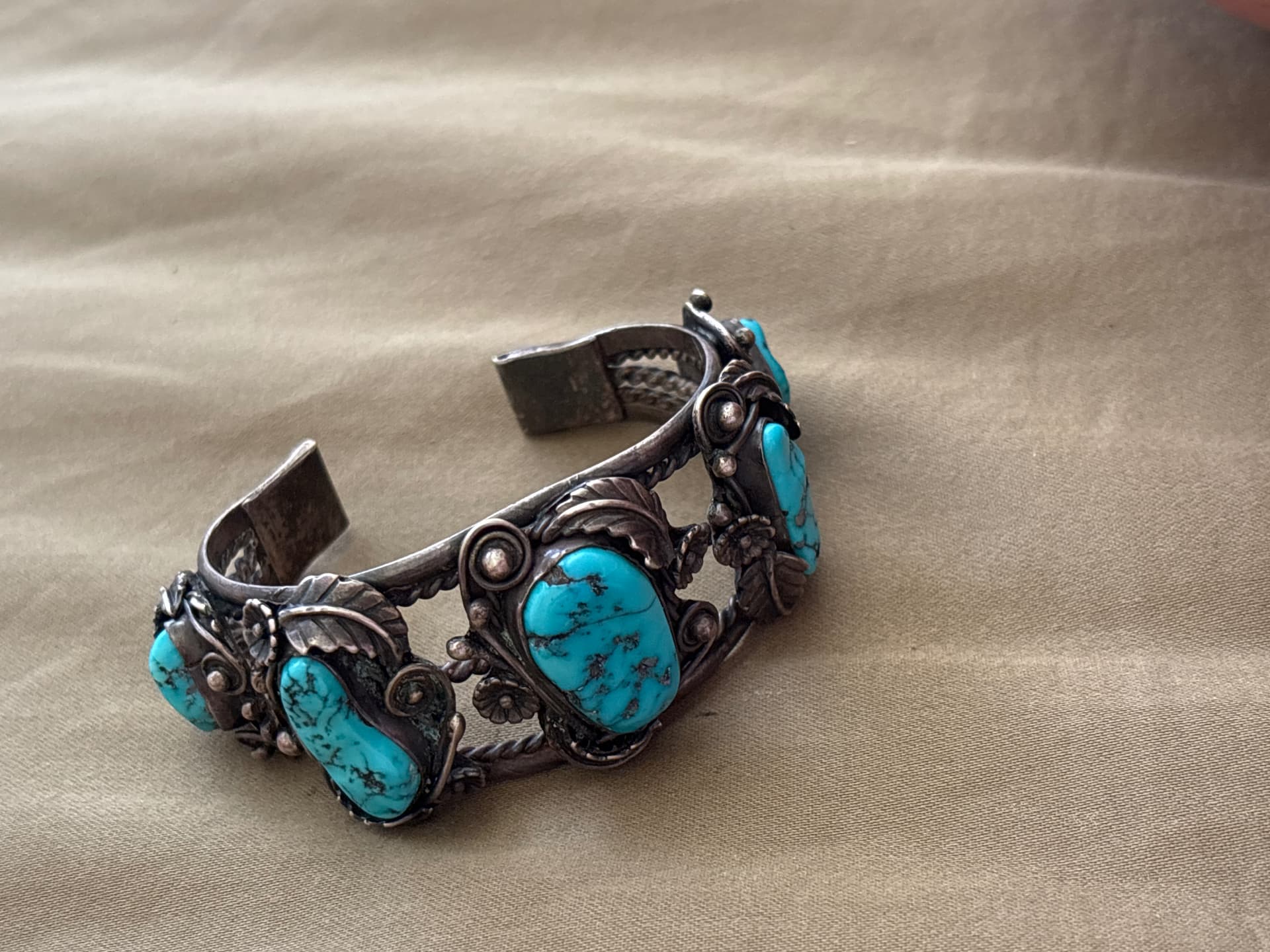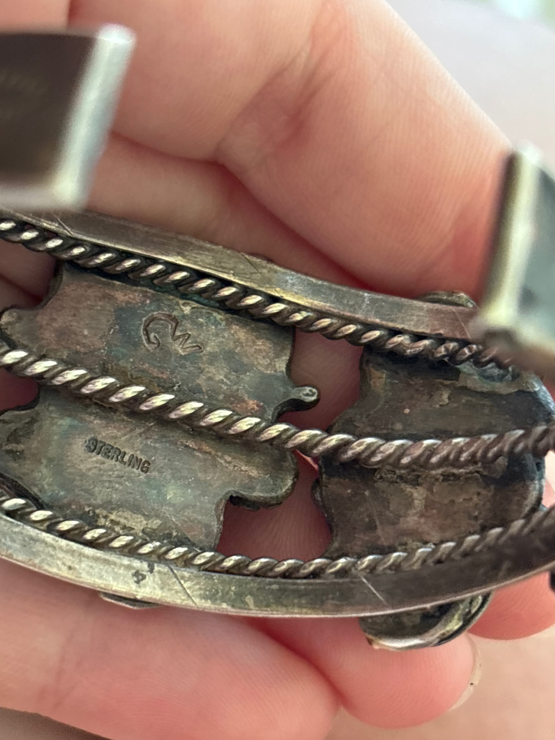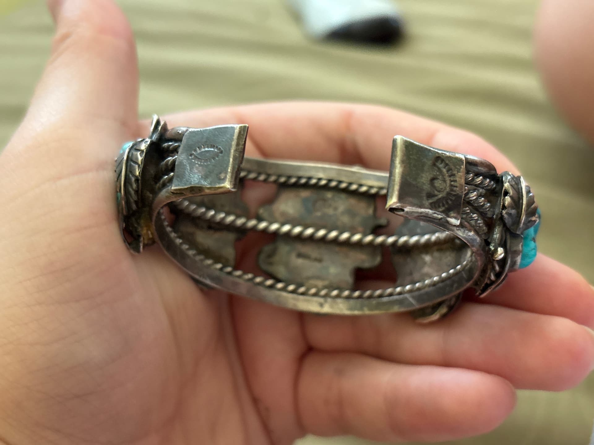 @mjurenaa Hi &Welcome. The symbol that you see is the cuff maker’s hallmark. The hallmark looks like “GW” to me. I checked my Bille Hougart’s book “Native American and Southwestern Silver Hallmarks”. There’s one GW listed and it’s for Glen Willie (Navajo). Unfortunately, there’s no photo of his hallmark. You may want to search for Navajo Glen Willie online to see if his style work is comparable to your cuff. Also, you may want to try Google Lens for help with identifying the hallmark on your turquoise cuff.