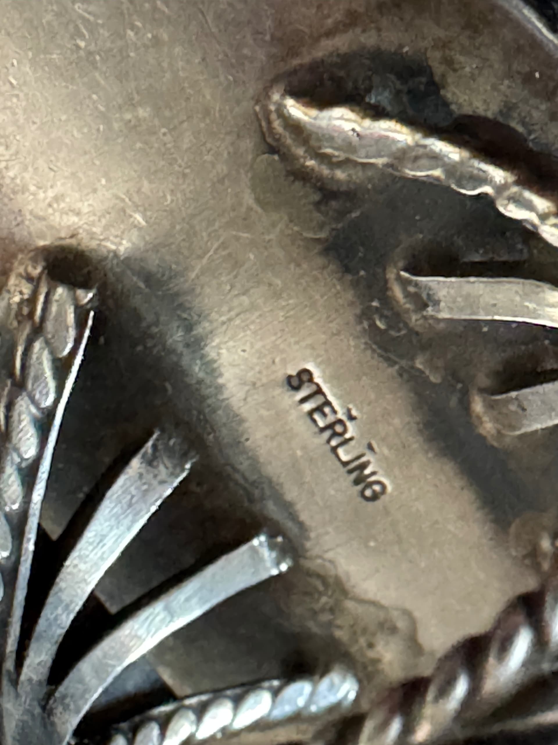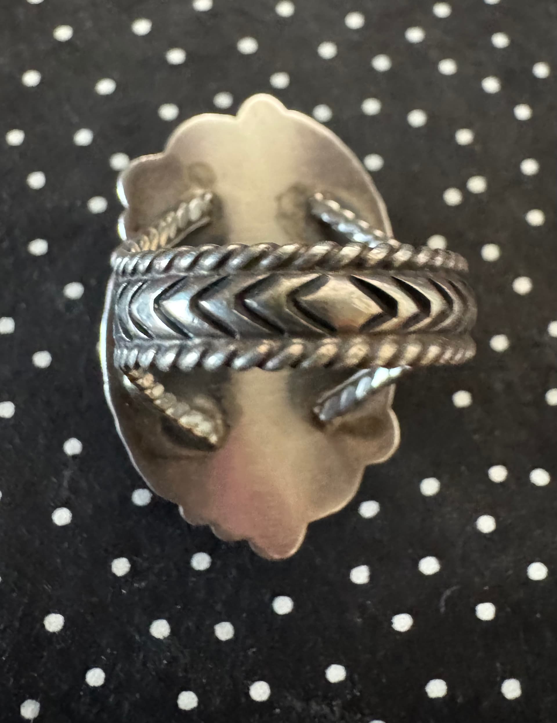I don’t really have a guess on the stone, but the silver work is lovely; and I’m especially loving the band. I can imagine that it does look good on, but then I like large chunky rings.