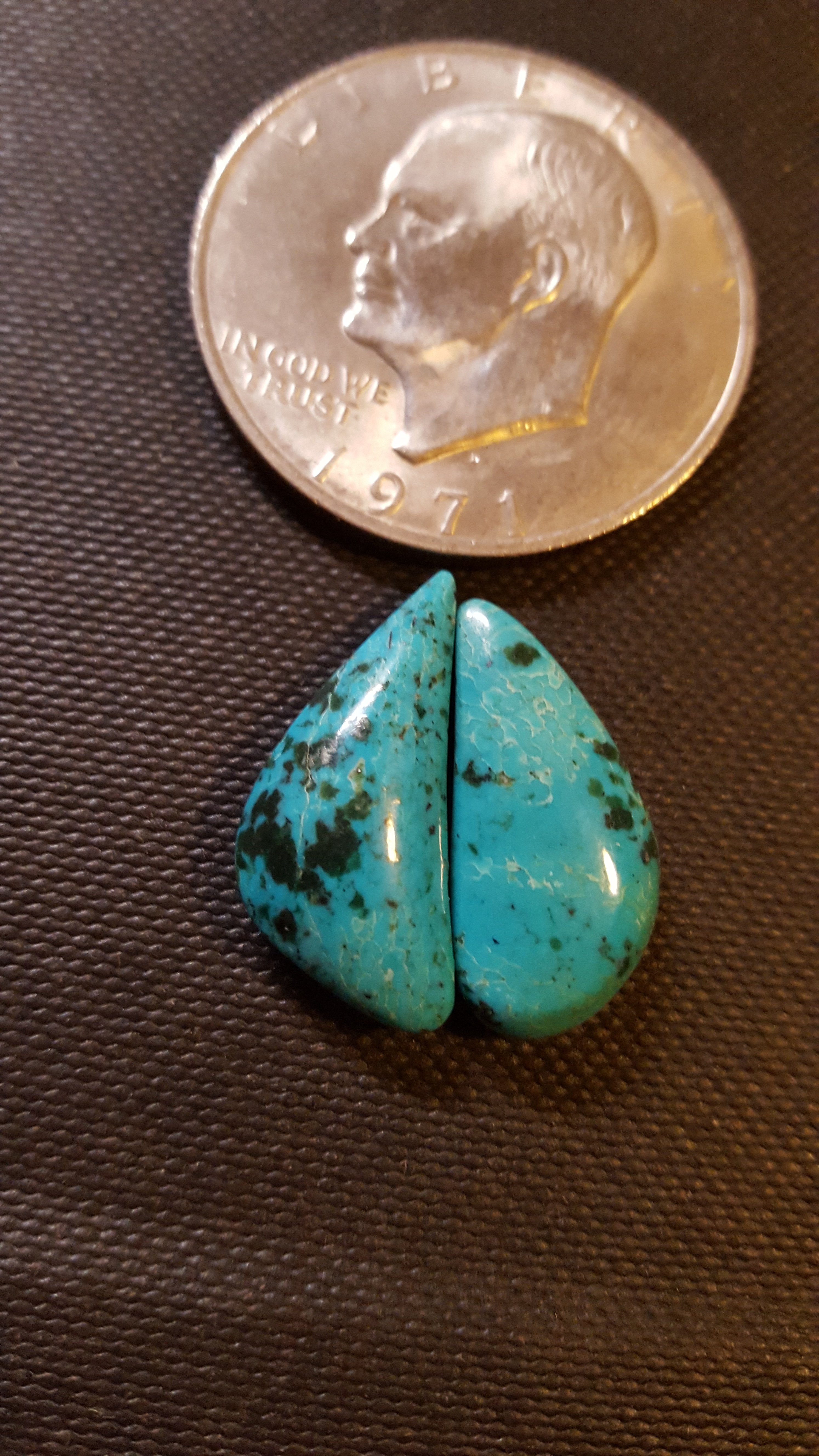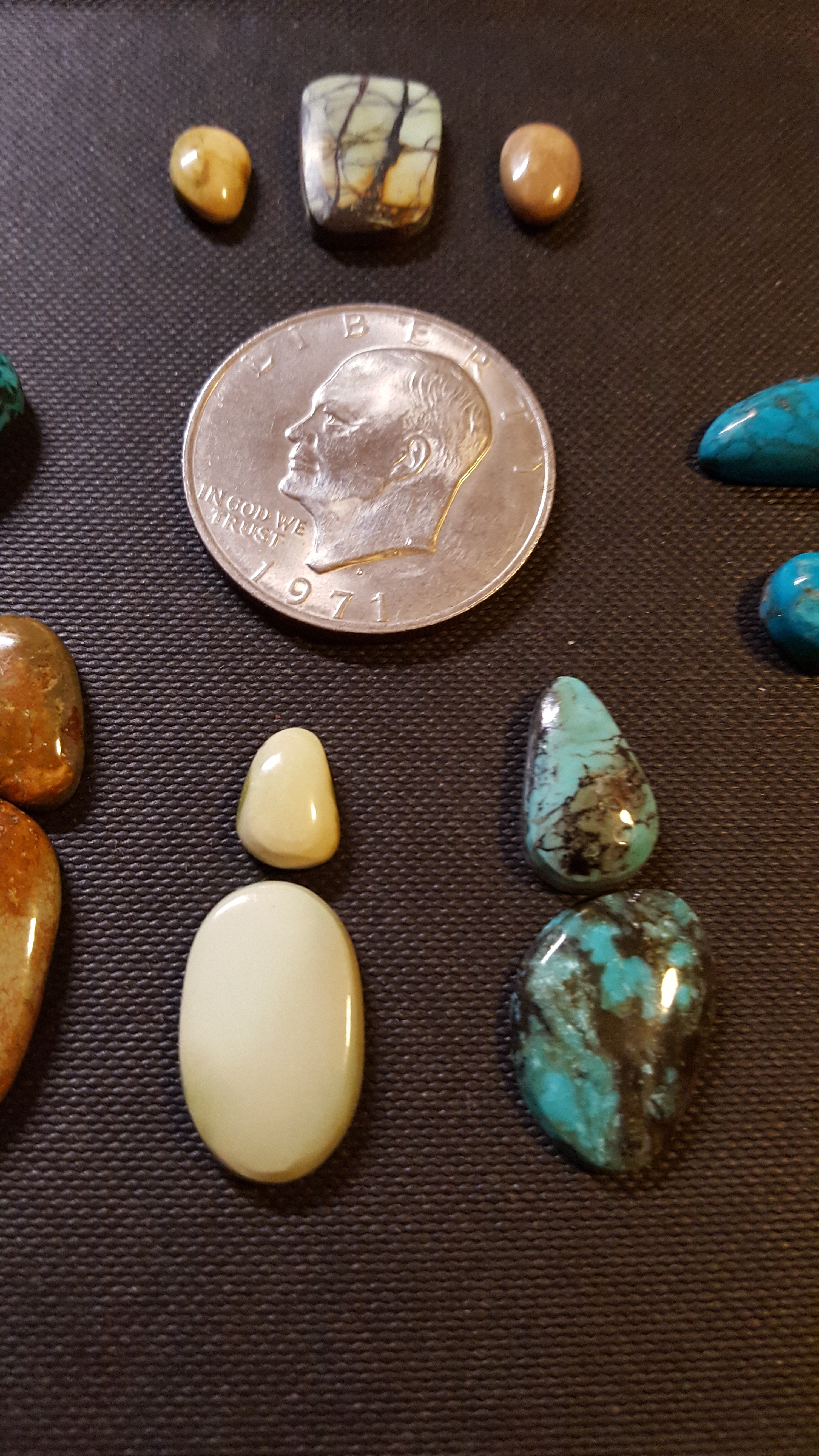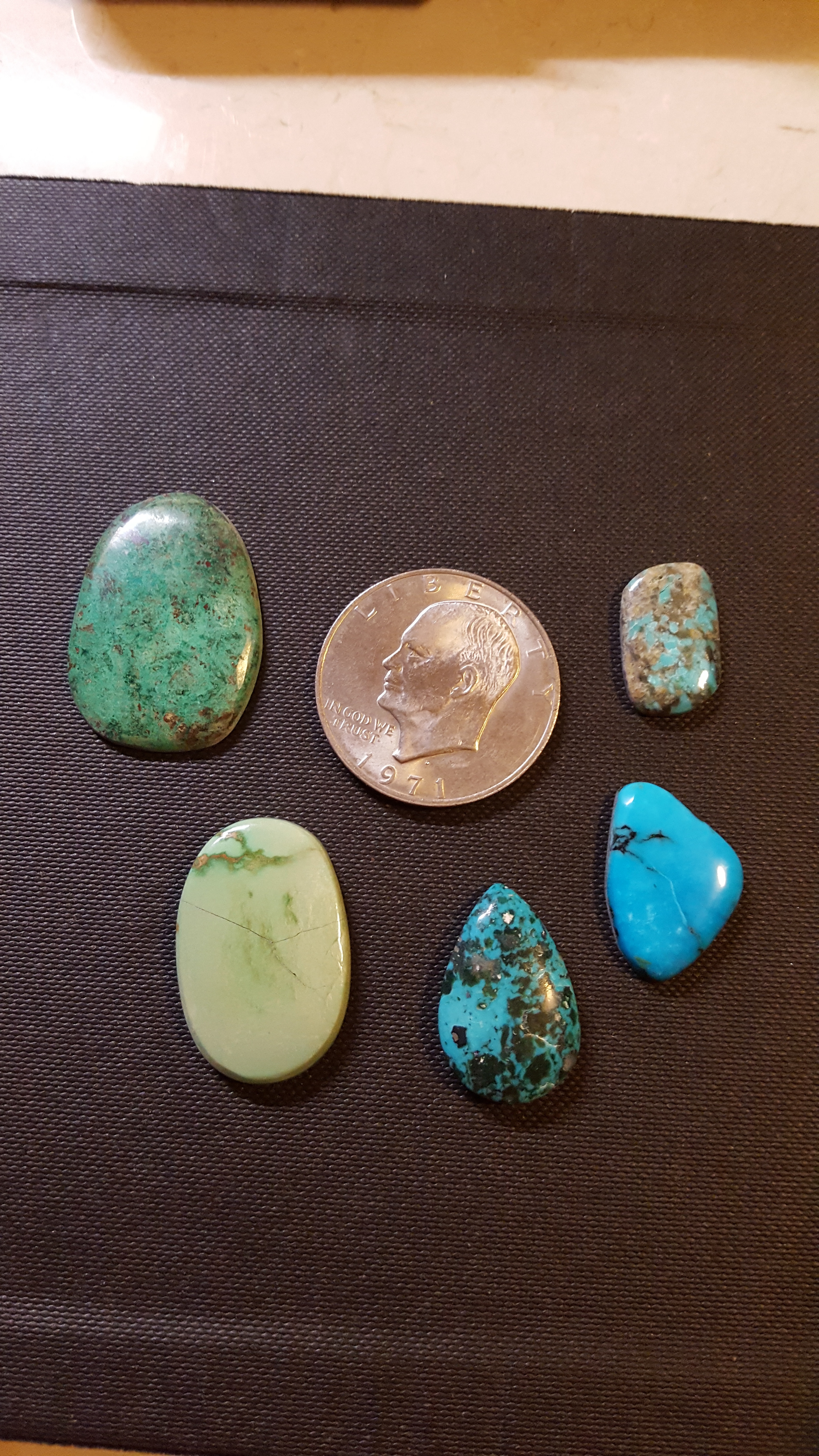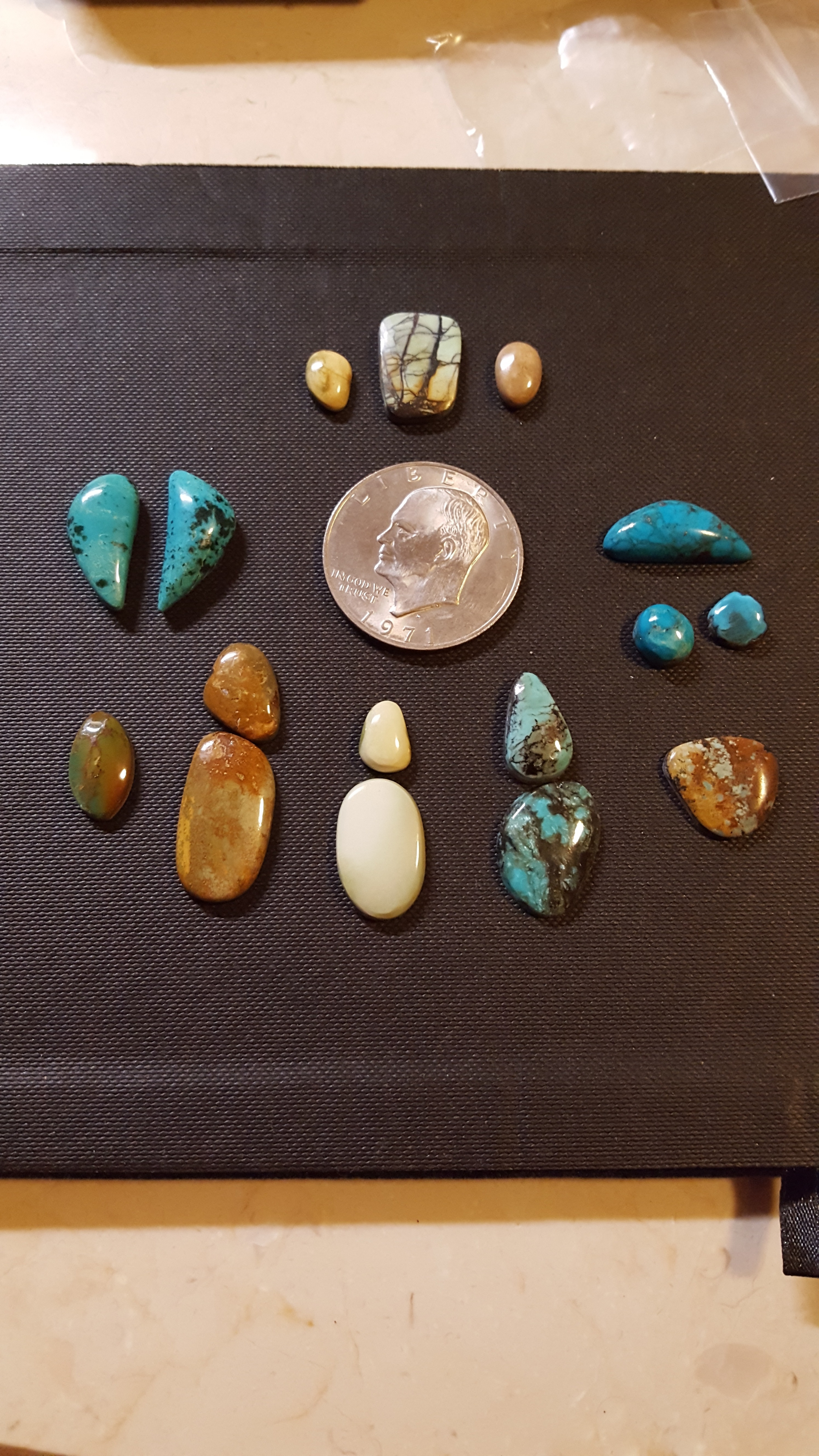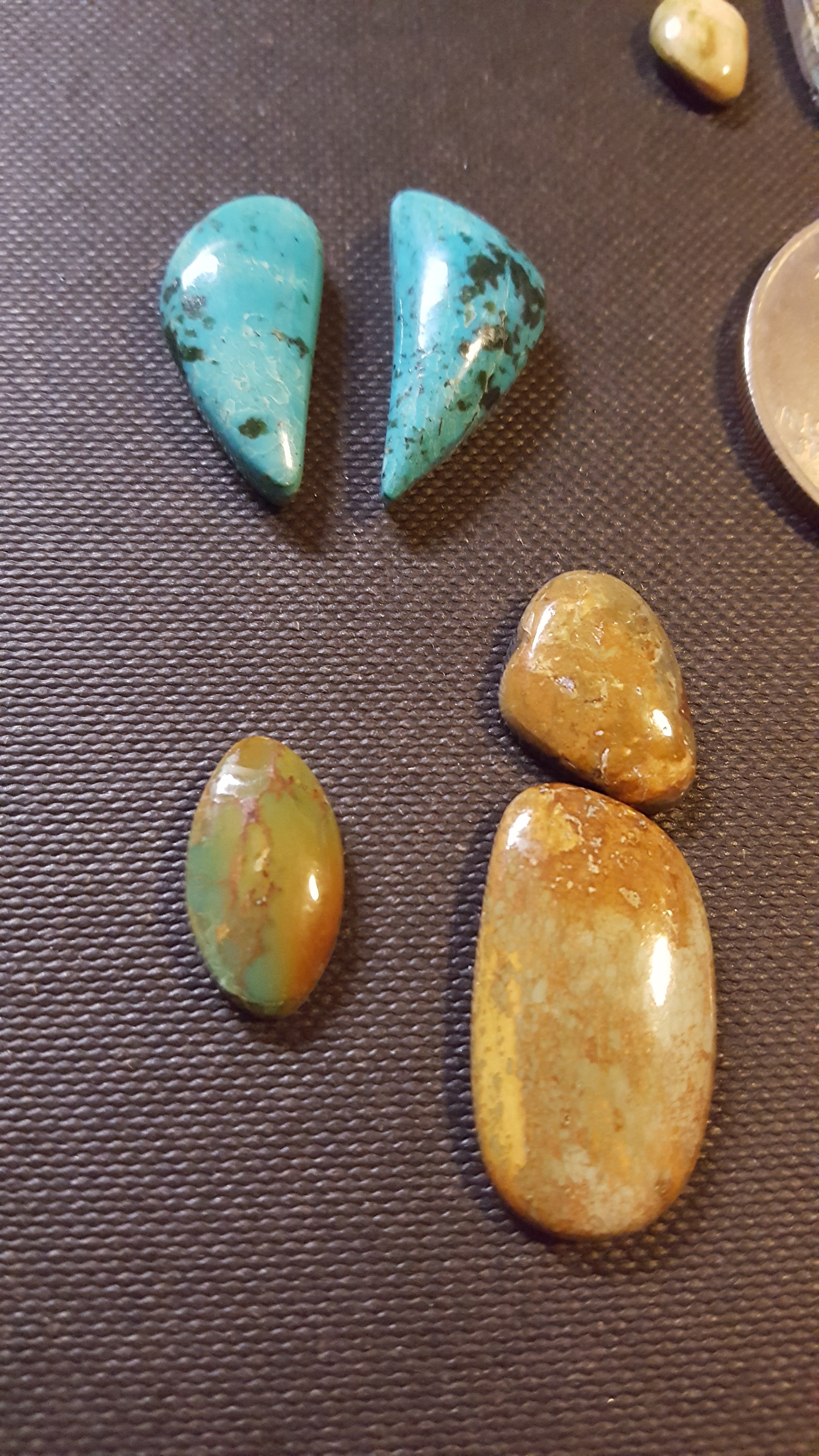 I would like to ask if you could take a picture of this cab in natural light outside for us and we could see the colors better and then maybe we could have a better answer to your questions. We would also love to see the rest of the pieces to! You can never see too much turquoise