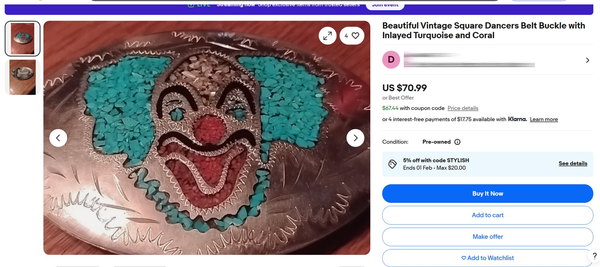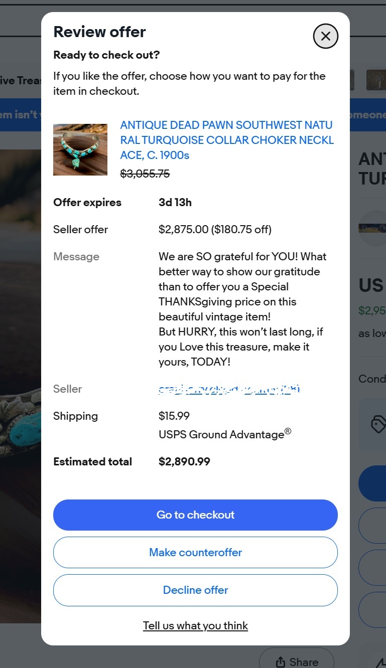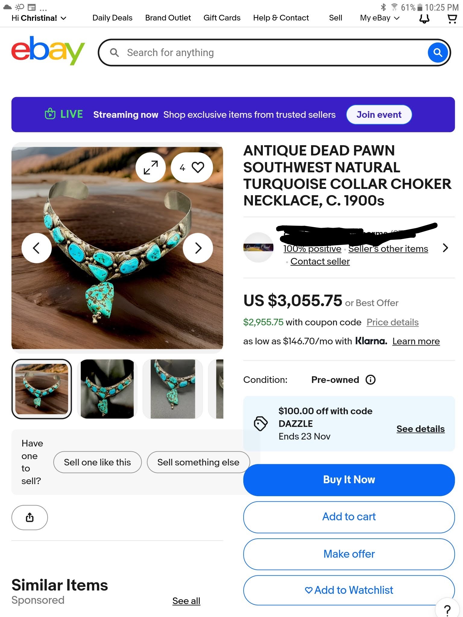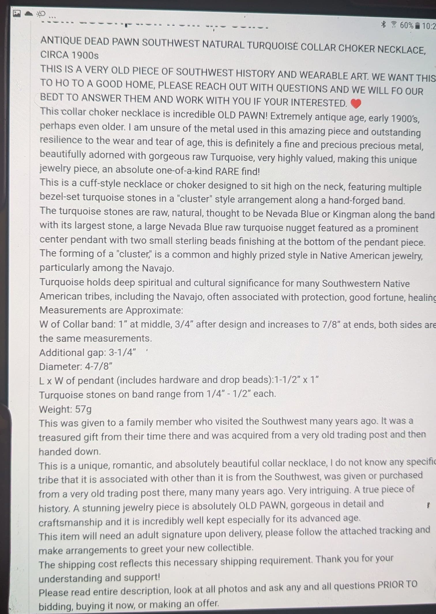 Just a tad overpriced for this supposed “antique”. Also love how it’s Navajo, but they don’t know what tribe to attribute it to. And of course they know what kind of turquoise it is!
