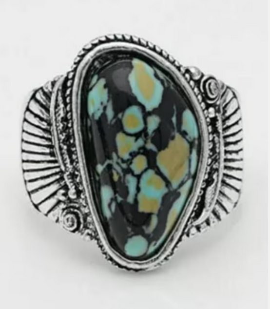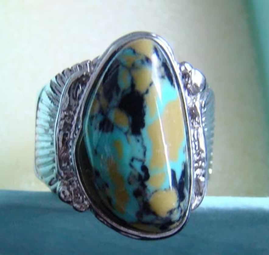 I am unsure of the metal used in this amazing piece and outstanding resilience to the wear and tear of age, this is definitely a fine and precious precious metal, beautifully adorned with gorgeous raw Turquoise, very highly valued, making this unique jewelry piece, an absolute one-of-a-kind RARE find!
