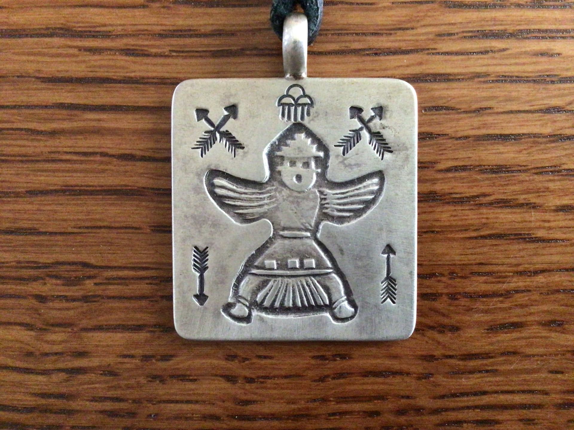Speaking of Harvey or Harvey era stamps, this is said to be an authentic Fred Harvey knifewing stamp obtained by Lyndon Tsosie (House of Stamps). Lyndon made a limited number of these Fred Harvey style pendants using the stamp. I think this stamp demonstrated the simplicity and minimal detail seen in Harvey stamps as stated by @mmrogers.