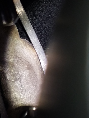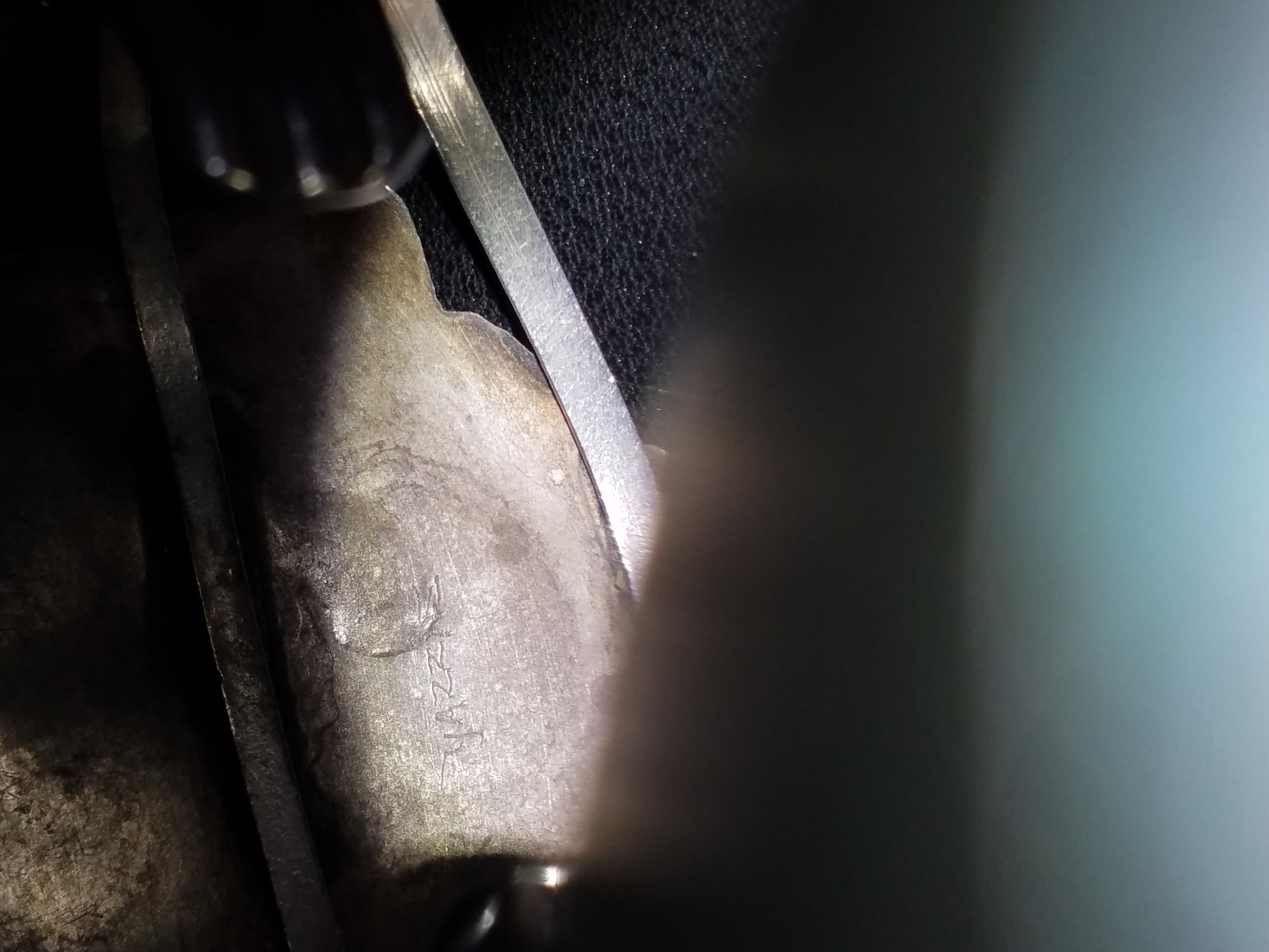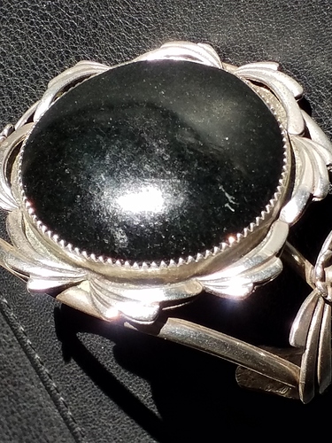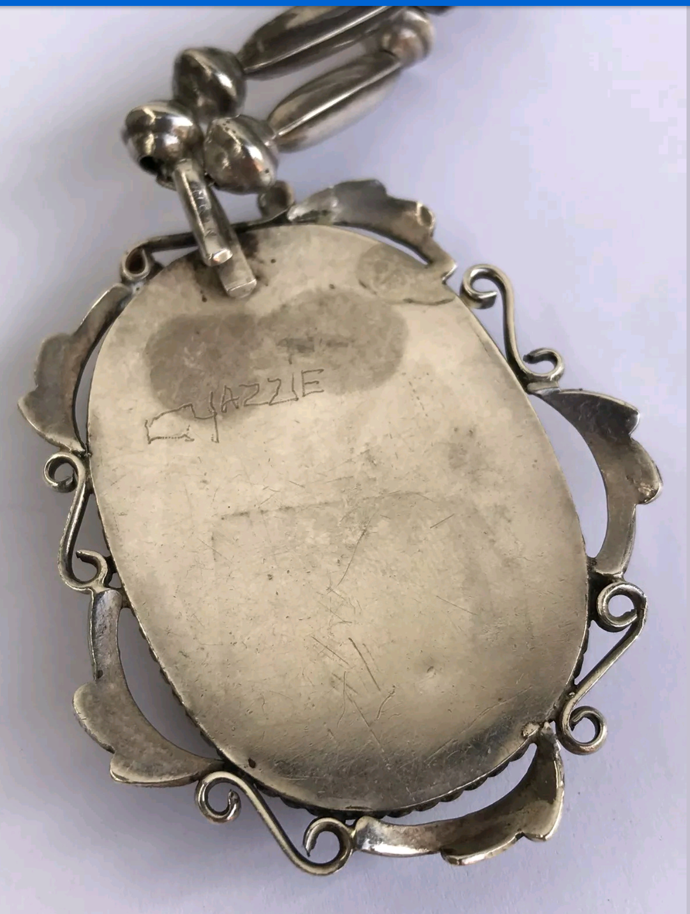 Hi there, I recently bought this old onyx cuff. I thought it was pretty. When I looked with my magnifying glass I noticed it has YAZZIE engraved on the back in teeny tiny letters. I held the 10x magnifier in front of the camera lens to take the attached photo. Also I don’t think the stone is onyx as it appears very dark greenish and sparkly in the sunlight. Any guesses as to who made it and what the stone is? I’ve looked at Artamerindien and Hallmarks of SW - nothing. Thanks