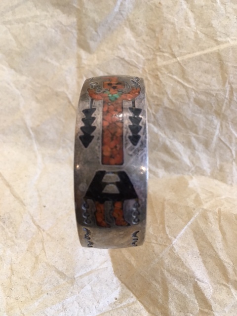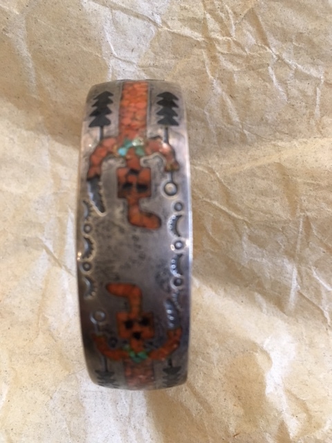 I couldn’t find anything on a WK hallmark. This style is referred to as chip inlay and was made popular during the 1970s by Tommy Singer. We use a polishing cloth here at the store, they can be ordered on Amazon. The figure is a Navajo Holy Person called a Yei’. If we had this bracelet is would sell around $120 - $150. Thank you for sharing.