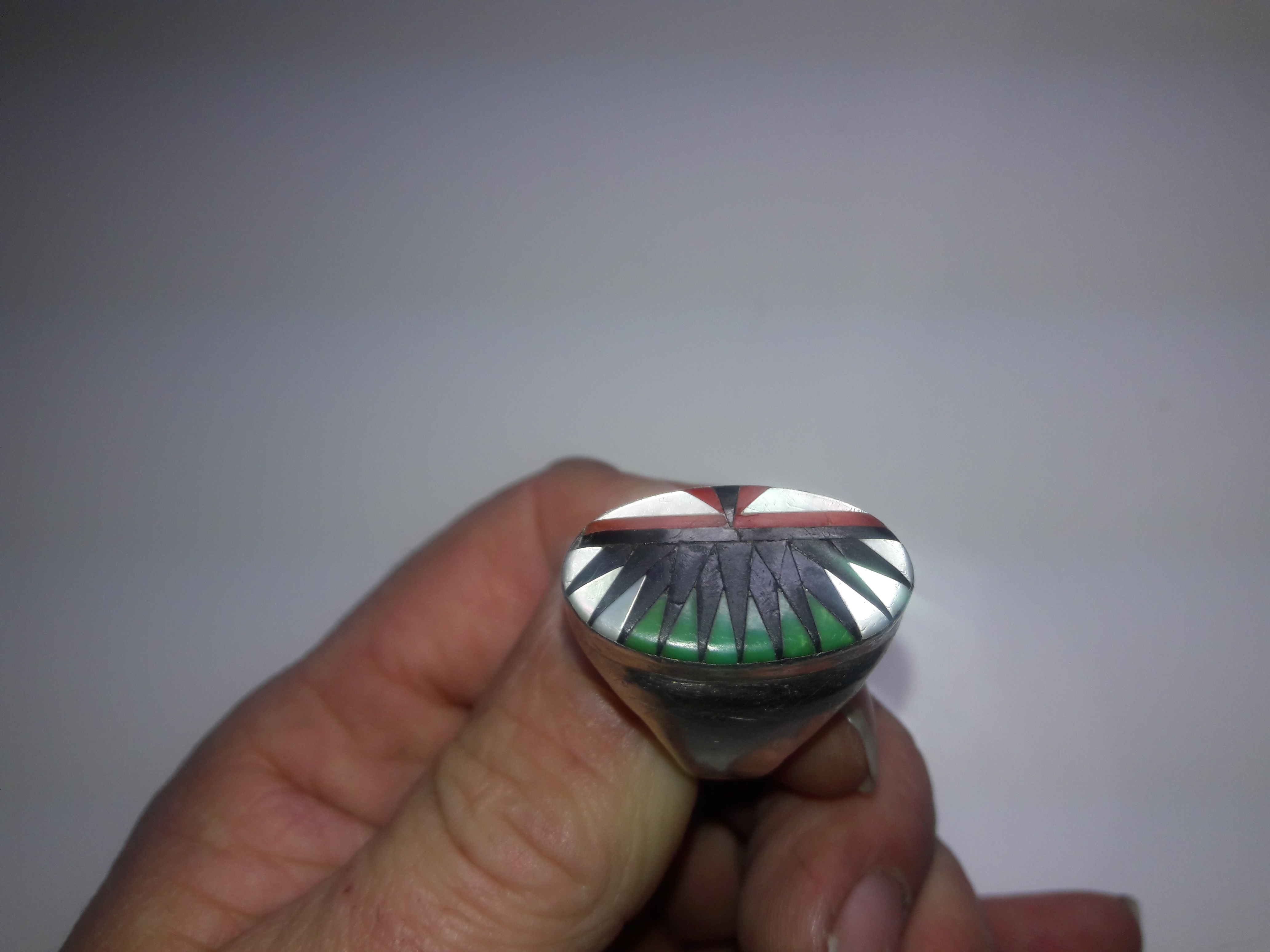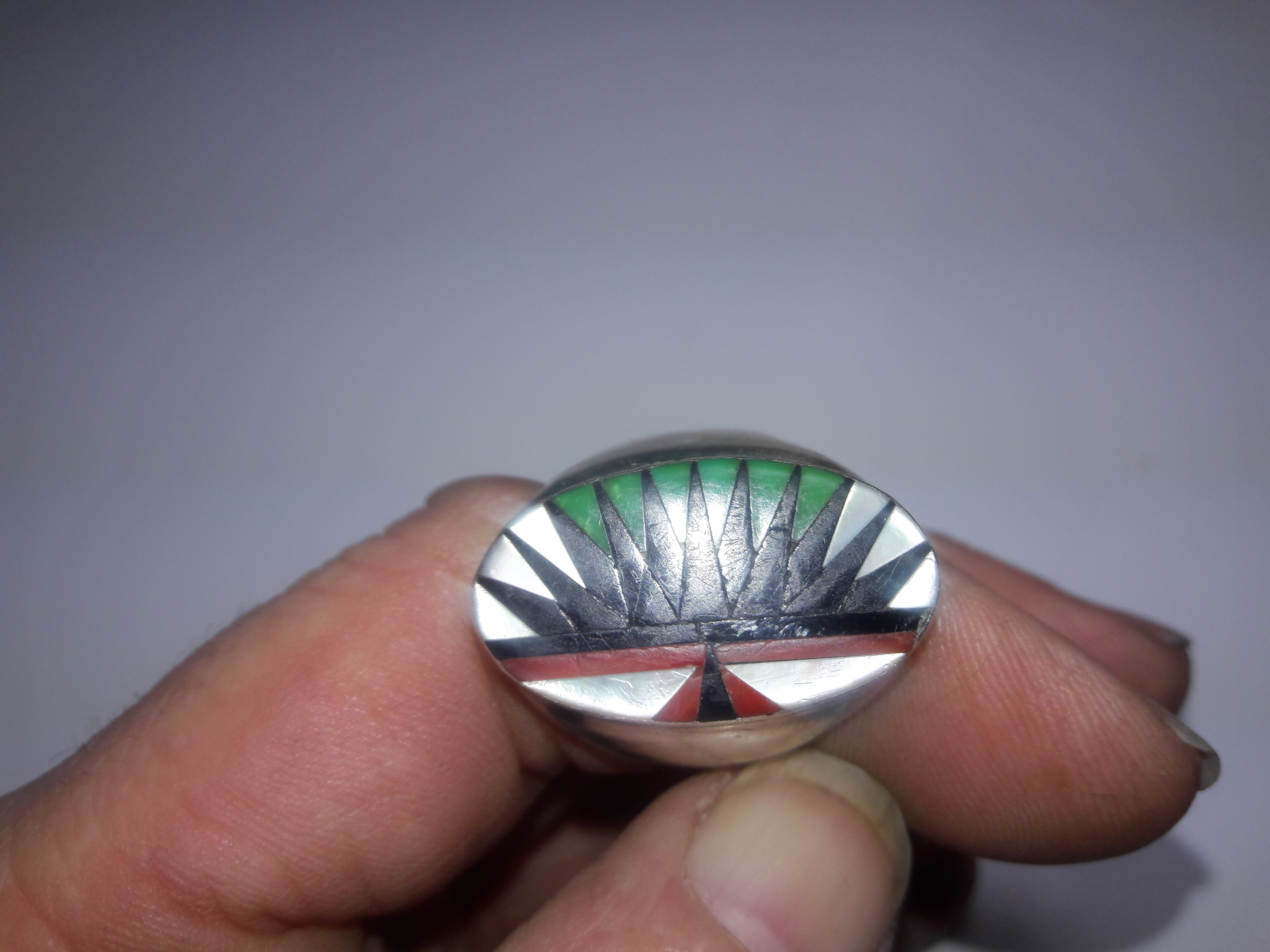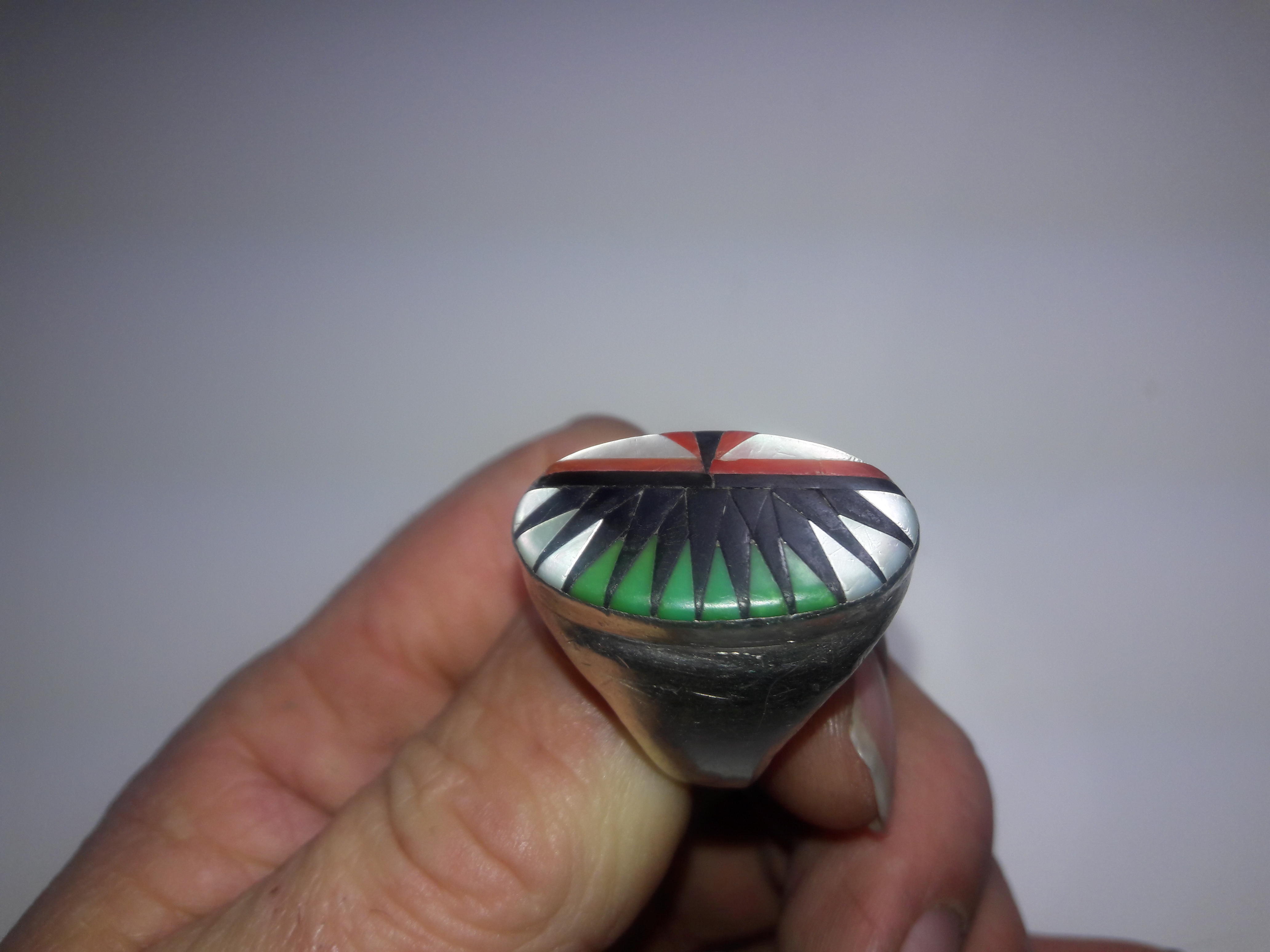 I really like this ring. It has no markings at all. I need to get a silver test kit. I am suspicious because there is no patina at all. But there are a lot of signs of wear and little nicks, you can tell it’s been worn quite a lot. Also the inlay is not as smooth as some that I have seen. It all fits together very well but it’s like they never did a final polish of the whole inlay. Anyone have any ideas or comments? It is a size 13 and I am out and about now and don’t have my scale so I cannot tell you how much it weighs it’s relatively heavy though and the whole inlay is very low in the bezel so it doesn’t catch on a lot of things like some of my other rings