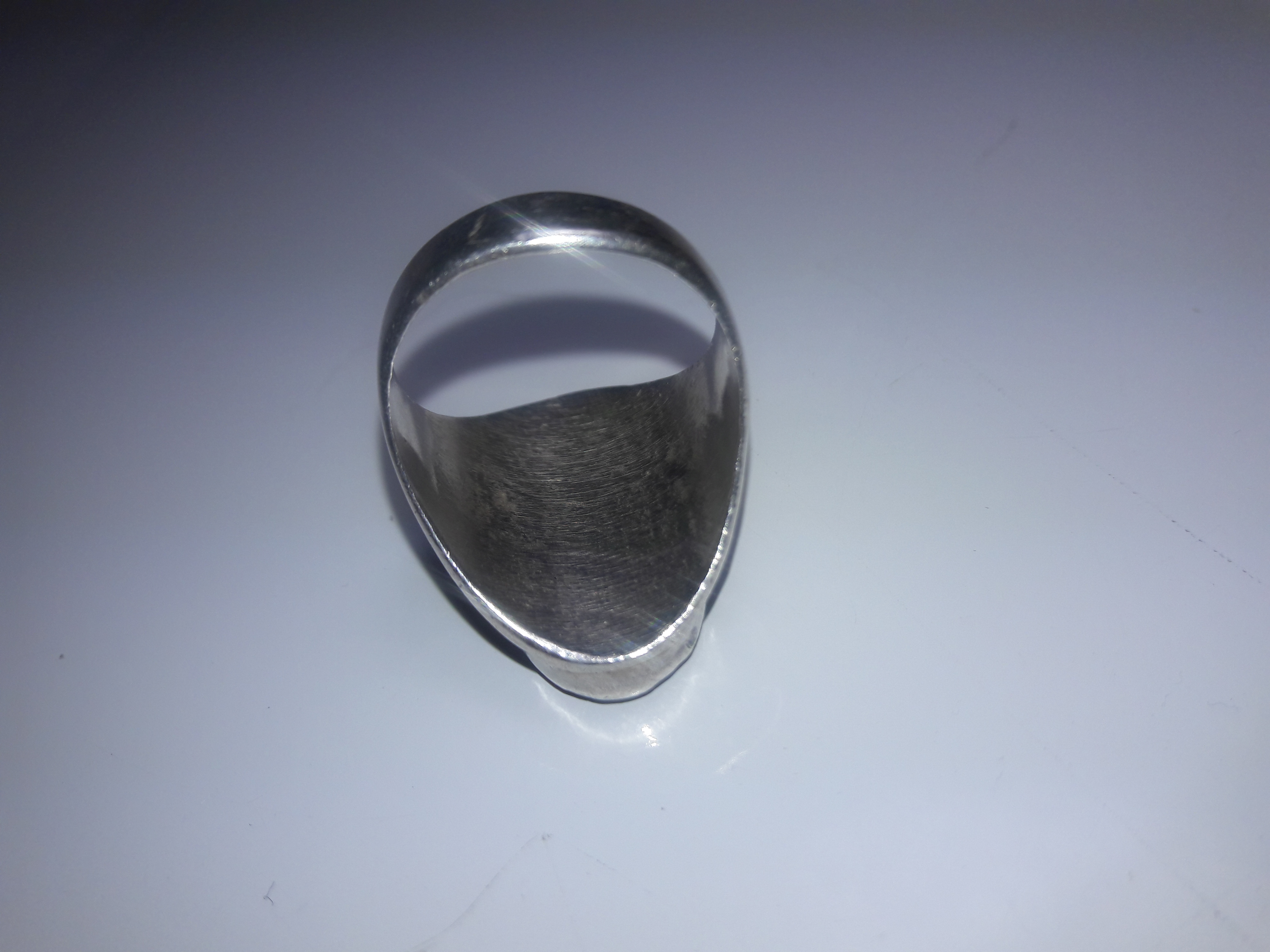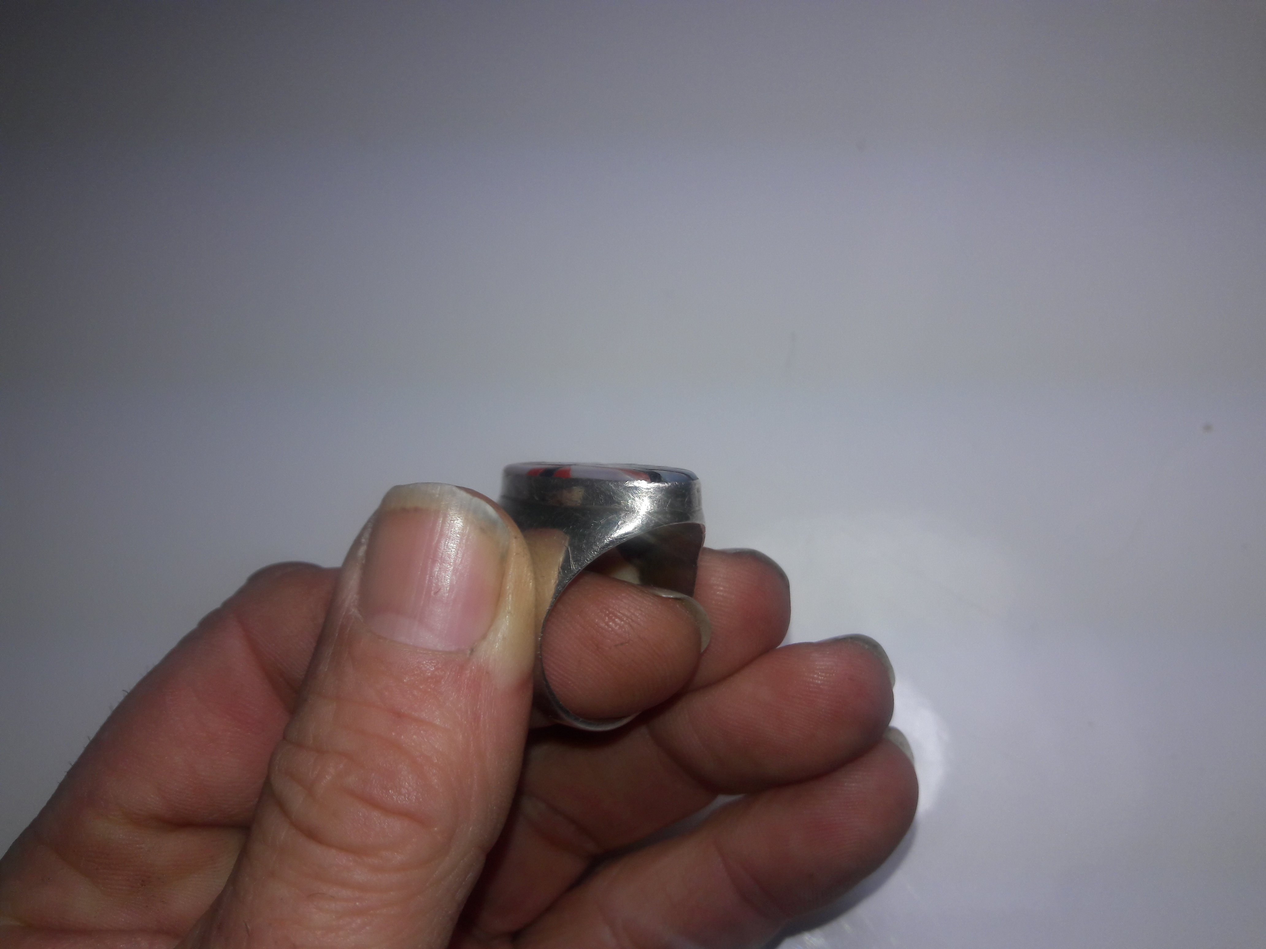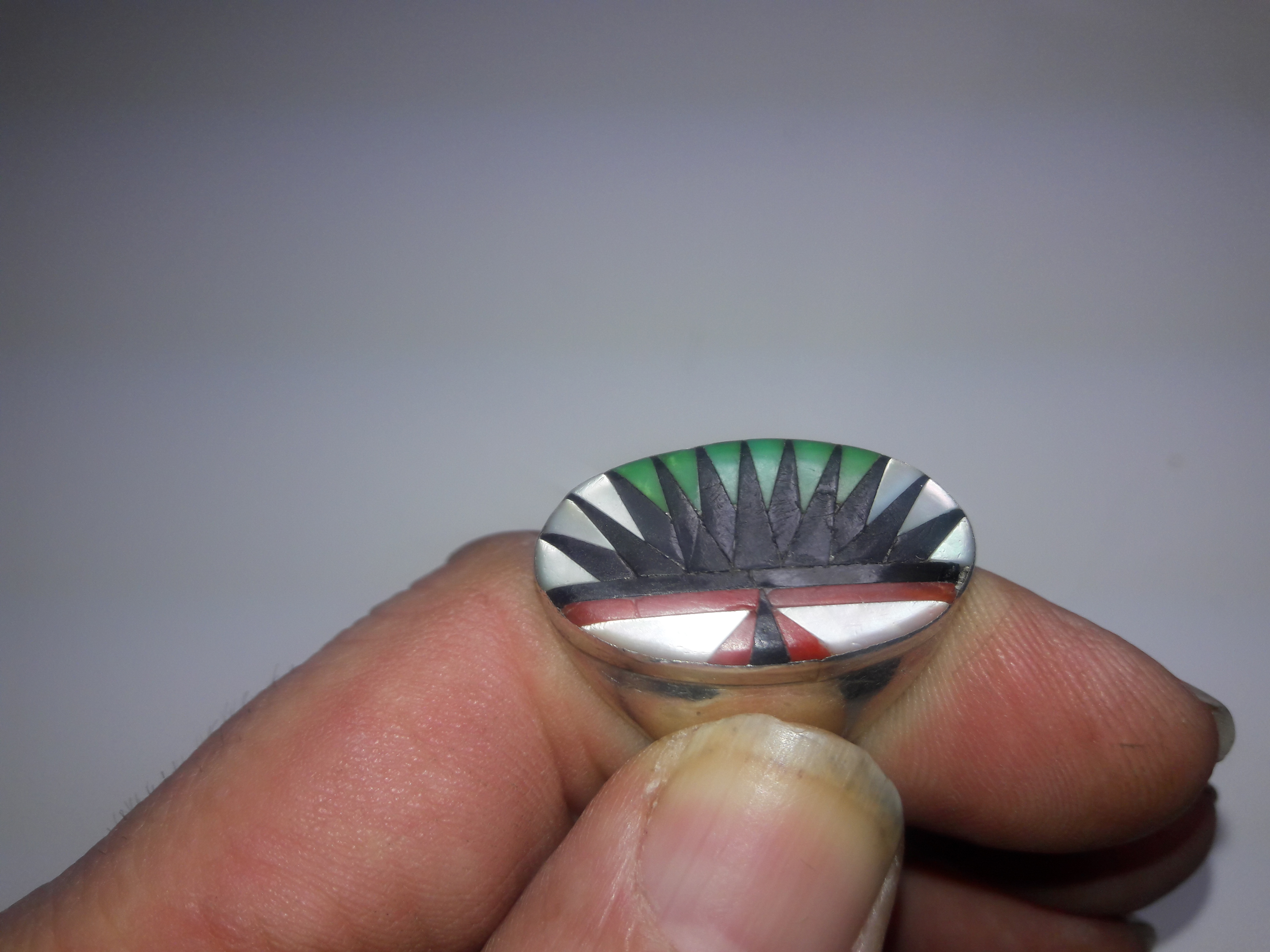 I really like this ring. It has no markings at all. I need to get a silver test kit. I am suspicious because there is no patina at all. But there are a lot of signs of wear and little nicks, you can tell it’s been worn quite a lot. Also the inlay is not as smooth as some that I have seen. It all fits together very well but it’s like they never did a final polish of the whole inlay. Anyone have any ideas or comments? It is a size 13 and I am out and about now and don’t have my scale so I cannot tell you how much it weighs it’s relatively heavy though and the whole inlay is very low in the bezel so it doesn’t catch on a lot of things like some of my other rings