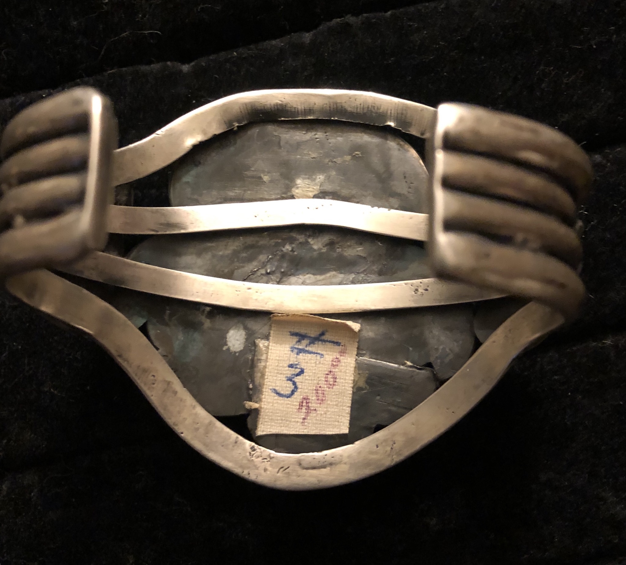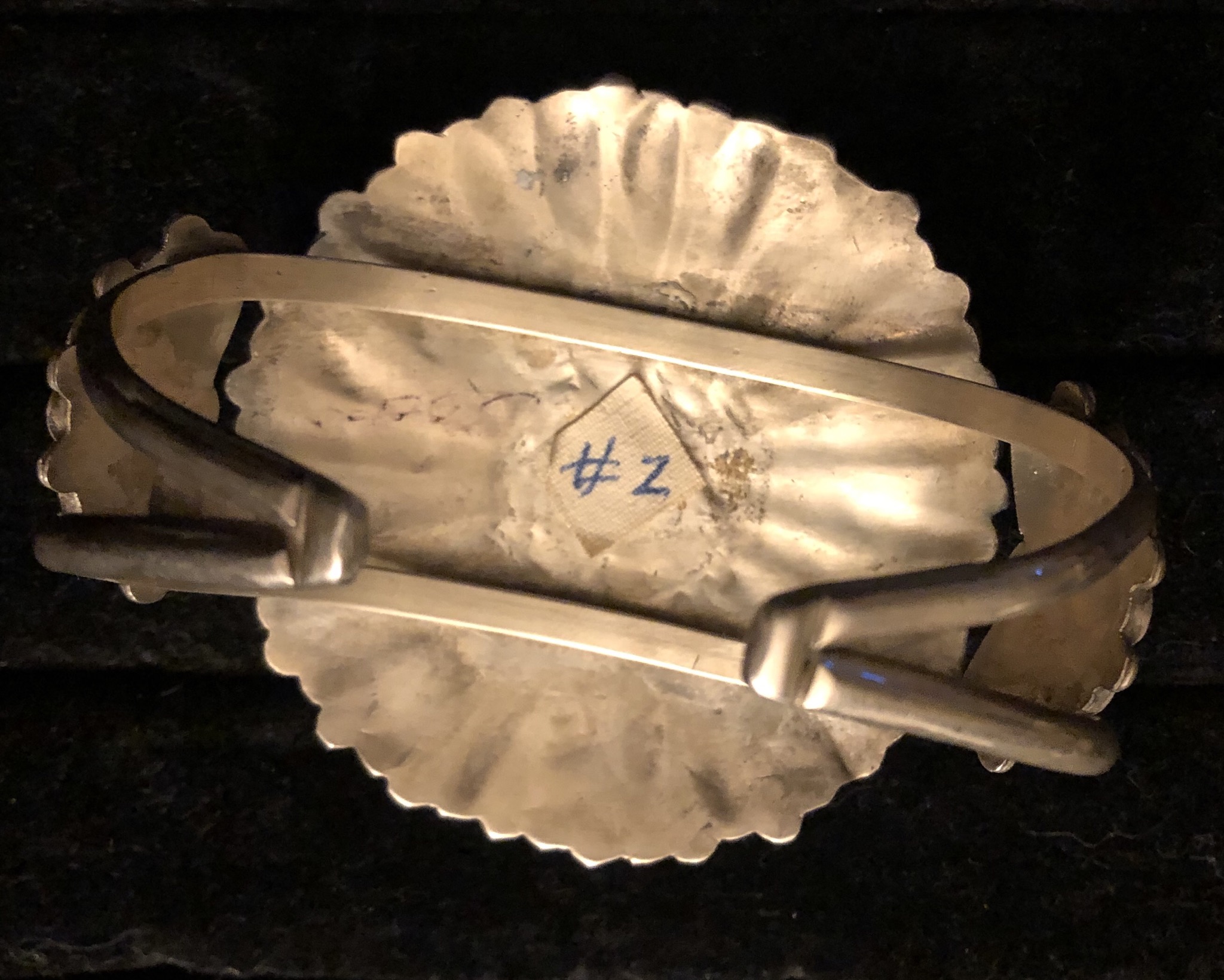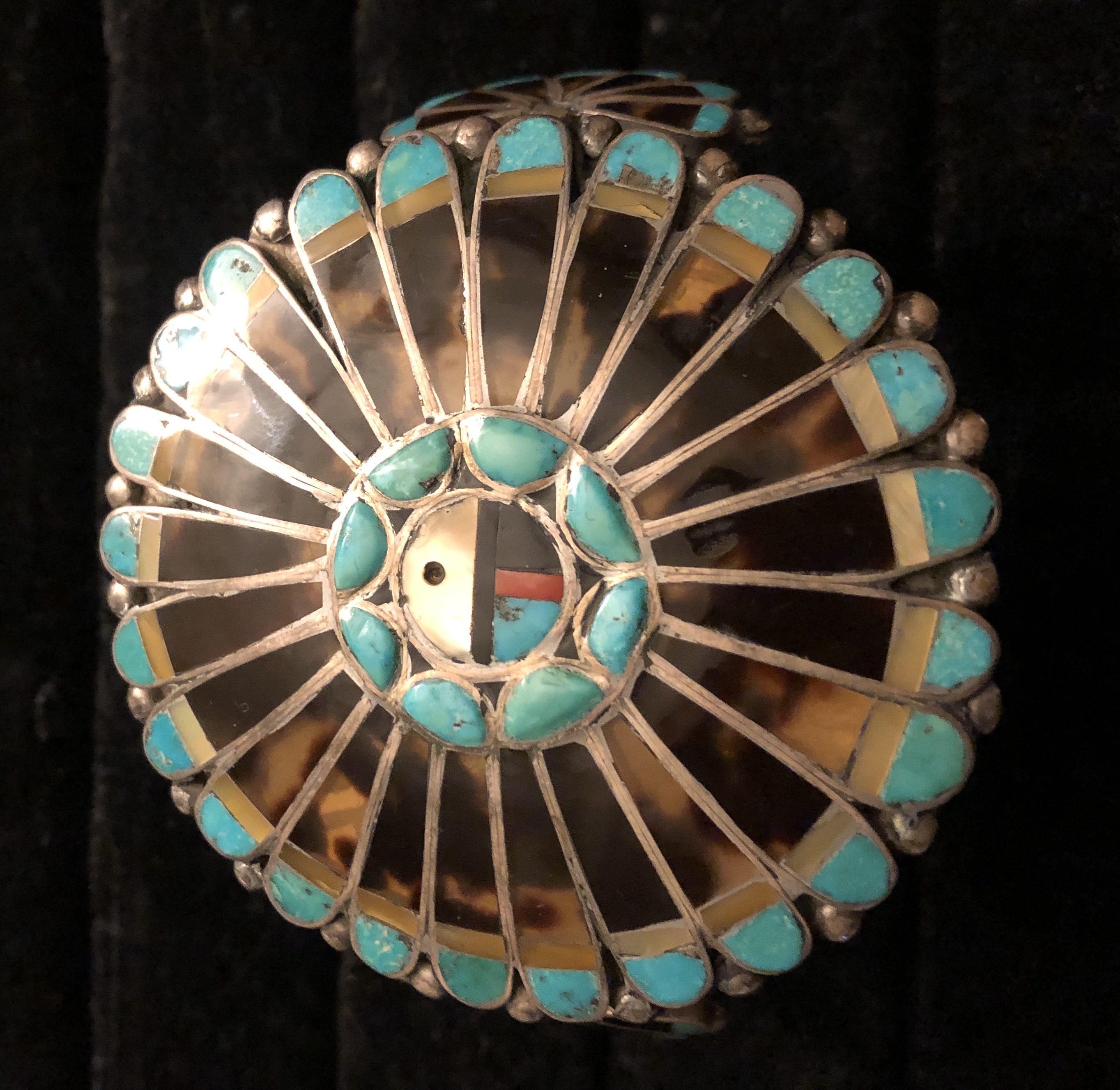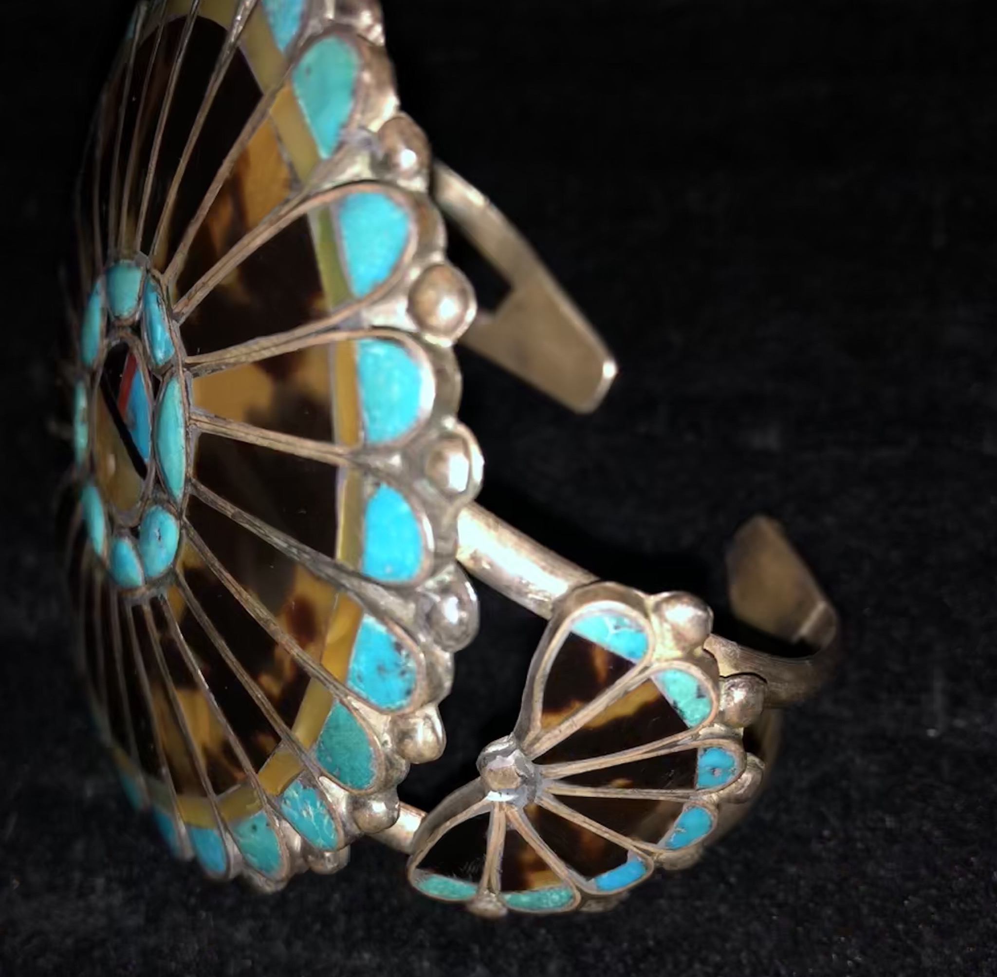 Zuni Sun cuff 74 grams. 3in across center, 3 1/2 cuff w/ 1 inch gap