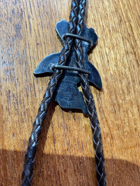 The bolo has a resemblance to the Hopi Bird bolo style of Frank Vacit, 1940s-1960s. It would be normal for it not to be signed, and those etched letters would be a trader’s price code. The sunface makes me thing of JD Massie’s work, but I’m not certain.